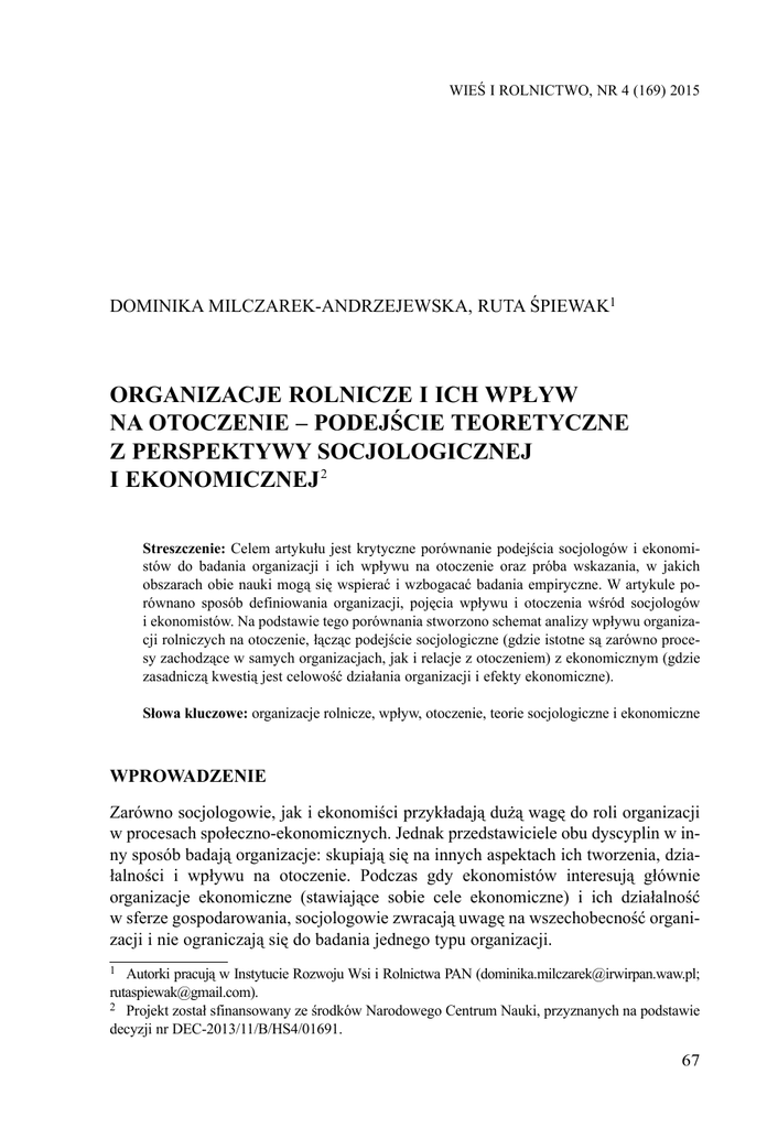 WIEŚ I ROLNICTWO, NR 4 (169) 2015 DOMINIKA MILCZAREK-ANDRZEJEWSKA, RUTA ŚPIEWAK1 ORGANIZACJE ROLNICZE I ICH WPŁYW NA OTOCZENIE – PODEJŚCIE TEORETYCZNE Z PERSPEKTYWY SOCJOLOGICZNEJ I EKONOMICZNEJ 2 Streszczenie: Celem artykułu jest krytyczne porównanie podejścia socjologów i ekonomistów do badania organizacji i ich wpływu na otoczenie oraz próba wskazania, w jakich obszarach obie nauki mogą się wspierać i wzbogacać badania empiryczne. W artykule porównano sposób definiowania organizacji, pojęcia wpływu i otoczenia wśród socjologów i ekonomistów. Na podstawie tego porównania stworzono schemat analizy wpływu organizacji rolniczych na otoczenie, łącząc podejście socjologiczne (gdzie istotne są zarówno procesy zachodzące w samych organizacjach, jak i relacje z otoczeniem) z ekonomicznym (gdzie zasadniczą kwestią jest celowość działania organizacji i efekty ekonomiczne). Słowa kluczowe: organizacje rolnicze, wpływ, otoczenie, teorie socjologiczne i ekonomiczne WPROWADZENIE Zarówno socjologowie, jak i ekonomiści przykładają dużą wagę do roli organizacji w procesach społeczno-ekonomicznych. Jednak przedstawiciele obu dyscyplin w inny sposób badają organizacje: skupiają się na innych aspektach ich tworzenia, działalności i wpływu na otoczenie. Podczas gdy ekonomistów interesują głównie organizacje ekonomiczne (stawiające sobie cele ekonomiczne) i ich działalność w sferze gospodarowania, socjologowie zwracają uwagę na wszechobecność organizacji i nie ograniczają się do badania jednego typu organizacji. 1 Autorki pracują w Instytucie Rozwoju Wsi i Rolnictwa PAN ([email protected]; [email protected]). 2 Projekt został sfinansowany ze środków Narodowego Centrum Nauki, przyznanych na podstawie decyzji nr DEC-2013/11/B/HS4/01691. 67 Przykładem organizacji, które żywo interesują przedstawicieli obu nauk, są organizacje rolnicze. Socjologowie i ekonomiści zgadzają się, że odgrywają one ważną rolę w przemianach wsi i rolnictwa w Polsce [np. Halamska 2008; Michna 2010]. A ich aktywność i efekty działania są tematem często poruszanym w literaturze światowej [np. Pappi i Henning 1999]. Celem artykułu jest krytyczne porównanie podejścia socjologów i ekonomistów do badania organizacji i ich wpływu na otoczenie oraz próba wskazania, w jakim zakresie obie nauki mogą się wspierać i wzbogacać badania empiryczne. W pierwszej części artykułu przedstawione zostały definicje organizacji używane w socjologii i w ekonomii. W drugiej przedstawiono wybrane podejścia do analizy wpływu organizacji na otoczenie. Trzecia została poświęcona wskazaniu wspólnych dla socjologii i ekonomii obszarów badania organizacji rolniczych. Czwarta część zawiera podsumowanie. POJĘCIE ORGANIZACJI W SOCJOLOGII I EKONOMII Pierwszą kwestią, jaka odróżnia podejście socjologów i ekonomistów jest definicja organizacji. W socjologii zdefiniowanie samego pojęcia, czym jest organizacja, nie jest proste i budzi liczne kontrowersje. Niektórzy socjologowie, jak na przykład Michael J. Handel [2003], podkreślają, że trudności w zdefiniowaniu organizacji jako społecznego fenomenu wynikają z samej natury organizacji. Łatwiej więc wskazać uniwersalne cechy konstytutywne organizacji. Mają one charakter: celowy – organizacje określają pewne zadania służące realizacji określonych celów; społeczny – organizacje tworzą ludzie, którzy wchodzą ze sobą w sformalizowane i nieformalne relacje; ekonomiczny – organizacje pozyskują z otoczenia środki, które pozwalają im realizować swoje cele; strukturalny – organizacje opierają się często na nieformalnej umowie społecznej, na zwyczaju, prawie, a zachowania członków – zarówno te formalne, jak i nieformalne – regulują wartości, normy i zasady; identyfikacji – organizacje są wyodrębnione z otoczenia, a jej członkowie w pewien sposób się z nią identyfikują [Łucewicz 1999; Koźmiński i Latusek-Jurczak 2011]. Sposób definiowania organizacji w socjologii zależy w dużej mierze od tego, do jakiego paradygmatu odwołuje się badacz. Przez dłuższy czas najbardziej powszechna w socjologii była definicja organizacji odwołująca się do teorii funkcjonalnej3. Zgodnie z tym podejściem organizacja w sensie socjologicznym jest to celowa i wtórna grupa społeczna o charakterze zrzeszenia, relatywnie wyodrębniona z otoczenia zewnętrznego, charakteryzująca się przewagą formalnie uporządkowanych stosunków wewnętrznych, która osiąga cele i utrzymuje równowagę wewnętrzną przy pomocy takich środków społecznej regulacji zachowań uczestników organizacji, 3 Według teorii funkcjonalnej społeczeństwo postrzegane jest jako system wzajemnie powiązanych ze sobą elementów kulturowych, pełniących funkcje na rzecz całości. 68 jak: wzory zachowania, wzory osobowe, role organizacyjne, normy grupowe, instytucje, kontrola społeczna i inne [Morawski 1976, s. 18]. Mówiąc o organizacji mamy więc do czynienia nie tylko z ludźmi, lecz także z szeroką gamą różnych środków, które przyczyniają się do integralności i równowagi tej instytucji. Organizacja łączy ludzi dla osiągnięcia pewnych celów, co oznacza, że cechą organizacji jest współpraca, koordynacja, komunikacja i uczestnictwo w niej dla osiągnięcia pewnych korzyści. Nie muszą być one, jak podkreśla Anthony Giddens [2006], wyłącznie materialne, ale także w postaci kontaktów, zwiększania własnych możliwości i poszerzania pola wpływu. Obecnie socjologowie akcentują często kwestie wskazywane w teoriach interakcjonistycznych4. Jest to widoczne m.in. w podejściu procesualnym, w którym zaznacza się, że organizacje cały czas stają się, są tworzone i podtrzymywane w codziennych działaniach uczestników interakcji [Konecki 2007]. Zatem w socjologii można rozumieć pojęcie organizacji dwojako: w znaczeniu rezultatowym – jako całość będąc