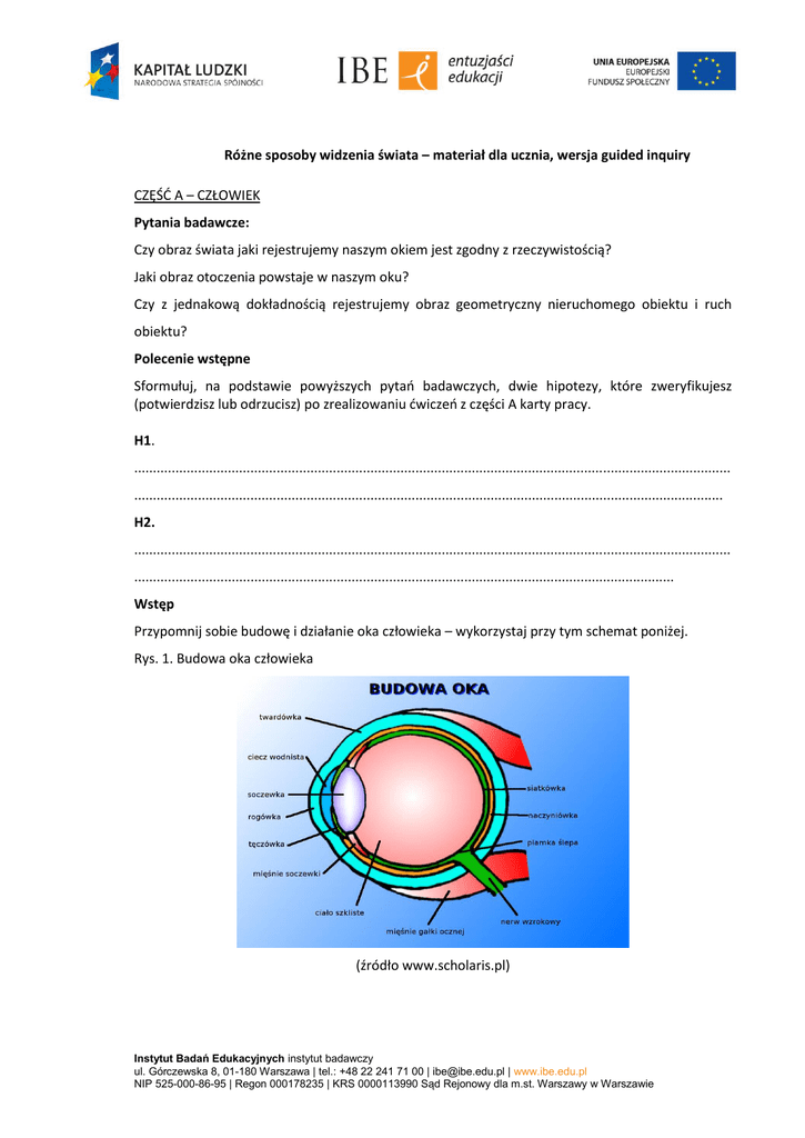 Różne sposoby widzenia świata – materiał dla ucznia, wersja guided inquiry CZĘŚĆ A – CZŁOWIEK Pytania badawcze: Czy obraz świata jaki rejestrujemy naszym okiem jest zgodny z rzeczywistością? Jaki obraz otoczenia powstaje w naszym oku? Czy z jednakową dokładnością rejestrujemy obraz geometryczny nieruchomego obiektu i ruch obiektu? Polecenie wstępne Sformułuj, na podstawie powyższych pytań badawczych, dwie hipotezy, które zweryfikujesz (potwierdzisz lub odrzucisz) po zrealizowaniu ćwiczeń z części A karty pracy. H1. ............................................................................................................................................................... ............................................................................................................................................................. H2. ............................................................................................................................................................... ................................................................................................................................................ Wstęp Przypomnij sobie budowę i działanie oka człowieka – wykorzystaj przy tym schemat poniżej. Rys. 1. Budowa oka człowieka (źródło www.scholaris.pl) Instytut Badań Edukacyjnych instytut badawczy ul. Górczewska 8, 01-180 Warszawa | tel.: +48 22 241 71 00 | [email protected] | www.ibe.edu.pl NIP 525-000-86-95 | Regon 000178235 | KRS 0000113990 Sąd Rejonowy dla m.st. Warszawy w Warszawie Ćwiczenie A1 Mając do dyspozycji linijkę (lub inny, bezpieczny przedmiot) zaplanuj i przeprowadź obserwację, która wykaże, że oko człowieka widzi ostro (rejestruje obraz o dobrych parametrach jakości) tylko część otoczenia, znajdującą się “na wprost” oka, natomiast ruch rejestrowany jest w całym polu widzenia. Zapisz plan i przebieg obserwacji. Dokumentacja obserwacji1 1. Sformułuj różnice w cechach rejestrowanego obrazu obiektu nieruchomego leżącego naprzeciwko oczu i obiektu poruszającego się na skraju pola widzenia. Ćwiczenie A2 Masz do dyspozycji soczewkę skupiającą, biały ekran (może być biała kartka papieru lub biała ściana lub drzwi) i stosunkoiwo odległe (co najmniej 2-3 metry) źródło światła (mogą to być dowolne jasne obiekty, np. znajdujące się za oknem pracowni). Zaplanuj i przeprowadź obserwację, która pozwoli Ci uzyskać ostry obraz otoczenia na ekranie. 1 Dokumentacja obserwacji powinna przyjąć formę notatki ilustrowanej schematem. Dodatkowo uczniowie mogą wykonać zdjęcia lub nagrać krótki film np. za pomocą telefonu komórkowego. W każdym przypadku dokumentacja powinna zawierać opis wyników i ich wstępną analizę. 2 Zapisz plan i przebieg obserwacji. Dokumentacja obserwacji 1. Sporządź schemat układu obserwacyjnego, z którego korzystasz w ćwiczeniu A2, jeśli nie został on umieszczony w ramach planu obserwacji. 2. Zapisz cechy obrazu powstałego na ekranie. 3. Nazwij tę część oka człowieka, która spełnia rolę ekranu. 4. Uzyskiwanie możliwie ostrego obrazu w oku nazywa się akomodacją. Rozstrzygnij, czy zastosowany przez Ciebie w tym ćwiczeniu sposób uzyskiwania ostrego obrazu jest właściwym modelem dla akomodacji oka u człowieka. Uzasadnij swoje rozstrzygnięcie. 3 Ćwiczenie A3 Wykorzystując linijkę (lub inny bezpieczny przedmiot) z ćwiczenia A1 oraz sprzęt z ćwiczenia A2 zaplanuj i przeprowadź obserwację, której celem będzie sprawdzenie, czy szybkość ruchu obiektu ma wpływ na ostrość jego widzenia/jakość obrazu tego obiektu. Zapisz plan i przebieg obserwacji. Dokumentacja obserwacji 1. Rozstrzygnij, czy obraz nieruchomej linijki na ekranie jest tak samo ostry jak obraz źródła światła. 2. Podaj teoretyczny powód dla swojego rozstrzygnięcia z poprzedniej obserwacji. 3. Rozstrzygnij, czy szybkość ruchu linijki wpływa na Twoje postrzeganie ostrości jej obrazu. 4 Polecenia podsumowujące 1. Odnieś się do hipotez postawionych przez siebie na początku tej części zajęć. W krótkiej wypowiedzi powołaj się - tam gdzie uznasz to za stosowne - na wyniki swoich obserwacji. 1a. H1: 1b. H2: 2. Która z umiejętności wynikających z działania narządu wzroku człowieka – widzenie obiektu nieruchomego czy rejestracja ruchu – wydaje się być starsza ewolucyjnie, bardziej pierwotna? Uzasadnij swoje stanowisko. 5 CZĘŚĆ B – OWAD Pytania badawcze: Czy obraz świata jaki rejestrują oczami złożonymi owady jest zgodny z obrazem rejestrowanym przez oko człowieka? Jaki obraz otoczenia powstaje w oku owada, a jaki w pojedynczym ommatidium oka owada? Czy owad z jednakową dokładnością rejestruje obraz geometryczny nieruchomego obiektu i ruch obiektu? Polecenie wstępne Sformułuj, na podstawie powyższych pytań badawczych, trzy hipotezy, które zweryfikujesz (potwierdzisz lub odrzucisz) po wykonaniu cwiczeń z części B karty pracy. H1. ............................................................................................................................................................... ............................................................................................................................................................. H2. ............................................................................................................................................................... ................................................................................................................................................ H3. ............................................................................................................................................................... ................................................................................................................................................ Wstęp Zapoznaj się ze schematem opisującym budowę ok