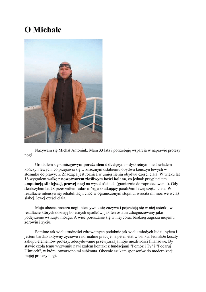 O Michale Nazywam się Michał Antoniuk. Mam 33 lata i potrzebuję wsparcia w naprawie protezy nogi. Urodziłem się z mózgowym porażeniem dziecięcym – dyskretnym niedowładem kończyn lewych, co przejawia się w znacznym osłabieniu obydwu kończyn lewych w stosunku do prawych. Znacząca jest różnica w umięśnieniu obydwu części ciała. W wieku lat 18 wygrałem walkę z nowotworem złośliwym kości kolana, co jednak przypłaciłem amputacją silniejszej, prawej nogi na wysokości uda (granicznie do zaprotezowania). Gdy skończyłem lat 28 przeszedłem udar mózgu skutkujący paraliżem lewej części ciała. W rezultacie intensywnej rehabilitacji, choć w ograniczonym stopniu, wróciła mi moc we wciąż słabej, lewej części ciała. Moja obecna proteza nogi intensywnie się zużywa i pojawiają się w niej usterki, w rezultacie których doznaję bolesnych upadków, jak ten ostatni zdiagnozowany jako podejrzenie wstrząsu mózgu. A wiec poruszanie się w niej coraz bardziej zagraża mojemu zdrowiu i życiu. Pomimo tak wielu trudności zdrowotnych podobnie jak wielu młodych ludzi, byłem i jestem bardzo aktywny życiowo i normalnie pracuje na pełen etat w banku. Jednakże koszty zakupu elementów protezy, zdecydowanie przewyższają moje możliwości finansowe. By stawic czoła temu wyzwaniu nawiązałem kontakt z fundacjami "Pomóż i Ty" i "Podaruj Uśmiech", w której otworzono mi subkonta. Obecnie szukam sponsorów do modernizacji mojej protezy nogi. Proteza Po niedawnej wizycie w zakładzie protetycznym Ortocentrum w Warszawie protetyk zalecił mi wymianę wadliwe już działającego i powodującego upadki kolana hydraulicznego na nowe, znacznie bardziej bezpieczne kolano siedmioosiowe firmy Ossur, oraz wykonanie nowego leja protezy, gdyż obecny nie jest już odpowiednio dopasowany do moich potrzeb. Całość tych niezbędnych mi napraw wycenił na ok. 40 tys. zł. Z budżetu Narodowego Funduszu Zdrowia na ten cel przysługuje mi refundacja w kwocie do 2,8 tys. zł. Pozostała część to 37 200 zł. Koszt ten przekracza moje moje możliwości finansowe. Stąd potrzebne jest wsparcie osób, które mogą i chcą się podzielić tym co mają Bardzo proszę o wpłaty na poniższe konto. Każda złotówka jest ważna i bardzo mi pomoże: 1. Konto, na które darczyńcy mogą przekazywać darowizny finansowe: Fundacja na Rzecz Osób Niewidomych i Niepełnosprawnych „POMÓŻ I TY”: Bank Millenium S.A. 12 1160 2202 0000 0002 0909 8250 Z dopiskiem „proteza nogi dla Michała Antoniuka” Darczyńcom przesyłamy potwierdzenie wpłaty darowizny w postaci dyplomów podziękowań. 2. Za pośrednictwem fundacji "Podaruj Uśmiech" można przekazać 1% podatku na nasz cel. W chwili składania do Urzędu skarbowego rocznego zeznania podatkowego, wystarczy wskazać nr KRS fundacji Fundacji Dzieciom Niepełnosprawnym „Podaruj Uśmiech” KRS 0000 245 254 z dopiskiem „proteza nogi dla Michała Antoniuka”. Urząd Skarbowy przekaże kwotę 1% podatku na rachunek bankowy fundacji. ZAPRASZAMY TEŻ NA: Protezadlamichala.pl Oraz na http://www.facebook.com/pages/Proteza-dla-Micha%C5%82a/111240885708407