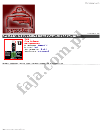 Informacje o produkcie Utworzono 03-03-2017 Cena : Ceny dostępne po zalogowaniu fa ja .c o m Nr katalogowy : SAK006-TC Producent : SAK Stan magazynowy : średni Średnia ocena : brak recenzji .p l SAK006-TC - OLEJEK AROMAT TRAWA CYTRYNOWA DO KOMINKOW AROMAT DO KOMINKOW O ZAPACHU TRAWA CYTRYNOWA, 10 GRAM, ESENCJA W FORMIE OLEJKU. Wygenerowano w programie www.oscGold.com