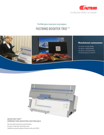 technologie oprawy na żądanie Perfekcyjna maszyna zszywająca Fastbind BooXTer trio™ Wszechstronne zastosowania: • Do opraw z twardą okładką • Do opraw z miękką okładką • Do opraw z taśmą grzbietową • Do prostej oprawy zszywkami BooXTer trio™ perfekcyjna maszyna zszywająca Ma niezwykle ergonomiczną konstrukcję Pracuje w trybie pół-automatycznym Umożliwia oprawę każdego formatu od A6 aż do SRA3 Fastbind BooXTer trio™ Prostota obsługi i wysoka jakość oprawy Nowatorski Fastbind BooXTer Trio™ jest najlepszą maszyną do oprawy. Jej potężny elektroniczny moduł zszywający zapewnia uzyskanie doskonałego rezultatu procesu oprawy, przy zastosowaniu dowolnych materiałów; maszyna radzi sobie z papierem fotograficznym oraz papierem powlekanym tak samo dobrze jak ze standardowym papierem ksero. BooXTer Trio™ może zostać rozbudowany o opcjonalny Cover Setter™ - proste w użyciu narzędzie pozycjonujące, ułatwiające dołączanie twardej okładki do bloku kartek. Cover Setter™ można zainstalować na BooXTer Trio™ lub postawić obok jako osobną jednostkę. Szybkość i niezawodność pracy Kompaktowy i bezgłośny BooXTer Trio™ jest gotowy do pracy natychmiast po włączeniu. Wbudowane półki w tylnej części maszyny sprawiają, że wszystkie materiały eksploatacyjne są na wyciągnięcie ręki. Doskonały elektryczny moduł zszywający radzi sobie z papierem fotograficznym oraz papierem powlekanym tak samo dobrze jak ze standardowym papierem ksero. Unikalna metoda bocznego szycia gwarantuje równe rozmieszczenie zszywek wzdłuż grzbietu bloku. Rezultat jest zawsze ten sam – trwała, foremna, perfekcyjnie oprawiona książka. Najszerszy wachlarz rozwiązań w zakresie metod opraw na rynku: • oprawa z personalizowaną okładką twardą • oprawa z personalizowaną okładką miękką • oprawa ze standardową okładką twardą • oprawa z taśmą grzbietową, bezokładkowa, etc... Sterowanie pół-automatyczne maszyny BooXTer Trio™ znacząco upraszcza proces szycia, co czyni z urządzenia idealne rozwiązanie do seryjnej produkcji. Po prostu umieść blok kartek w maszynie i wciśnij przycisk "start". BooXTer Trio™ automatycznie rozpoznaje format oraz umieszcza z idealną dokładnością zszywki, zależnie od wybranego programu (manualny, jedna strona, dwie strony). Istnieje także możliwość dodawania programów użytkownika. Kompletne rozwiązania w zakresie oprawy System Fastbind zapewnia szeroką gamę doskonałych urządzeń oraz materiałów eksploatacyjnych, abyś mógł w pełni korzystać z funkcjonalności BooXTer Trio™. Skorzystaj także z innych produktów Fastbind, aby jeszcze bardziej poszerzyć swoje możliwości w zakresie wykonywania opraw: • użyj stanowiska do montażu personalizowanych okładek twardych Fastbind Casematic • użyj maszyn bigujących Fastbind - wykonaj perfekcyjne miękkie okładki Trwała, foremna, perfekcyjnie oprawiona książka. • użyj kartonów montażowych Fastbind End Sheet, aby połączyć okładkę z blokiem kartek Dane techniczne Metoda oprawy Precyzyjne zszywanie boczne Obsługiwane typy oprawy oprawa z taśmą grzbietową, miękka okładka, oprawa zszywkami Opcjonalne typy oprawy Standardowe i personalizowane twarde okładki (cover setter sprzedawany oddzielnie) Rozmiary oprawy max 320 mm / brak ograniczeń w przypadku obsługi manualnej Maksymalna grubość oprawy 1) papier ksero 8 mm / papier powlekany 5 mm Specyfikacja części elektrycznych 100-240 VAC, 50/60 Hz, 1.3 A Wymiary maszyny (szer. x dł. x wys.) 976 x 465 x 496 mm BooXTer Trio™ automatycznie rozpoznaje format oraz umieszcza z idealną dokładnością zszywki zgodnie z wybranym programem. Wymiary opakowania (szer. x dł. x wys.) 1077 x 482 x 604 mm Waga Brutto 24 kg Certyfikaty CE 1) Uwzględniono szycie oraz montaż okładki do bloku - rzeczywista wydajność może się różnić, w zależności od operatora Objęte patentem: BooXTer Trio™, kartony montażowe End Sheets oraz taśma grzbietowa. Informacje aktualne na miesiąc czerwiec 2010 – mogą ulec zmianie bez uprzedniego powiadomienia. Przedstawiciel w Polsce: TOMACO-INTRO 97-500 Radomsko, ul. Krasickiego 108 Tel: 044 6821600 • Fax: 044 6821019 [email protected] • www.fastbindpolska.pl BooXTer Trio™ może zostać rozbudowany o opcjonalny Cover Setter™. Użyj maszyn typu Fastbind Casematic do wykonywania okładek twardych. Producent: Maping Co Kuusiniemi 10, 02710 Espoo, FINLAND Tel: +358 9 562 6022 • Fax: +358 9 562 6215 [email protected] • www.fastbind.com