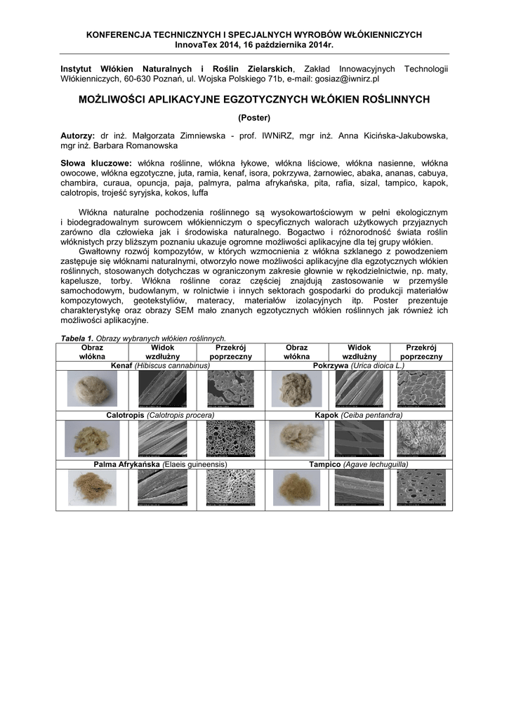 KONFERENCJA TECHNICZNYCH I SPECJALNYCH WYROBÓW WŁÓKIENNICZYCH InnovaTex 2014, 16 października 2014r. Instytut Włókien Naturalnych i Roślin Zielarskich, Zakład Innowacyjnych Włókienniczych, 60-630 Poznań, ul. Wojska Polskiego 71b, e-mail: [email protected] Technologii MOŻLIWOŚCI APLIKACYJNE EGZOTYCZNYCH WŁÓKIEN ROŚLINNYCH (Poster) Autorzy: dr inż. Małgorzata Zimniewska - prof. IWNiRZ, mgr inż. Anna Kicińska-Jakubowska, mgr inż. Barbara Romanowska Słowa kluczowe: włókna roślinne, włókna łykowe, włókna liściowe, włókna nasienne, włókna owocowe, włókna egzotyczne, juta, ramia, kenaf, isora, pokrzywa, żarnowiec, abaka, ananas, cabuya, chambira, curaua, opuncja, paja, palmyra, palma afrykańska, pita, rafia, sizal, tampico, kapok, calotropis, trojeść syryjska, kokos, luffa Włókna naturalne pochodzenia roślinnego są wysokowartościowym w pełni ekologicznym i biodegradowalnym surowcem włókienniczym o specyficznych walorach użytkowych przyjaznych zarówno dla człowieka jak i środowiska naturalnego. Bogactwo i różnorodność świata roślin włóknistych przy bliższym poznaniu ukazuje ogromne możliwości aplikacyjne dla tej grupy włókien. Gwałtowny rozwój kompozytów, w których wzmocnienia z włókna szklanego z powodzeniem zastępuje się włóknami naturalnymi, otworzyło nowe możliwości aplikacyjne dla egzotycznych włókien roślinnych, stosowanych dotychczas w ograniczonym zakresie głownie w rękodzielnictwie, np. maty, kapelusze, torby. Włókna roślinne coraz częściej znajdują zastosowanie w przemyśle samochodowym, budowlanym, w rolnictwie i innych sektorach gospodarki do produkcji materiałów kompozytowych, geotekstyliów, materacy, materiałów izolacyjnych itp. Poster prezentuje charakterystykę oraz obrazy SEM mało znanych egzotycznych włókien roślinnych jak również ich możliwości aplikacyjne. Tabela 1. Obrazy wybranych włókien roślinnych. Obraz Widok Przekrój włókna wzdłużny poprzeczny Kenaf (Hibiscus cannabinus) Obraz włókna Widok Przekrój wzdłużny poprzeczny Pokrzywa (Urica dioica L.) Calotropis (Calotropis procera) Kapok (Ceiba pentandra) Palma Afrykańska (Elaeis guineensis) Tampico (Agave lechuguilla)