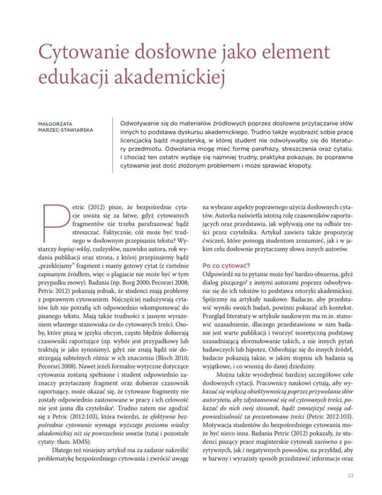 Cytowanie dosłowne jako element edukacji akademickiej Małgorzata Marzec-Stawiarska P Odwoływanie się do materiałów źródłowych poprzez dosłowne przytaczanie słów innych to podstawa dyskursu akademickiego. Trudno także wyobrazić sobie pracę licencjacką bądź magisterską, w której student nie odwoływałby się do literatury przedmiotu. Odwołania mogę mieć formę parafrazy, streszczenia oraz cytatu. I chociaż ten ostatni wydaje się najmniej trudny, praktyka pokazuje, że poprawne cytowanie jest dość złożonym problemem i może sprawiać kłopoty. etric (2012) pisze, że bezpośrednie cytacje uważa się za łatwe, gdyż cytowanych fragmentów nie trzeba parafrazować bądź streszczać. Faktycznie, cóż może być trudnego w dosłownym przepisaniu tekstu? Wystarczy kopiuj-wklej, cudzysłów, nazwisko autora, rok wydania publikacji oraz strona, z której przepisujemy bądź „przeklejamy” fragment i mamy gotowy cytat (z rzetelnie zapisanym źródłem, więc o plagiacie nie może być w tym przypadku mowy). Badania (np. Borg 2000; Pecorari 2008; Petric 2012) pokazują jednak, że studenci mają problemy z poprawnym cytowaniem. Najczęściej nadużywają cytatów lub nie potrafią ich odpowiednio wkomponować do pisanego tekstu. Mają także trudności z jasnym wyrażeniem własnego stanowiska co do cytowanych treści. Osoby, które piszą w języku obcym, często błędnie dobierają czasowniki raportujące (np. wybór jest przypadkowy lub traktują je jako synonimy), gdyż nie znają bądź nie dostrzegają subtelnych różnic w ich znaczeniu (Bloch 2010; Pecorari 2008). Nawet jeżeli formalne wytyczne dotyczące cytowania zostaną spełnione i student odpowiednio zaznaczy przytaczany fragment oraz dobierze czasownik raportujący, może okazać się, że cytowane fragmenty nie zostały odpowiednio zastosowane w pracy i ich celowość nie jest jasna dla czytelnika1. Trudno zatem nie zgodzić się z Petric (2012:103), która twierdzi, że efektywne bezpośrednie cytowanie wymaga wyższego poziomu wiedzy akademickiej niż się powszechnie uważa (tutaj i pozostałe cytaty: tłum. MMS). Dlatego też niniejszy artykuł ma za zadanie nakreślić problematykę bezpośredniego cytowania i zwrócić uwagę na wybrane aspekty poprawnego użycia dosłownych cytatów. Autorka naświetla istotną rolę czasowników raportujących oraz przedstawia, jak wpływają one na odbiór treści przez czytelnika. Artykuł zawiera także propozycję ćwiczeń, które pomogą studentom zrozumieć, jak i w jakim celu dosłownie przytaczamy słowa innych autorów. Po co cytować? Odpowiedź na to pytanie może być bardzo obszerna, gdyż dialog piszącego2 z innymi autorami poprzez odwoływanie się do ich tekstów to podstawa retoryki akademickiej. Spójrzmy na artykuły naukowe. Badacze, aby przedstawić wyniki swoich badań, powinni pokazać ich kontekst. Przegląd literatury w artykule naukowym ma m.in. stanowić uzasadnienie, dlaczego przedstawione w nim badanie jest warte publikacji i tworzyć teoretyczną podstawę uzasadniającą sformułowanie takich, a nie innych pytań badawczych lub hipotez. Odwołując się do innych źródeł, badacze pokazują także, w jakim stopniu ich badania są wyjątkowe, i co wnoszą do danej dziedziny. Można także wyodrębnić bardziej szczegółowe cele dosłownych cytacji. Pracownicy naukowi cytują, aby wykazać się większą obiektywnością poprzez przywołanie słów autorytetu, aby zdystansować się od cytowanych treści, pokazać do nich swój stosunek, bądź zmniejszyć swoją odpowiedzialność za prezentowane treści (Petric 2012:103). Motywacja studentów do bezpośredniego cytowania może być nieco inna. Badania Petric (2012) pokazały, że studenci piszący prace magisterskie cytowali zarówno z pozytywnych, jak i negatywnych powodów, na przykład, aby w barwny i wyrazisty sposób przedstawić informacje oraz 23 JĘZYKI DO ZADAŃ SPECJALNYCH wzbogacić styl swojej pracy, ale także, i tu przechodzimy do negatywnych aspektów motywacji, ze względu na brak czasu, zmęczenie, niewystarczającą wiedzę językową, a także, aby nie popełnić błędu podczas parafrazowania i aby uniknąć plagiatu. Jeżeli chodzi o praktyczne wskazówki, kiedy stosować cytat, to Pecorari (2013:90) sugeruje, aby poinstruować studentów, że dosłowne cytacje stosuje się, gdy zarówno treść jak i forma wypowiedzi są ważne, kiedy idea jest ujęta zwięźle i przedstawia treści jasno, lub kiedy łatwo o (niepożądaną) zmianę treści podczas parafrazowania. Można także skorzystać z praktycznych wskazówek znajdujących się na stronach internetowych różnych uniwersytetów. I tak, przykładowo, na witrynie Harvard College znajdujemy zalecenie, że cytujemy, kiedy w naszej pracy ważny jest język, jakim posłużył się autor (por. http://usingsources.fas.harvard.edu/icb/ icb.do?keyword=k70847&pageid=icb.page350378). Dlatego też należy użyć cytatu, kiedy będziemy omawiać jego język, odnosić się do poszczególnych słów w cytacie, lub kiedy chcemy powołać się na dany autorytet w dziedzinie. Univeristy of Bristol zaleca, aby upewnić się, czy rzeczywiście cytat wnosi coś do naszej pracy, czy pomaga uzasadnić nasze tezy, wspiera nasz punkt widzenia lub pomaga go jaśniej nakreślić (por. http://www.bristol.ac.uk/arts/ exercises/grammar/grammar_tutorial/page_23.htm). Na stronach Colorado State University czytamy, że, m.in., nie należy tworzyć kolażu z fragmentów dzieł innych, cytować ogólnie znanych faktów i informacji bezpośrednio niezwiązanych z naszym tematem, oraz fragmentów, które można przedstawić w bardziej zwięzły sposób (strona tej uczelni jest godna polecenia – zawiera wiele praktycznych przykładów określających reguły bezpośredniego cytowania: http://writing.colostate.edu/guides/page. cfm?pageid=241&guideid=16). Cytujemy za to m.in. autorytety, treści unikatowe i twierdzenia kontrowersy
