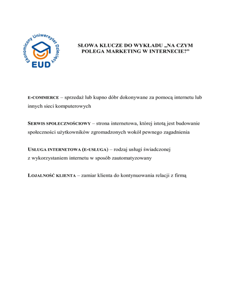 SŁOWA KLUCZE DO WYKŁADU „NA CZYM POLEGA MARKETING W INTERNECIE?” E-COMMERCE – sprzedaż lub kupno dóbr dokonywane za pomocą internetu lub innych sieci komputerowych SERWIS SPOŁECZNOŚCIOWY – strona internetowa, której istotą jest budowanie społeczności użytkowników zgromadzonych wokół pewnego zagadnienia USŁUGA INTERNETOWA (E-USŁUGA) – rodzaj usługi świadczonej z wykorzystaniem internetu w sposób zautomatyzowany LOJALNOŚĆ KLIENTA – zamiar klienta do kontynuowania relacji z firmą