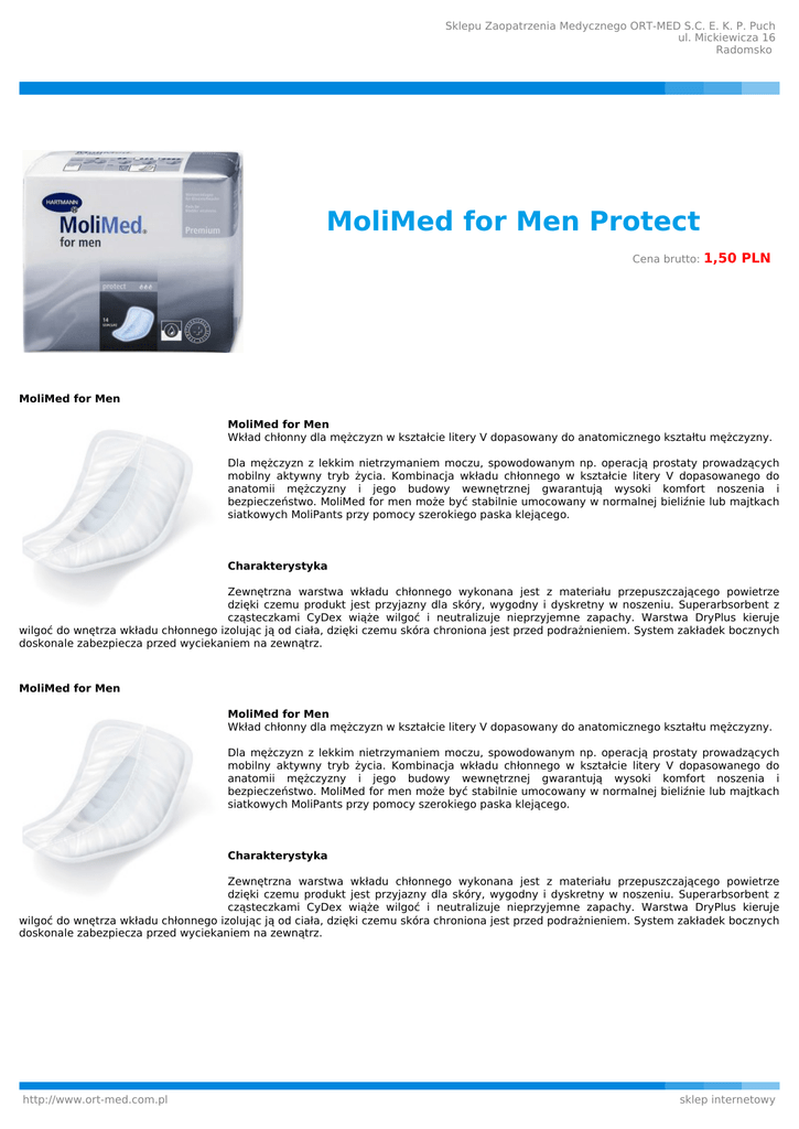 Sklepu Zaopatrzenia Medycznego ORT-MED S.C. E. K. P. Puch ul. Mickiewicza 16 Radomsko MoliMed for Men Protect Cena brutto: 1,50 PLN MoliMed for Men MoliMed for Men Wkład chłonny dla mężczyzn w kształcie litery V dopasowany do anatomicznego kształtu mężczyzny. Dla mężczyzn z lekkim nietrzymaniem moczu, spowodowanym np. operacją prostaty prowadzących mobilny aktywny tryb życia. Kombinacja wkładu chłonnego w kształcie litery V dopasowanego do anatomii mężczyzny i jego budowy wewnętrznej gwarantują wysoki komfort noszenia i bezpieczeństwo. MoliMed for men może być stabilnie umocowany w normalnej bieliźnie lub majtkach siatkowych MoliPants przy pomocy szerokiego paska klejącego. Charakterystyka Zewnętrzna warstwa wkładu chłonnego wykonana jest z materiału przepuszczającego powietrze dzięki czemu produkt jest przyjazny dla skóry, wygodny i dyskretny w noszeniu. Superarbsorbent z cząsteczkami CyDex wiąże wilgoć i neutralizuje nieprzyjemne zapachy. Warstwa DryPlus kieruje wilgoć do wnętrza wkładu chłonnego izolując ją od ciała, dzięki czemu skóra chroniona jest przed podrażnieniem. System zakładek bocznych doskonale zabezpiecza przed wyciekaniem na zewnątrz. MoliMed for Men MoliMed for Men Wkład chłonny dla mężczyzn w kształcie litery V dopasowany do anatomicznego kształtu mężczyzny. Dla mężczyzn z lekkim nietrzymaniem moczu, spowodowanym np. operacją prostaty prowadzących mobilny aktywny tryb życia. Kombinacja wkładu chłonnego w kształcie litery V dopasowanego do anatomii mężczyzny i jego budowy wewnętrznej gwarantują wysoki komfort noszenia i bezpieczeństwo. MoliMed for men może być stabilnie umocowany w normalnej bieliźnie lub majtkach siatkowych MoliPants przy pomocy szerokiego paska klejącego. Charakterystyka Zewnętrzna warstwa wkładu chłonnego wykonana jest z materiału przepuszczającego powietrze dzięki czemu produkt jest przyjazny dla skóry, wygodny i dyskretny w noszeniu. Superarbsorbent z cząsteczkami CyDex wiąże wilgoć i neutralizuje nieprzyjemne zapachy. Warstwa DryPlus kieruje wilgoć do wnętrza wkładu chłonnego izolując ją od ciała, dzięki czemu skóra chroniona jest przed podrażnieniem. System zakładek bocznych doskonale zabezpiecza przed wyciekaniem na zewnątrz. http://www.ort-med.com.pl sklep internetowy