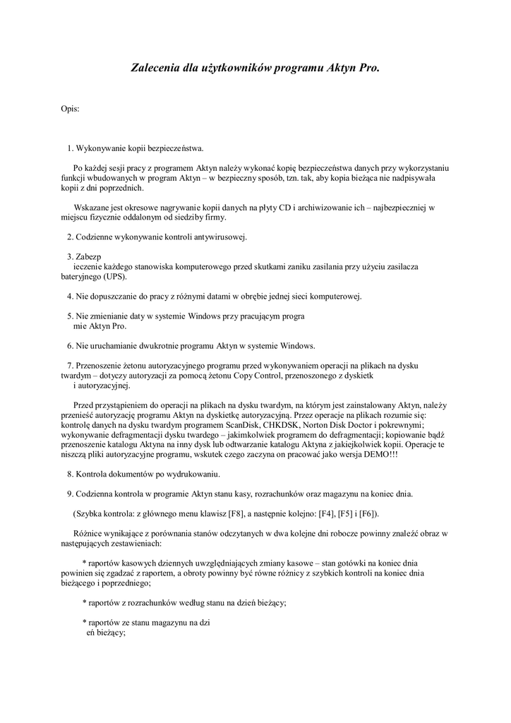Zalecenia dla użytkowników programu Aktyn Pro. Opis: 1. Wykonywanie kopii bezpieczeństwa. Po każdej sesji pracy z programem Aktyn należy wykonać kopię bezpieczeństwa danych przy wykorzystaniu funkcji wbudowanych w program Aktyn – w bezpieczny sposób, tzn. tak, aby kopia bieżąca nie nadpisywała kopii z dni poprzednich. Wskazane jest okresowe nagrywanie kopii danych na płyty CD i archiwizowanie ich – najbezpieczniej w miejscu fizycznie oddalonym od siedziby firmy. 2. Codzienne wykonywanie kontroli antywirusowej. 3. Zabezp ieczenie każdego stanowiska komputerowego przed skutkami zaniku zasilania przy użyciu zasilacza bateryjnego (UPS). 4. Nie dopuszczanie do pracy z różnymi datami w obrębie jednej sieci komputerowej. 5. Nie zmienianie daty w systemie Windows przy pracującym progra mie Aktyn Pro. 6. Nie uruchamianie dwukrotnie programu Aktyn w systemie Windows. 7. Przenoszenie żetonu autoryzacyjnego programu przed wykonywaniem operacji na plikach na dysku twardym – dotyczy autoryzacji za pomocą żetonu Copy Control, przenoszonego z dyskietk i autoryzacyjnej. Przed przystąpieniem do operacji na plikach na dysku twardym, na którym jest zainstalowany Aktyn, należy przenieść autoryzację programu Aktyn na dyskietkę autoryzacyjną. Przez operacje na plikach rozumie się: kontrolę danych na dysku twardym programem ScanDisk, CHKDSK, Norton Disk Doctor i pokrewnymi; wykonywanie defragmentacji dysku twardego – jakimkolwiek programem do defragmentacji; kopiowanie bądź przenoszenie katalogu Aktyna na inny dysk lub odtwarzanie katalogu Aktyna z jakiejkolwiek kopii. Operacje te niszczą pliki autoryzacyjne programu, wskutek czego zaczyna on pracować jako wersja DEMO!!! 8. Kontrola dokumentów po wydrukowaniu. 9. Codzienna kontrola w programie Aktyn stanu kasy, rozrachunków oraz magazynu na koniec dnia. (Szybka kontrola: z głównego menu klawisz [F8], a następnie kolejno: [F4], [F5] i [F6]). Różnice wynikające z porównania stanów odczytanych w dwa kolejne dni robocze powinny znaleźć obraz w następujących zestawieniach: * raportów kasowych dziennych uwzględniających zmiany kasowe – stan gotówki na koniec dnia powinien się zgadzać z raportem, a obroty powinny być równe różnicy z szybkich kontroli na koniec dnia bieżącego i poprzedniego; * raportów z rozrachunków według stanu na dzień bieżący; * raportów ze stanu magazynu na dzi eń bieżący; * raportów z transakcji – suma wartości transakcji rozchodowych i przychodowych powinna odzwierciedlać różnicę pomiędzy stanem wartościowym kasy, magazynu i rozrachunków pomiędzy datami wykonania raportu. 10. Comiesięczne kontrolowanie spójności stanu wartościowego magazynu wynikającego z zarejestrowanych w systemie Aktyn FK transakcji z magazynem w programie Aktyn. 11. Sprawdzanie wartości magazynu (szybka kontrola: z głównego menu klawisz [F8], a następnie [F2]) i kasy (szybka kontrola: z głównego menu klawisz [F8]) przed poprawą i po poprawie dokumentów w programie Aktyn – jeżeli wartości są takie same, a poprawa nie obejmowała zmiany ilościowo-wartościowej bądź jeżeli wartości zmieniły się zgodnie ze zmianą dokumentu – jesteśmy pewni, że poprawa nie z aburzyła spójności danych. 12. Posługiwanie się kartotekami towarów i kontrahentów – unikać wpisywania kodów “z ręki”. 13. Nie zmienianie kodów i nazw dla już istniejących w bazie kartotek kontrahentów i towarów. 14. Do przechodzenia pomiędzy polami w oknach dialogowych używanie klawisza [Enter], a nie strzałek. 15. W przypadku jakichkolwiek popraw – zamiana bądź ponowny wydruk wszelkiego rodzaju dokumentów, na które mają wpływ poprawy, np. zestawienia, raporty, export do FK itp. 16. Zarejestrowanie wszelkiego rodzaju popraw do kumentów odnoszących się do daty wcześniejszej niż bieżąca, np. poprawy dokumentów faktur sprzedaży, zmiany kodów towarów lub kontrahentów itp. w “Książce Serwisowej” założonej przez osobę wyznaczoną przez zarząd firmy, na rzecz której świadczone są usługi. 17. W środowisku Windows: nie uruchamianie kolejnych poleceń, gdy system nie wykonał jeszcze pierwszego polecenia – może to zablokować pracę programów i systemu operacyjnego Windows, a w konsekwencji przyczynić się do powstania błędów w bazie danych. 18. Nie pod łączanie drukarek fiskalnych do komputera pełniącego funkcję serwera lub udostępniającego foldery czy drukarki. 19. Nie zmienianie raz ustawionego standardu polskich znaków. 20. Nie używanie modułów z datą instalacji/kompilacji późniejszą niż data upływu gwarancji . 21. W ścieżkach, kodach stanowisk itd. stosować znaki dozwolone przez środowisko, w którym pracuje Aktyn (bez polskich liter, spacji, znaków specjalnych takich, jak ? # @ $ itp.). 22. Rejestrowanie wszystkich błędów pokazywanych w programie np. poprzez wykonywanie wydruków zawartości ekranu (klawiszem [Print Screen] – czasem może być opisany jako [Prt Sc]) wraz z opisem sytuacji, w których te błędy występują (co robiliśmy w momencie wystąpienia błędu, co się stało – zanik napięcia, awaria sieci – jaka awaria – i tp.). 23. Sprawdzać dane po awarii – np. posługując się programem Serwis. 24. Dokładne zapoznanie się i przestrzeganie Instrukcji Użytkownika wraz ze wszystkimi Aneksami i Zmianami.