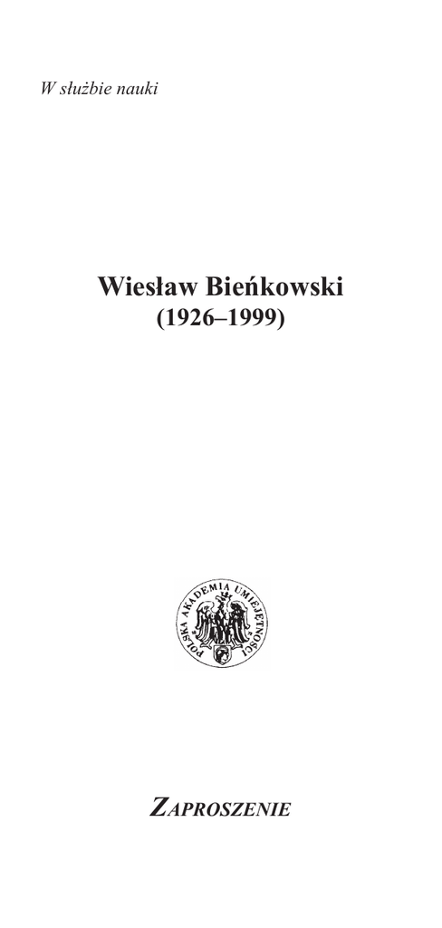 W służbie nauki Wiesław Bieńkowski (1926–1999) Zaproszenie POLSKA AKADEMIA UMIEJĘTNOŚCI ARCHIWUM NAUKI PAN I PAU uprzejmie zapraszają na Posiedzenie Naukowe poświęcone Wiesławowi Bieńkowskiemu (1926–1999) które będzie miało miejsce w poniedziałek 18 października 2010 od godziny 10.00 w salach Polskiej Akademii Umiejętności przy ul. Sławkowskiej 17. PORZĄDEK SESJI 10.00 – Duża Sala PAU Otwarcie – Prof. Jan Małecki Prof. Jerzy Wyrozumski Kraków w życiu Wiesława Bieńkowskiego Prof. Anna Migoniowa Prof. Marta Skalska-Zlat Obecność Wiesława Bieńkowskiego w naukowym ruchu wydawniczym Dr hab. Anna Gruca Biografistyka w dorobku naukowym Wiesława Bieńkowskiego Dr Stefan Gąsiorowski Wiesław Bieńkowski – bibliograf 11.30–12.00 Przerwa 12.00 – Duża Sala PAU Dr Anna Spissowa Wiesław Bieńkowski jako etnograf Dr Piotr Lechowski O zamiłowaniach bibliofilskich Wiesława Bieńkowskiego i jego bibliotece Dr Maria Pelczar Gdański epizod w życiu i pracy naukowej Wiesława Bieńkowskiego Mgr Ewa Dziurzyńska Z biegiem lat, z biegiem dni. Kalendarze Wiesława Bieńkowskiego 13.30–14.30 Przerwa 14.30 – Mała Aula PAU Prof. Maria Kocójowa Drugi dom Wiesława Bieńkowskiego w Uniwersytecie Jagiellońskim Prof. Jan Małecki O spotkaniach i przyjaźni z Wiesławem Bieńkowskim Mgr Mieczysław Wrzesień Przyjaźń z Kolbergiem w tle Wspomnienia o Profesorze Podczas obrad sesji w sali wystawowej Archiwum Nauki PAN i PAU przy ul. św. Jana 26 otwarta będzie wystawa (czynna do 22 X) Civis Cracoviensis Wiesław Bieńkowski (1926–1999) biograf i bibliograf Bywają ludzie, których biogramy potwierdzają starą zasadę Wergiliusza: labor omnia vincit improbus – wytrwała praca wszystko przemoże.