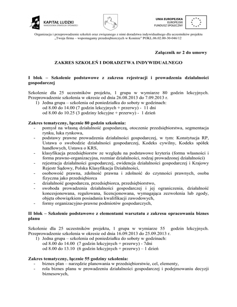 Organizacja i przeprowadzenie szkoleń oraz związanego z nimi doradztwa indywidualnego dla uczestników projektu „Twoja firma – wspomagamy przedsiębiorczych w Koninie” POKL.06.02.00-30-046/12 Załącznik nr 2 do umowy ZAKRES SZKOLEŃ I DORADZTWA INDYWIDUALNEGO I blok – Szkolenie podstawowe z zakresu rejestracji i prowadzenia działalności gospodarczej Szkolenie dla 25 uczestników projektu, 1 grupa w wymiarze 80 godzin lekcyjnych. Przeprowadzenie szkolenia w okresie od dnia 26.08.2013 do 7.09.2013 r. 1) Jedna grupa – szkolenia od poniedziałku do soboty w godzinach: od 8.00 do 14.00 (7 godzin lekcyjnych + przerwy) - 11 dni od 8.00 do 10.25 (3 godziny lekcyjne + przerwy) - 1 dzień Zakres tematyczny, łącznie 80 godzin szkolenia: - pomysł na własną działalność gospodarczą, otoczenie przedsiębiorstwa, segmentacja rynku, luka rynkowa, - podstawy prawne prowadzenia działalności gospodarczej, w tym: Konstytucja RP, Ustawa o swobodzie działalności gospodarczej, Kodeks cywilny, Kodeks spółek handlowych, Ustawa o KRS, - klasyfikacja przedsiębiorstw ze względu na podstawowe kryteria (forma własności i forma prawno-organizacyjna, rozmiar działalności, rodzaj prowadzonej działalności) - rejestracja działalności gospodarczej, ewidencja działalności gospodarczej i Krajowy Rejestr Sądowy, Polska Klasyfikacja Działalności, - osobowość prawna, zdolność prawna i zdolność do czynności prawnych, osoba fizyczna jako przedsiębiorca - działalność gospodarcza, przedsiębiorca, przedsiębiorstwo, - swoboda prowadzenia działalności gospodarczej i jej ograniczenia, działalność koncesjonowana, regulowana, licencjonowana, wymagająca zezwolenia lub zgody, objęta obowiązkiem posiadania kwalifikacji zawodowych, - formy organizacyjno-prawne podmiotów gospodarczych, II blok – Szkolenie podstawowe z elementami warsztatu z zakresu opracowania biznes planu Szkolenie dla 25 uczestników projektu, 1 grupa w wymiarze 55 godzin lekcyjnych. Przeprowadzenie szkolenia w okresie od dnia 16.09.2013 do 25.09.2013 r. 1) Jedna grupa – szkolenia od poniedziałku do soboty w godzinach: od 8.00 do 14.00 (7 godzin lekcyjnych + przerwy) - 7dni od 8.00 do 13.10 (6 godzin lekcyjnych + przerwy) – 1 dzień Zakres tematyczny, łącznie 55 godziny szkolenia: - biznes plan – narzędzie planowania w przedsiębiorstwie, cel, elementy, - rola biznes planu w prowadzeniu działalności gospodarczej i podejmowaniu decyzji biznesowych, Organizacja i przeprowadzenie szkoleń oraz związanego z nimi doradztwa indywidualnego dla uczestników projektu „Twoja firma – wspomagamy przedsiębiorczych w Koninie” POKL.06.02.00-30-046/12 - zasady konstrukcji i etapy przygotowania biznes planu, analiza otoczenia, branŜa, konkurencja, SWOT, analiza działań marketingowych, analiza finansowa, planowane nakłady inwestycyjne, przychody, koszty, bilans, rachunek wyników, przepływy pienięŜne, analiza ryzyka, harmonogram rzeczowo-finansowy inwestycji, biznes plan obowiązujący w Projekcie „Twoja firma –wspomagamy przedsiębiorczych w Koninie” i metodologia jego oceny formalnej i merytorycznej, pisanie biznes planów – warsztaty na bazie pomysłów Uczestników Projektu. III blok – Szkolenie specjalistyczne w zakresie efektywnego wykorzystania jednorazowej dotacji inwestycyjnej( w tym promocja PO KL) wyłącznie dla osób które otrzymały dotację Szkolenie dla 20 uczestników projektu, którzy otrzymają dotację inwestycyjną na rozpoczęcie działalności gospodarczej, 1 grupa w wymiarze 50 godzin lekcyjnych. Przeprowadzenie szkolenia w okresie od 7.01.2014 do 15.01.2014 r. 1) Jedna grupa – szkolenia od poniedziałku do soboty w godzinach: od 8.00 do 14.00 (7 godzin lekcyjnych + przerwy) - 6 dni od 8.00 do 14.45 (8 godzin lekcyjnych + przerwy) - 1 dzień Zakres tematyczny, łącznie 50 godzin szkolenia: - wytyczne z zakresu wydatkowania dotacji inwestycyjnej w ramach POKL i z budŜetu państwa, wsparcia pomostowego - pomocy publicznej i pomoc de minimis, przepisy prawne i wytyczne w ramach POKL, - rodzaje i kwalifikowalność wydatków, wytyczne POKL, - zasada konkurencyjności w POKL, - zasada efektywnego zarządzania finansami w POKL - promocja w POKL , - rozliczenie dotacji inwestycyjnej w Projekcie i zasady kontroli w POKL. IV blok – Szkolenie specjalistyczne z zakresu prowadzonej działalności gospodarczej w tym wg PKD Szkolenie dla 20 uczestników projektu, którzy otrzymają dotację inwestycyjną na rozpoczęcie działalności gospodarczej, 1 grupa w wymiarze 40 godzin lekcyjnych. Przeprowadzenie szkolenia w okresie od 17.02.2014 do 24.02.2014 r. 1.) Jedna grupa – szkolenia od poniedziałku do soboty w godzinach: od 8.00 do 14.00 (7 godzin lekcyjnych + przerwy) - 5 dni od 8.00 do 11.55 (5 godzin lekcyjnych + przerwy) - 1 dzień Zakres tematyczny, łącznie 40 godzin szkolenia: - obowiązki pracodawcy – Kodeks pracy, zatrudnianie pracowników, - umowy cywilnoprawne, - ubezpieczenie społeczne i zdrowotne, - podstawy prawne i formy opodatkowania, Organizacja i przeprowadzenie szkoleń oraz związanego z nimi doradztwa indywidualnego dla uczestników projektu „Twoja firma – wspomagamy przedsiębiorczych w Koninie” POKL.06.02.00-30-046/12 - podatek dochodowy od osób fizycznych, podatek VAT, podstawy księgowości, podatkowa księga przychodów i rozchodów, zryczałtowany podatek dochodowy, karta podatkowa, środki trwałe, amortyzacja i ewidencja, programy komputerowe w tym Płatnik, rachunek ekonomiczny, źródła finansowania działalności gospodarczej, pozyskiwanie dodatkowych źródeł finansowania, podstawowe zagadnienia dotyczące wydatkowania dotacji inwestycyjnej i wsparcia pomostowego, podstawowe zagadnienia z zakresu marketingu, komunikacji i negocjacji, pozyskiwanie klientów, kontrahentów, budowa wizerunku firmy. V blok – Szkolenie z zakresu stosowania zasady równości szans w tym płci Szkolenie dla Zespołu zarządzającego Projektem, w 