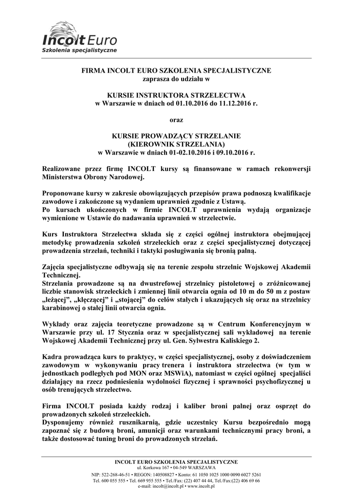 FIRMA INCOLT EURO SZKOLENIA SPECJALISTYCZNE zaprasza do udziału w KURSIE INSTRUKTORA STRZELECTWA w Warszawie w dniach od 01.10.2016 do 11.12.2016 r. oraz KURSIE PROWADZĄCY STRZELANIE (KIEROWNIK STRZELANIA) w Warszawie w dniach 01-02.10.2016 i 09.10.2016 r. Realizowane przez firmę INCOLT kursy są finansowane w ramach rekonwersji Ministerstwa Obrony Narodowej. Proponowane kursy w zakresie obowiązujących przepisów prawa podnoszą kwalifikacje zawodowe i zakończone są wydaniem uprawnień zgodnie z Ustawą. Po kursach ukończonych w firmie INCOLT uprawnienia wydają organizacje wymienione w Ustawie do nadawania uprawnień w strzelectwie. Kurs Instruktora Strzelectwa składa się z części ogólnej instruktora obejmującej metodykę prowadzenia szkoleń strzeleckich oraz z części specjalistycznej dotyczącej prowadzenia strzelań, techniki i taktyki posługiwania się bronią palną. Zajęcia specjalistyczne odbywają się na terenie zespołu strzelnic Wojskowej Akademii Technicznej. Strzelania prowadzone są na dwustrefowej strzelnicy pistoletowej o zróżnicowanej liczbie stanowisk strzeleckich i zmiennej linii otwarcia ognia od 10 m do 50 m z postaw „leżącej”, „klęczącej” i „stojącej” do celów stałych i ukazujących się oraz na strzelnicy karabinowej o stałej linii otwarcia ognia. Wykłady oraz zajęcia teoretyczne prowadzone są w Centrum Konferencyjnym w Warszawie przy ul. 17 Stycznia oraz w specjalistycznej sali wykładowej na terenie Wojskowej Akademii Technicznej przy ul. Gen. Sylwestra Kaliskiego 2. Kadra prowadząca kurs to praktycy, w części specjalistycznej, osoby z doświadczeniem zawodowym w wykonywaniu pracy trenera i instruktora strzelectwa (w tym w jednostkach podległych pod MON oraz MSWiA), natomiast w części ogólnej specjaliści działający na rzecz podniesienia wydolności fizycznej i sprawności psychofizycznej u osób trenujących strzelectwo. Firma INCOLT posiada każdy rodzaj i kaliber broni palnej oraz osprzęt do prowadzonych szkoleń strzeleckich. Dysponujemy również rusznikarnią, gdzie uczestnicy Kursu bezpośrednio mogą zapoznać się z budową broni, amunicji oraz warunkami technicznymi pracy broni, a także dostosować tuning broni do prowadzonych strzelań. INCOLT EURO SZKOLENIA SPECJALISTYCZNE ul. Korkowa 167 • 04-549 WARSZAWA NIP: 522-268-46-51 • REGON: 140508827 • Konto: 61 1050 1025 1000 0090 6027 5261 Tel. 600 055 555 • Tel. 669 955 555 • Tel./Fax: (22) 407 44 44, Tel./Fax:(22) 406 69 66 e-mail: [email protected] • www.incolt.pl Uczestnicy kursu po zaliczeniu egzaminu końcowego otrzymują: Legitymację INSTRUKTORA SPORTU STRZELECKIEGO wydaną przez Polski Związek Strzelectwa Sportowego uprawniającą do prowadzenia szkoleń strzeleckich, w tym w myśl ustawy z bronią szczególnie niebezpieczną w MON, MSWiA oraz wszelkich innych jednostkach w/g potrzeb (także w jednostkach szkoleniowych, oświatowych, szkołach i klubach sportowych). Dla osób uczestniczących w Kursie Instruktora Strzelectwa proponujemy nabycie dodatkowych uprawnień do prowadzenia i nadzorowania strzelań z broni maszynowej i automatycznej na specjalistycznym Kursie PROWADZĄCY STRZELANIE (Kierownik Strzelania). Szkolenie jest prowadzone tak jak zostało to opisane przy Kursie Instruktora Strzelectwa. Absolwenci kursu otrzymają uprawnienie ,, PROWADZĄCY STRZELANIE ’’ wydany przez LOK na podstawie rozporządzenia MSWiA (uprawnienie do prowadzenia szkoleń strzeleckich z broni krótkiej bojowej, maszynowej i gładkolufowej). Zajęcia na powyżej wymienionych Kursach odbywają się w soboty od godz. 11.00 oraz niedziele od godz. 10.00. Do dyspozycji kursantów jest przestronna, klimatyzowana sala konferencyjna wyposażona w profesjonalny sprzęt multimedialny. Podczas dnia zajęć szkoleniowych zapewniamy kawę, herbatę, napoje. Wpłaty za kursy można uiszczać w ratach po indywidualnych ustaleniach. Ważne – firma INCOLT prowadzi szkolenie po którym wydawane jest uprawnienie do prowadzenia i nadzorowania strzelań z broni automatycznej ( karabinek, karabin) i maszynowej ( pistolet maszynowy). Dla służb mundurowych ustalamy indywidualnie koszty poszczególnych kursów. Osobami uprawnionymi do korzystania z oferowanej zniżki są: funkcjonariusze Policji, Straży Granicznej, Państwowej Straży Pożarnej, Agencji Bezpieczeństwa Wewnętrznego, Centralnego Biura Antykorupcyjnego, Agencji Wywiadu, Służby Wywiadu Wojskowego, Służby Kontrwywiadu Wojskowego, Służby Więziennej, Biura Ochrony Rządu, Służby Celnej, Straży Ochrony Kolei, Straży Parku, inspektorzy i pracownicy kontroli skarbowej, inspektorzy Inspekcji Transportu Drogowego, strażnicy Straży Gminnych (Miejskich), Państwowej Straży Rybackiej, Państwowej Straży Łowieckiej, Straży Leśnej, Straży Marszałkowskiej, żołnierze Sił Zbrojnych RP oraz kwalifikowani pracownicy ochrony fizycznej. W celu zgłoszenia uczestnictwa w Kursie oraz uzyskania dodatkowych informacji o terminach zjazdów proszę o wypełnienie i przesłanie na adres e-mail kwestionariusza osobowego lub kontakt telefoniczny: 600 055 555. INCOLT EURO SZKOLENIA SPECJALISTYCZNE ul. Korkowa 167 • 04-549 WARSZAWA NIP: 522-268-46-51 • REGON: 140508827 • Konto: 61 1050 1025 1000 0090 6027 5261 Tel. 600 055 555 • Tel. 669 955 555 • Tel./Fax: (22) 407 44 44, Tel./Fax:(22) 406 69 66 e-mail: [email protected] • www.incolt.pl Na zajęcia szkoleniowe należy dostarczyć: 1. Zdjęcia legitymacyjne o wymiarze 3,5 cm x 4,5 cm – 3 szt. format jak do dow. os. 2. Dyplom ukończenia studiów lub Świadectwo ukończenia szkoły średniej. Firma INCOLT zapewnia wysoką jakość realizowanych kursów. Mając na uwadze komfort i wygodę uczestników zapewniamy zabezpieczenie logistyczne prowadzonych szkoleń. Dla kursantów spoza Warszawy ustaliliśmy na mocy zawartej Umowy specjalną ofertę skorzystania z pokoi 1 i 2 osobowych oraz śniadania. W wysokiej klasy 3- gwiazdkowym hotelu przy c