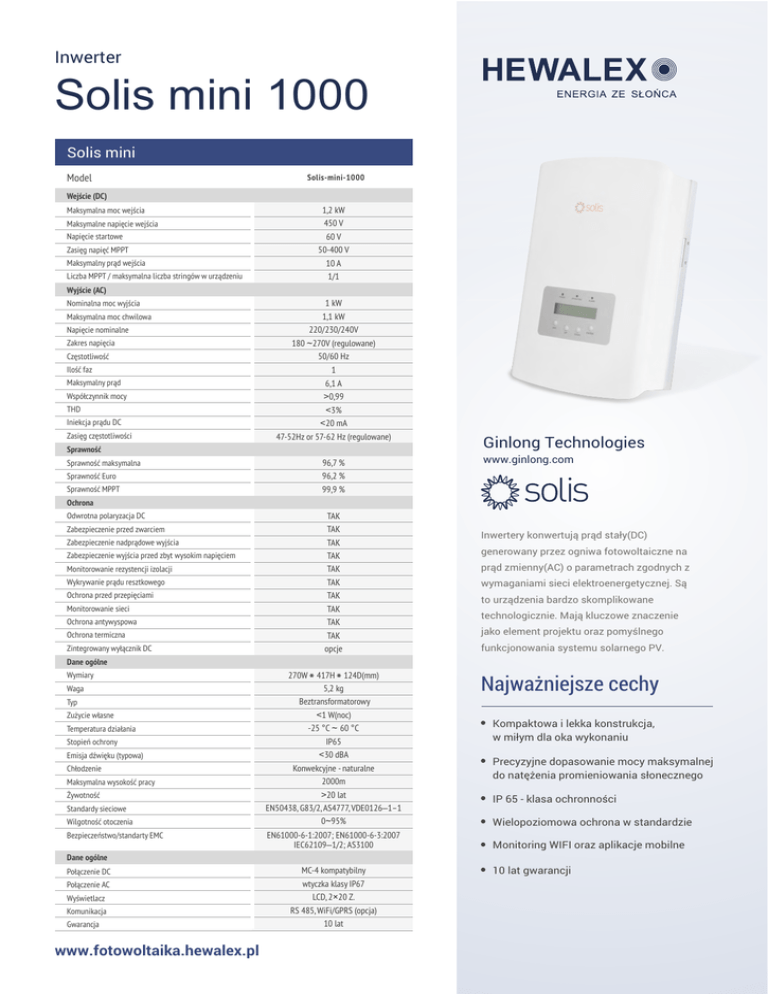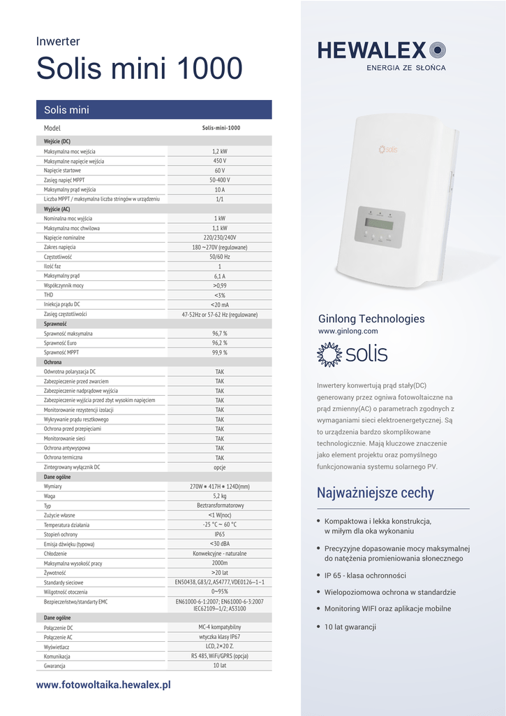 Inwerter Solis mini 1000 Solis mini Model Solis-mini-1000 Wejście (DC) Maksymalna moc wejścia 1,2 kW Maksymalne napięcie wejścia 450 V 60 V Napięcie startowe 50-400 V Zasięg napięć MPPT Maksymalny prąd wejścia 10 A Liczba MPPT / maksymalna liczba stringów w urządzeniu 1/1 Wyjście (AC) 1 kW Nominalna moc wyjścia 1,1 kW Maksymalna moc chwilowa Napięcie nominalne Zakres napięcia 220/230/240V 180 ~270V (regulowane) 50/60 Hz Częstotliwość Ilość faz 1 Maksymalny prąd 6,1 A Współczynnik mocy >0,99 THD <3% Iniekcja prądu DC Zasięg częstotliwości <20 mA 47-52Hz or 57-62 Hz (regulowane) Sprawność 96,7 % 96,2 % 99,9 % Sprawność maksymalna Sprawność Euro Sprawność MPPT Ginlong Technologies www.ginlong.com Ochrona TAK TAK TAK TAK TAK TAK TAK TAK TAK TAK opcje Odwrotna polaryzacja DC Zabezpieczenie przed zwarciem Zabezpieczenie nadprądowe wyjścia Zabezpieczenie wyjścia przed zbyt wysokim napięciem Monitorowanie rezystencji izolacji Wykrywanie prądu resztkowego Ochrona przed przepięciami Monitorowanie sieci Ochrona antywyspowa Ochrona termiczna Zintegrowany wyłącznik DC Inwertery konwertują prąd stały(DC) generowany przez ogniwa fotowoltaiczne na prąd zmienny(AC) o parametrach zgodnych z wymaganiami sieci elektroenergetycznej. Są to urządzenia bardzo skomplikowane technologicznie. Mają kluczowe znaczenie jako element projektu oraz pomyślnego funkcjonowania systemu solarnego PV. Dane ogólne Wymiary Waga Typ Zużycie własne Temperatura działania Stopień ochrony Emisja dźwięku (typowa) Chłodzenie Maksymalna wysokość pracy Żywotność Standardy sieciowe Wilgotność otoczenia Bezpieczeństwo/standarty EMC 270W 417H 124D(mm) 5,2 kg Beztransformatorowy <1 W(noc) -25 °C ~ 60 °C IP65 <30 dBA Konwekcyjne - naturalne 2000m >20 lat EN50438, G83/2, AS4777, VDE0126–1–1 0~95% * * EN61000-6-1:2007; EN61000-6-3:2007 IEC62109–1/2; AS3100 Najważniejsze cechy Kompaktowa i lekka konstrukcja, w miłym dla oka wykonaniu Precyzyjne dopasowanie mocy maksymalnej do natężenia promieniowania słonecznego IP 65 - klasa ochronności Wielopoziomowa ochrona w standardzie Monitoring WIFI oraz aplikacje mobilne Dane ogólne Połączenie DC Połączenie AC Wyświetlacz Komunikacja Gwarancja www.fotowoltaika.hewalex.pl MC-4 kompatybilny wtyczka klasy IP67 LCD, 2×20 Z. RS 485, WiFi/GPRS (opcja) 10 lat 10 lat gwarancji