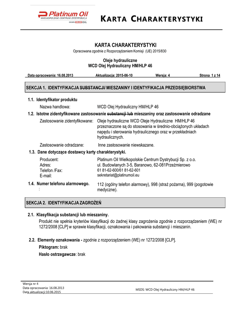 karta charakterystyki - Platinum Oil Wielkopolskie Centrum