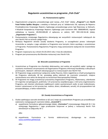 Regulamin uczestnictwa w programie „Fish Club” §1. Postanowienia ogólne 1. Organizatorem programu prowadzonego pod nazwą „Fish Club” [dalej: „Program”] jest North Food Polska Spółka Akcyjna z siedzibą w Kielcach przy al. Solidarności 36, wpisaną do Rejestru Przedsiębiorców Krajowego Rejestru Sądowego prowadzonego przez Sąd Rejonowy w Kielcach, X Wydział Gospodarczy Krajowego Rejestru Sądowego pod numerem KRS: 0000289192, kapitał zakładowy w kwocie: 49.050.000,00 zł opłacony w całości, NIP: 959-150-56-46 [dalej: „Organizator Programu”]. 2. Postanowienia niniejszego Regulaminu obowiązują we wszystkich restauracjach należących do sieci North Fish na terenie całego kraju. 3. Niniejszy Regulamin określa zasady działania Programu, w szczególności prawa i obowiązki Uczestnika w związku z jego udziałem w Programie oraz korzyści, które wynikają z uczestnictwa w Programie. Postanowienia Regulaminu Programu mają zastosowanie wyłącznie do Uczestników Programu. 4. Program rozpoczyna się z dniem 01.03.2015 roku i trwa do odwołania. 5. Program jest przeznaczony dla Klientów restauracji sieci North Fish. §2. Warunki uczestnictwa w Programie 1. Uczestnictwo w Programie ma charakter dobrowolny, jest wolne od wszelkich opłat i polega na uzyskaniu możliwości otrzymywania od Organizatora Programu informacji handlowej o aktualnych promocjach, rabatach i ofertach obowiązujących w restauracjach sieci North Fish. 2. W Programie mogą uczestniczyć wyłącznie osoby fizyczne, które najpóźniej w chwili przystąpienia do Programu ukończyły 18 lat, posiadają pełną zdolność do czynności prawnych, miejsce zamieszkania oraz adres do doręczeń na terytorium Rzeczpospolitej Polskiej. 3. W Programie nie mogą uczestniczyć pracownicy Organizatora Programu, Wykonawcy, członkowie ich organów zarządzających, podmioty i ich pracownicy współpracujący z nimi przy organizowaniu Programu, jak również członkowie najbliższych rodzin wymienionych osób, to jest małżonkowie, krewni i powinowaci w linii prostej (np. rodzice, dzieci, dziadkowie, wnuki), ich przysposobieni lub przysposabiający, a także rodzeństwo. §3. Zasady Uczestnictwa w Programie 1. Osoba spełniająca warunki określone w §2 ust.2 staje się uczestnikiem Programu po prawidłowym wykonaniu następujących czynności [dalej: „Uczestnik”]: a) wypełnienie formularza zgłoszeniowego [dalej: „Formularz”] stanowiącego Załącznik Nr 2 do niniejszego Regulaminu i jego przekazanie kasjerowi w jednej z restauracji North Fish określonych w Załączniku Nr 1 albo b) wypełnienie Formularza www.northfish.pl/fishclub; albo w formie elektronicznej dostępnego na stronie c) złożenie oświadczenia o przystąpieniu do Programu w związku z uczestnictwem w jednym z Konkursów organizowanych przez Organizatora Programu. 2. Uczestnictwo w Programie powstaje z chwilą prawidłowego wykonania czynności określonej w ust.1 i zawarte jest na czas nieokreślony lub do momentu jego wypowiedzenia przez którąkolwiek ze stron. 3. Organizator Programu może w każdym czasie wstrzymać okresowo lub zaniechać przyjmowania dalszych zgłoszeń uczestnictwa w Programie poprzez opublikowanie takiej decyzji na stronie internetowej www.northfish.pl/fishclub. 4. Każdy Uczestnik Programu ma prawo w każdym czasie wypowiedzieć swoje uczestnictwo w Programie w formie pisemnej poprzez: a) przesłanie go na adres Organizatora Programu (North Food Polska Spółka Akcyjna z siedzibą w Kielcach przy al. Solidarności 36, 25-232 Kielce) lub b) złożenie wypowiedzenia obsłudze jednej z restauracji North Fish; c) przesłanie na adres e-mail: [email protected] bez konieczności ponoszenia jakichkolwiek opłat. 5. W przypadku zgłoszenia uczestnictwa w Programie w sposób wskazany w ust.1 pkt a) i b), osoba spełniająca warunki określone w §2ust.2 w celu przystąpienia do Programu wypełnia Formularz poprzez: a) podanie imienia; b) podanie adresu e-mail; c) wyrażenie zgody na przetwarzane danych osobowych przez Organizatora Programu na potrzeby działań marketingowych podejmowanych przez North Food Polska Spółka Akcyjna z siedzibą w Kielcach przy al. Solidarności 36, 25-232 Kielce, wpisaną do Rejestru Przedsiębiorców Krajowego Rejestru Sądowego prowadzonego przez Sąd Rejonowy w Kielcach, X Wydział Gospodarczy Krajowego Rejestru Sądowego pod numerem KRS: 0000289192, kapitał zakładowy w kwocie: 49.050.000 zł opłacony w całości, NIP: 959-150-5646; d) oświadczenie o zapoznaniu się z treścią niniejszego Regulaminu i akceptacji wszystkich jego warunków; e) wyrażenie zgody na otrzymywanie na adres e-mail newslettera od Organizatora Programu, zawierającego informacje handlowe o aktualnych promocjach, rabatach i ofertach Organizatora Programu. 6. Oprócz danych wskazanych w ust.5, osoba spełniająca warunki określone w §2ust.2 może w Formularzu podać również: a) swoje nazwisko b) adres zamieszkania c) numer telefonu kontaktowego. 7. Każdy Uczestnik po prawidłowo dokonanym zgłoszeniu udziału w Programie w jeden ze sposobów określonych w ust.1 otrzymuje na wskazany w adres e-mail kupon rabatowy na jeden z produktów, dań lub zestawów znajdujących się w aktualnie obowiązującej ofercie restauracji North Fish, co będzie dokładnie określone w jego treści 8. Wielkość rabatu, o którym mowa w ust.7 nie będzie przekraczała 25zł, zaś termin jego realizacji będzie zawsze określony w treści kuponu. 9. Fundatorem kuponów, o których mowa w ust.7 jest Organizator Programu. § 4. Polityka Prywatności 1. Podanie przez Uczestnika danych osobowych określonych w §3ust.5 pkt.a)-b) jest dobrowolne, lecz niezbędne do uczestnictwa w Programie. Zarówno dane te, jak i dane określone w §3ust.6 oraz dane podane przy zgłoszeniu udziału w konkursie organizowanym przez Organizatora Programu(w razie zgłoszenia udziału w Programie w sposób określony w §3 ust.1 pkt. c)) 