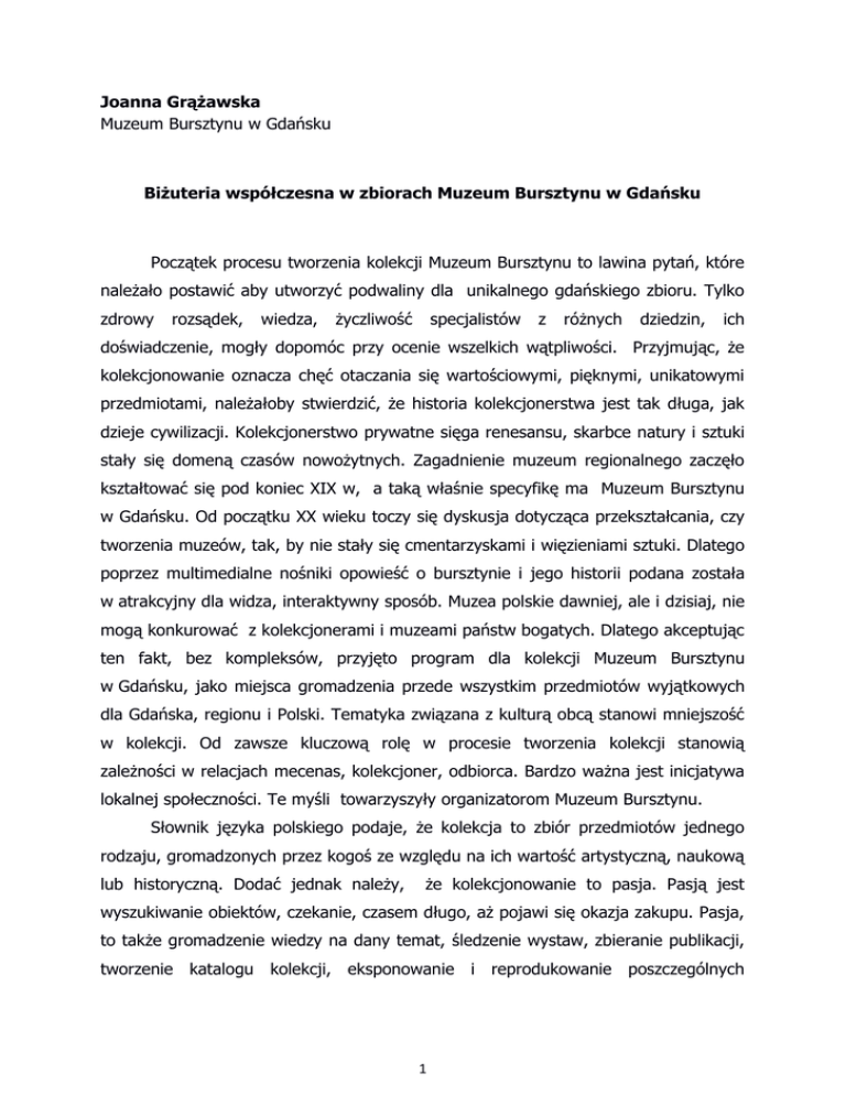 Joanna Grążawska Muzeum Bursztynu w Gdańsku Biżuteria współczesna w zbiorach Muzeum Bursztynu w Gdańsku Początek procesu tworzenia kolekcji Muzeum Bursztynu to lawina pytań, które należało postawić aby utworzyć podwaliny dla unikalnego gdańskiego zbioru. Tylko zdrowy rozsądek, wiedza, życzliwość specjalistów z różnych dziedzin, ich doświadczenie, mogły dopomóc przy ocenie wszelkich wątpliwości. Przyjmując, że kolekcjonowanie oznacza chęć otaczania się wartościowymi, pięknymi, unikatowymi przedmiotami, należałoby stwierdzić, że historia kolekcjonerstwa jest tak długa, jak dzieje cywilizacji. Kolekcjonerstwo prywatne sięga renesansu, skarbce natury i sztuki stały się domeną czasów nowożytnych. Zagadnienie muzeum regionalnego zaczęło kształtować się pod koniec XIX w, a taką właśnie specyfikę ma Muzeum Bursztynu w Gdańsku. Od początku XX wieku toczy się dyskusja dotycząca przekształcania, czy tworzenia muzeów, tak, by nie stały się cmentarzyskami i więzieniami sztuki. Dlatego poprzez multimedialne nośniki opowieść o bursztynie i jego historii podana została w atrakcyjny dla widza, interaktywny sposób. Muzea polskie dawniej, ale i dzisiaj, nie mogą konkurować z kolekcjonerami i muzeami państw bogatych. Dlatego akceptując ten fakt, bez kompleksów, przyjęto program dla kolekcji Muzeum Bursztynu w Gdańsku, jako miejsca gromadzenia przede wszystkim przedmiotów wyjątkowych dla Gdańska, regionu i Polski. Tematyka związana z kulturą obcą stanowi mniejszość w kolekcji. Od zawsze kluczową rolę w procesie tworzenia kolekcji stanowią zależności w relacjach mecenas, kolekcjoner, odbiorca. Bardzo ważna jest inicjatywa lokalnej społeczności. Te myśli towarzyszyły organizatorom Muzeum Bursztynu. Słownik języka polskiego podaje, że kolekcja to zbiór przedmiotów jednego rodzaju, gromadzonych przez kogoś ze względu na ich wartość artystyczną, naukową lub historyczną. Dodać jednak należy, że kolekcjonowanie to pasja. Pasją jest wyszukiwanie obiektów, czekanie, czasem długo, aż pojawi się okazja zakupu. Pasja, to także gromadzenie wiedzy na dany temat, śledzenie wystaw, zbieranie publikacji, tworzenie katalogu kolekcji, eksponowanie i reprodukowanie poszczególnych 1 skarbów. Wreszcie pasja, to także obecność w świecie związanym z danym tematem, kontakt z artystami, kolekcjonerami, antykwariatami, muzeami, galeriami, targami, naukowcami, bursztynnikami i bursztyniarzami. Analiza historii gdańskich zbiorów bursztynu czy innych regionalnych kolekcji pozwoliła przyjąć dla nowego muzeum koncepcję utworzenia trzech zasadniczych działów; przyrodniczego, sztuki dawnej oraz rzemiosła i wzornictwa współczesnego. Jest to podział ogólny, bowiem dla każdej z przyjętych grup obiektów stosowana jest bardziej szczegółowa kwalifikacja merytoryczna. Zbiory muzeum opracowywane są w kilku grupach tematycznych; inkluzji, form naturalnych, odmian barwnych bursztynu bałtyckiego, żywic kopalnych, archeologii, sztuki nowożytnej, przedmiotów użytkowych z XIX i XX wieku, współczesnej biżuterii oraz innych. Granice pomiędzy sztuką dawną a współczesną wyznacza w kolekcji rok 1945. Aktualnie, zespół pracowników Muzeum Bursztynu kończy cyfrowe opracowanie zbiorów, które realizowane jest w systemie Musnet. Dla potrzeb dokumentacji kolekcji zastosowano dwa typy kart katalogu naukowego, dla naturaliów oraz sztuki użytkowej. W przyszłości, korzystając z internetu, będzie można samodzielnie przejrzeć katalog zbiorów. Tworzenie kolekcji to wieloletni proces. Kolekcja Muzeum Bursztynu powstaje od czternastu lat co, w szerszej perspektywie, kwalifikuje ten zbiór jako rozwijający się. Od początku, dla merytorycznej działalności muzeum, biżuteria współczesna traktowana była jako ważna dziedzina. Już w pierwszym, opracowanym w 2000 r. planie zagospodarowania funkcjonalno – przestrzennego dla budynku, mającego zostać siedzibą nowej placówki kultury, wyznaczono dwie najwyższe kondygnacje na przestrzeń dla wystawy stałej, prezentującej biżuterię. Niedysponowano wówczas żadnymi obiektami, ale przyjęto, że będą one gromadzone. Tradycje regionu, ale również współczesna aktywność i rozwój tej dyscypliny, warunkowały realizację idei stałego prezentowania i promowania współczesnej biżuterii. Zwiedzający muzeum często dzielą się uwagami bardzo pozytywnego odbioru współczesnej biżuterii, są zaskoczeni wzornictwem. To uzmysławia nam, że powszechnie utrwalony jest w świadomości odbiorców stereotyp o pamiątkarskim i masowym wizerunku bursztynowej biżuterii. Oznacza to, że promocja dobrej współczesnej biżuterii z bursztynem jest bardzo potrzebna. 2 Uczestnictwo w organizowanych corocznie Targach Biżuterii i Kamieni Jubilerskich – Amberif, umożliwiły bezpośredni kontakt z artystami, który stał się kluczowy dla budowania kolekcji biżuterii. Przyznać trzeba , że rozmowy dotyczące pozyskiwania obiektów do kolekcji nie są proste. O ile pokolenie tworzące jeszcze w czasach PRL-u docenia, fakt prezentacji swoich prac w muzeum, to młodsza generacja artystów zazwyczaj nie traktuje takiej oferty prestiżowo, dobrze, że zdarzają się wyjątki. Nieocenione zaangażowanie Ewy Rachoń, dyrektora projektów Amberif i Ambermart, ma szczególny wpływ na tworzenie kolekcji sztuki współczesnej w gdańskim Muzeum Bursztynu. Od momentu powołania muzeum przekazuje ona, jako dary, biżuterię własną oraz skutecznie namawia artystów i bursztynników, aby włączali się w proces budowania kolekcji. Kontakt osobisty i współpraca w trakcie organizowania wystaw zbiorowych czy indywidualnych, a czasem jedynie wizyta na ekspozycji, zmienia pogląd na prezentowanie własnych prac w muzeum, co owocuje nowymi nabytkami w kolekcji. Pozyskana biżuteria jest bardzo różnorodna, ale właśnie taki efekt chcieliśmy uzyskać. Posiadamy przykłady
