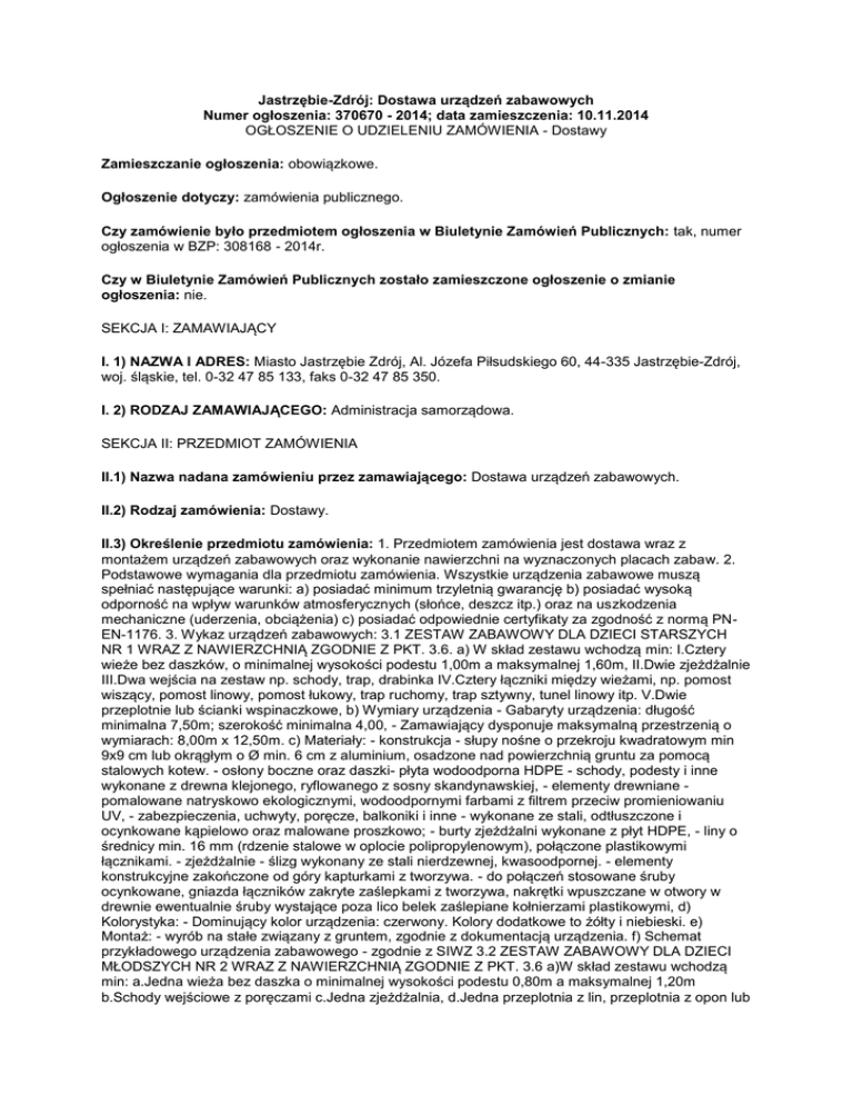 Jastrzębie-Zdrój: Dostawa urządzeń zabawowych Numer ogłoszenia: 370670 - 2014; data zamieszczenia: 10.11.2014 OGŁOSZENIE O UDZIELENIU ZAMÓWIENIA - Dostawy Zamieszczanie ogłoszenia: obowiązkowe. Ogłoszenie dotyczy: zamówienia publicznego. Czy zamówienie było przedmiotem ogłoszenia w Biuletynie Zamówień Publicznych: tak, numer ogłoszenia w BZP: 308168 - 2014r. Czy w Biuletynie Zamówień Publicznych zostało zamieszczone ogłoszenie o zmianie ogłoszenia: nie. SEKCJA I: ZAMAWIAJĄCY I. 1) NAZWA I ADRES: Miasto Jastrzębie Zdrój, Al. Józefa Piłsudskiego 60, 44-335 Jastrzębie-Zdrój, woj. śląskie, tel. 0-32 47 85 133, faks 0-32 47 85 350. I. 2) RODZAJ ZAMAWIAJĄCEGO: Administracja samorządowa. SEKCJA II: PRZEDMIOT ZAMÓWIENIA II.1) Nazwa nadana zamówieniu przez zamawiającego: Dostawa urządzeń zabawowych. II.2) Rodzaj zamówienia: Dostawy. II.3) Określenie przedmiotu zamówienia: 1. Przedmiotem zamówienia jest dostawa wraz z montażem urządzeń zabawowych oraz wykonanie nawierzchni na wyznaczonych placach zabaw. 2. Podstawowe wymagania dla przedmiotu zamówienia. Wszystkie urządzenia zabawowe muszą spełniać następujące warunki: a) posiadać minimum trzyletnią gwarancję b) posiadać wysoką odporność na wpływ warunków atmosferycznych (słońce, deszcz itp.) oraz na uszkodzenia mechaniczne (uderzenia, obciążenia) c) posiadać odpowiednie certyfikaty za zgodność z normą PNEN-1176. 3. Wykaz urządzeń zabawowych: 3.1 ZESTAW ZABAWOWY DLA DZIECI STARSZYCH NR 1 WRAZ Z NAWIERZCHNIĄ ZGODNIE Z PKT. 3.6. a) W skład zestawu wchodzą min: I.Cztery wieże bez daszków, o minimalnej wysokości podestu 1,00m a maksymalnej 1,60m, II.Dwie zjeżdżalnie III.Dwa wejścia na zestaw np. schody, trap, drabinka IV.Cztery łączniki między wieżami, np. pomost wiszący, pomost linowy, pomost łukowy, trap ruchomy, trap sztywny, tunel linowy itp. V.Dwie przeplotnie lub ścianki wspinaczkowe, b) Wymiary urządzenia - Gabaryty urządzenia: długość minimalna 7,50m; szerokość minimalna 4,00, - Zamawiający dysponuje maksymalną przestrzenią o wymiarach: 8,00m x 12,50m. c) Materiały: - konstrukcja - słupy nośne o przekroju kwadratowym min 9x9 cm lub okrągłym o Ø min. 6 cm z aluminium, osadzone nad powierzchnią gruntu za pomocą stalowych kotew. - osłony boczne oraz daszki- płyta wodoodporna HDPE - schody, podesty i inne wykonane z drewna klejonego, ryflowanego z sosny skandynawskiej, - elementy drewniane pomalowane natryskowo ekologicznymi, wodoodpornymi farbami z filtrem przeciw promieniowaniu UV, - zabezpieczenia, uchwyty, poręcze, balkoniki i inne - wykonane ze stali, odtłuszczone i ocynkowane kąpielowo oraz malowane proszkowo; - burty zjeżdżalni wykonane z płyt HDPE, - liny o średnicy min. 16 mm (rdzenie stalowe w oplocie polipropylenowym), połączone plastikowymi łącznikami. - zjeżdżalnie - ślizg wykonany ze stali nierdzewnej, kwasoodpornej. - elementy konstrukcyjne zakończone od góry kapturkami z tworzywa. - do połączeń stosowane śruby ocynkowane, gniazda łączników zakryte zaślepkami z tworzywa, nakrętki wpuszczane w otwory w drewnie ewentualnie śruby wystające poza lico belek zaślepiane kołnierzami plastikowymi, d) Kolorystyka: - Dominujący kolor urządzenia: czerwony. Kolory dodatkowe to żółty i niebieski. e) Montaż: - wyrób na stałe związany z gruntem, zgodnie z dokumentacją urządzenia. f) Schemat przykładowego urządzenia zabawowego - zgodnie z SIWZ 3.2 ZESTAW ZABAWOWY DLA DZIECI MŁODSZYCH NR 2 WRAZ Z NAWIERZCHNIĄ ZGODNIE Z PKT. 3.6 a)W skład zestawu wchodzą min: a.Jedna wieża bez daszka o minimalnej wysokości podestu 0,80m a maksymalnej 1,20m b.Schody wejściowe z poręczami c.Jedna zjeżdżalnia, d.Jedna przeplotnia z lin, przeplotnia z opon lub przeplotnia z drążków. e.Jedna ścianka wspinaczkowa b) Wymiary urządzenia - gabaryty urządzenia: długość minimalna 3,00m, szerokość minimalna 2,00m, - Zamawiający dysponuje maksymalną przestrzenią o wymiarach: 6,00m x 7,00m c) Materiały: - konstrukcja - słupy nośne o przekroju kwadratowym min. 9x9 cm lub okrągłym o średnicy min. 6 cm z aluminium, osadzone nad powierzchnią gruntu za pomocą stalowych kotew. - osłony boczne oraz daszki- płyta wodoodporna HDPE - schody, podesty i inne wykonane z drewna klejonego, ryflowanego z sosny skandynawskiej, elementy drewniane - pomalowane natryskowo ekologicznymi, wodoodpornymi farbami z filtrem przeciw promieniowaniu UV, - zabezpieczenia, uchwyty, poręcze, balkoniki i inne - wykonane ze stali, odtłuszczone i ocynkowane kąpielowo oraz malowane proszkowo - burty zjeżdżalni wykonane z płyt HDPE, - przeplotnia z lin - liny o średnicy min. 16 mm (rdzenie stalowe w oplocie polipropylenowym), połączone plastikowymi łącznikami - zjeżdżalnie - ślizg wykonany ze stali nierdzewnej, kwasoodpornej. - elementy konstrukcyjne zakończone od góry kapturkami z tworzywa - do połączeń stosowane śruby ocynkowane, gniazda łączników zakryte zaślepkami z tworzywa, nakrętki wpuszczane w otwory w drewnie ewentualnie śruby wystające poza lico belek zaślepiane kołnierzami plastikowymi, d) Kolorystyka: - Dominujący kolor urządzenia: czerwony. Kolory dodatkowe to żółty i niebieski. e) Montaż: - wyrób na stałe związany z gruntem, zgodnie z dokumentacją urządzenia. f) Schemat przykładowego urządzenia zabawowego - zgodnie z SIWZ 3.3 ZESTAW ZABAWOWY DLA DZIECI MŁODSZYCH NR 3. a) W skład zestawu wchodzą I.Trzy wieże, z czego: jedna wieża z daszkiem o minimalnej wysokości podestu 1,40m a maksymalnej 1,60m, druga wieża bez daszku ze ścianką wspinaczkową o minimalnej wysokości podestu 1,40m a maksymalnej 1,60m, trzecia wieża bez daszku ze ślizgiem o minimalnej wysokości podestu 0,80m a maksymalnej 1,10m, II.Dwa wejścia na urządzenie, w tym jedne schodki wejściowe z poręczami, drugie wejście typu trap, drabinka, wejście lub koci grzbiet; III.Jeden łącznik między wieżami np.