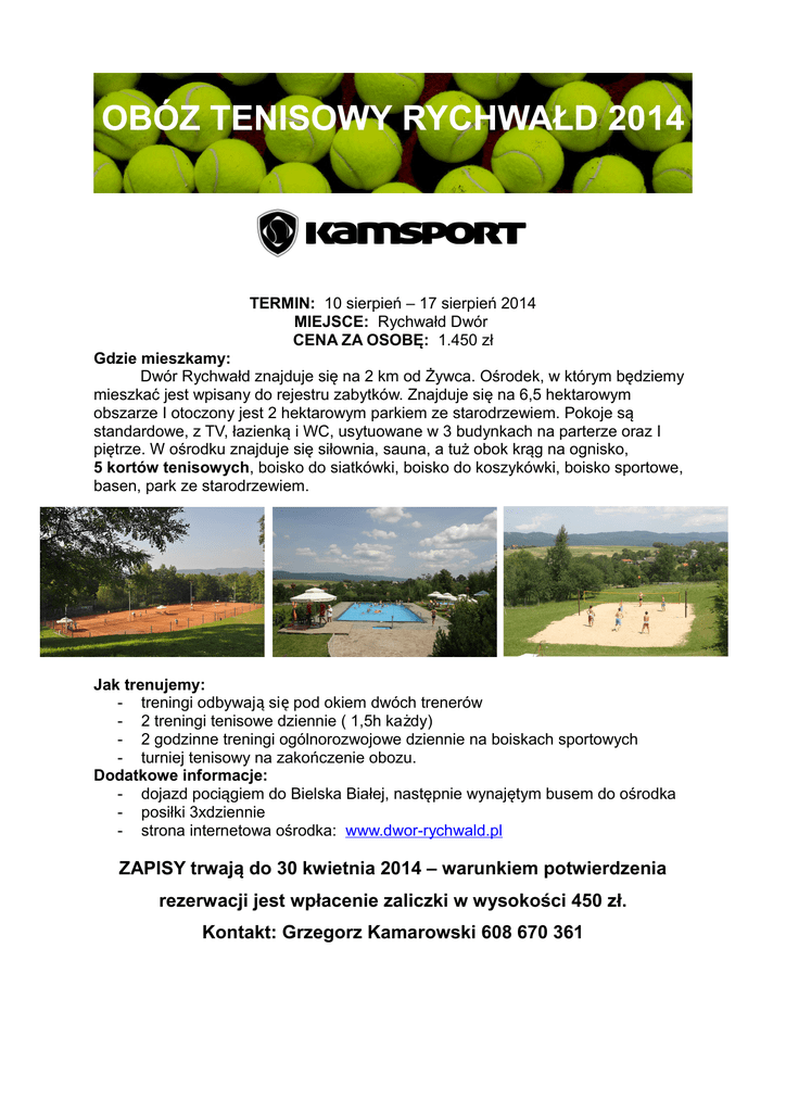 OBÓZ TENISOWY RYCHWAŁD 2014 TERMIN: 10 sierpień – 17 sierpień 2014 MIEJSCE: Rychwałd Dwór CENA ZA OSOBĘ: 1.450 zł Gdzie mieszkamy: Dwór Rychwałd znajduje się na 2 km od Żywca. Ośrodek, w którym będziemy mieszkać jest wpisany do rejestru zabytków. Znajduje się na 6,5 hektarowym obszarze I otoczony jest 2 hektarowym parkiem ze starodrzewiem. Pokoje są standardowe, z TV, łazienką i WC, usytuowane w 3 budynkach na parterze oraz I piętrze. W ośrodku znajduje się siłownia, sauna, a tuż obok krąg na ognisko, 5 kortów tenisowych, boisko do siatkówki, boisko do koszykówki, boisko sportowe, basen, park ze starodrzewiem. Jak trenujemy: - treningi odbywaj ą si ę pod okiem dwóch trenerów - 2 treningi tenisowe dziennie ( 1,5h każdy) - 2 godzinne treningi ogólnorozwojowe dziennie na boiskach sportowych - turniej tenisowy na zakończenie obozu. Dodatkowe informacje: - dojazd pociągiem do Bielska Białej, następnie wynajętym busem do ośrodka - posiłki 3xdziennie - strona internetowa ośrodka: www.dwor-rychwald.pl ZAPISY trwają do 30 kwietnia 2014 – warunkiem potwierdzenia rezerwacji jest wpłacenie zaliczki w wysokości 450 zł. Kontakt: Grzegorz Kamarowski 608 670 361