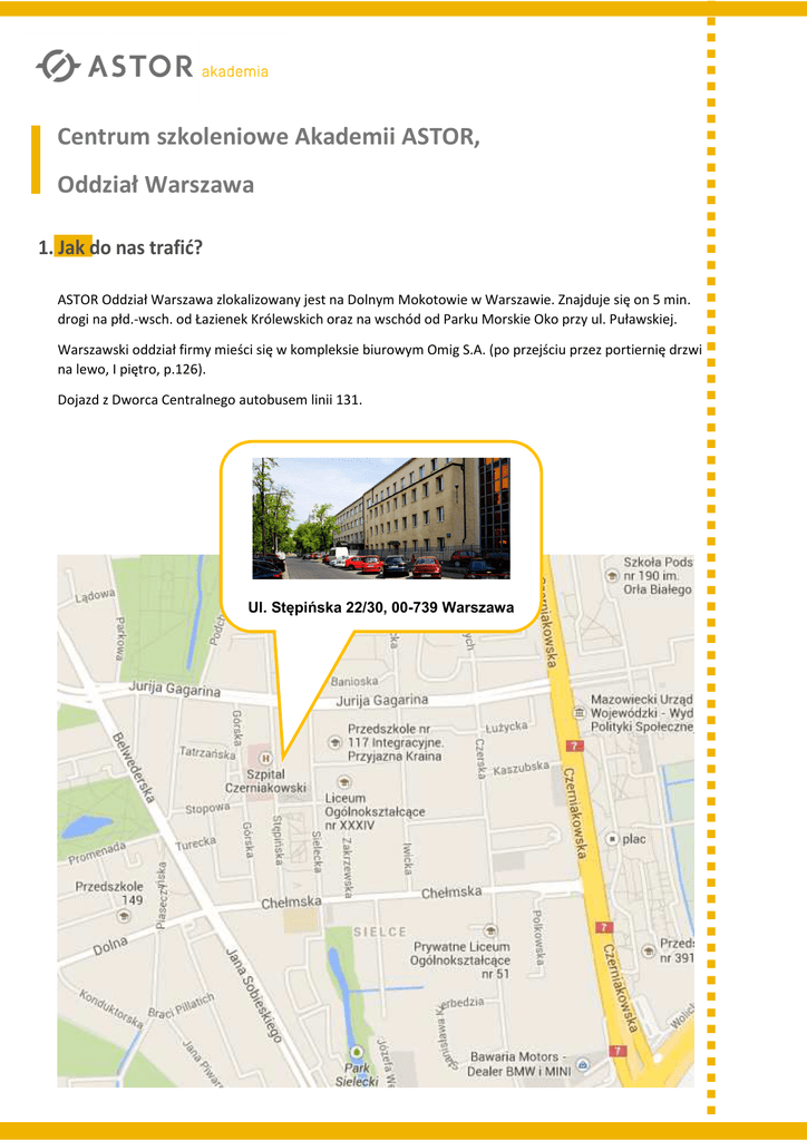 Centrum szkoleniowe Akademii ASTOR, Oddział Warszawa 1. Jak do nas trafić? ASTOR Oddział Warszawa zlokalizowany jest na Dolnym Mokotowie w Warszawie. Znajduje się on 5 min. drogi na płd.-wsch. od Łazienek Królewskich oraz na wschód od Parku Morskie Oko przy ul. Puławskiej. Warszawski oddział firmy mieści się w kompleksie biurowym Omig S.A. (po przejściu przez portiernię drzwi na lewo, I piętro, p.126). Dojazd z Dworca Centralnego autobusem linii 131. Ul. Stępińska 22/30, 00-739 Warszawa 2. Polecane hotele Centrum konferencyjno-szkoleniowe Hotel Belwederski*** Fundacja Nowe Horyzonty ul. Sulkiewicza 11, Warszawa tel. 22/840 40 11, fax 22/840 08 47 Warszawa, ul. Bobrowiecka 9 Strona: www.hotelbelwederski.pl/belwederski/index.html tel.: 22/559 22 01, tel. kom. 604 066 579 e-mail: [email protected] Strona: www.centrumkonferencyjne.com.pl Ceny Ceny Pokój 1-osobowy – 290 PLN ze śniadaniem, Pokój 1-osobowy – 215 PLN ze śniadaniem, Pokój 2-osobowy – 340 PLN ze śniadaniem, Pokój 2-osobowy – 230 PLN ze śniadaniem, Brak parkingu. Parking dla gości hotelu – 15 zł/dobę e-mail: [email protected] Reytan Hotel Warszawa*** Hotel DeSilva** ul. Kubickiego 3, Warszawa tel. 22/550 61 00 recepcja, Fax: 22/642 23 89 e-mail: [email protected] Strona:www.desilva.pl ul. Rejtana 6, Warszawa Tel. 22/201 64 00, fax. 22/646 29 89 e-mail: [email protected] Strona:www.reytan.pl/index.html Ceny Pokój 1-osobowy – 205 PLN ze śniadaniem, cena w tyg. Pokój 2-osobowy – 270 PLN ze śniadaniem, cena w tyg. Ceny Pokój 1-osobowy – max. 340 PLN ze śniadaniem Pokój 2-osobowy – max. 370 PLN ze śniadaniem Parking nieodpłatny. Parking płatny 45 zł/dobę Hotel Karat*** ul. Słoneczna 37, Warszawa tel. 22/849 84 54, 22/849 33 19, 22/849 15 89 e-mail: [email protected] Strona: www.hotelkarat.pl Hotel Łazienkowski*** ul. 29 Listopada 3b, Warszawa tel. 22 851 02 32/33 - recepcja e-mail: [email protected] Strona: www.lazienkowski.pl Ceny Ceny Pokój 1- osobowy – 180 PLN ze śniadaniem, cena w tygodniu Pokój 2- osobowy – 230 PLN ze śniadaniem, cena w tygodniu Parking, monitorowany, nieodpłatny. Pokój 1-osobowy – 230 PLN ze śniadaniem, Pokój 2-osobowy – 300 PLN ze śniadaniem Cena parkingu: godzina - 2,00 PLN, doba - 12,00 PLN Ibis Budget Hotel ul. Zagórna 1, Warszawa; tel. 22/7453660 strona: http://www.accorhotels.com/pl/hotel-6401-ibis-budget-warszawa-centrum-przedtem-etap-hotel/index.shtml Ceny Pokój 1-osobowy – max. 240 PLN bez śniadania; Pokój 2-osobowy – max. 240 PLN bez śniadania Śniadanie - 24 zł/osoba; Parking - 25 zł/doba Do zobaczenia, Zespół Akademii ASTOR [email protected] więcej na: www.akademia.astor.com.pl