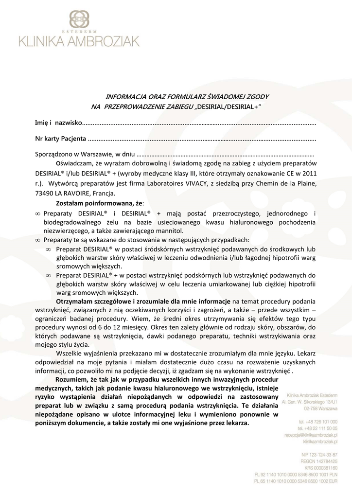 INFORMACJA ORAZ FORMULARZ ŚWIADOMEJ ZGODY NA PRZEPROWADZENIE ZABIEGU „DESIRIAL/DESIRIAL+“ Imię i nazwisko…………………………………………………………..........………………………….……………………… Nr karty Pacjenta …………………………………………………………...….........………………..………………………… Sporządzono w Warszawie, w dniu ………………………………………………………………………………………………. Oświadczam, że wyrażam dobrowolną i świadomą zgodę na zabieg z użyciem preparatów DESIRIAL® i/lub DESIRIAL® + (wyroby medyczne klasy III, które otrzymały oznakowanie CE w 2011 r.). Wytwórcą preparatów jest firma Laboratoires VIVACY, z siedzibą przy Chemin de la Plaine, 73490 LA RAVOIRE, Francja. Zostałam poinformowana, że: • Preparaty DESIRIAL® i DESIRIAL® + mają postać przezroczystego, jednorodnego i biodegradowalnego żelu na bazie usieciowanego kwasu hialuronowego pochodzenia niezwierzęcego, a także zawierającego mannitol. • Preparaty te są wskazane do stosowania w następujących przypadkach: • Preparat DESIRIAL® w postaci śródskórnych wstrzyknięć podawanych do środkowych lub głębokich warstw skóry właściwej w leczeniu odwodnienia i/lub łagodnej hipotrofii warg sromowych większych. • Preparat DESIRIAL® + w postaci wstrzyknięć podskórnych lub wstrzyknięć podawanych do głębokich warstw skóry właściwej w celu leczenia umiarkowanej lub ciężkiej hipotrofii warg sromowych większych. Otrzymałam szczegółowe i zrozumiałe dla mnie informacje na temat procedury podania wstrzyknięć, związanych z nią oczekiwanych korzyści i zagrożeń, a także – przede wszystkim – ograniczeń badanej procedury. Wiem, że średni okres utrzymywania się efektów tego typu procedury wynosi od 6 do 12 miesięcy. Okres ten zależy głównie od rodzaju skóry, obszarów, do których podawane są wstrzyknięcia, dawki podanego preparatu, techniki wstrzykiwania oraz mojego stylu życia. Wszelkie wyjaśnienia przekazano mi w dostatecznie zrozumiałym dla mnie języku. Lekarz odpowiedział na moje pytania i miałam dostatecznie dużo czasu na rozważenie uzyskanych informacji, co pozwoliło mi na podjęcie decyzji, iż zgadzam się na wykonanie wstrzyknięć . Rozumiem, że tak jak w przypadku wszelkich innych inwazyjnych procedur medycznych, takich jak podanie kwasu hialuronowego we wstrzyknięciu, istnieje ryzyko wystąpienia działań niepożądanych w odpowiedzi na zastosowany preparat lub w związku z samą procedurą podania wstrzyknięcia. Te działania niepożądane opisano w ulotce informacyjnej leku i wymieniono ponownie w poniższym dokumencie, a także zostały mi one wyjaśnione przez lekarza. • Reakcje zapalne takie jak zaczerwienienie, opuchlizna, obrzęk, wysypka skórna itp., którym może towarzyszyć świąd i/lub ból w miejscu podania wstrzyknięcia. Te reakcje niepożądane ustępują zazwyczaj po kilku dniach. • Stwardnienie lub guzek, przebarwienie lub odbarwienie skóry w miejscu podania wstrzyknięcia. • Niewielkie krwawienie w miejscu podania wstrzyknięcia. • Ból po podaniu wstrzyknięcia. • Krwiaki. Zostałam poinformowana, że w literaturze opisano rzadko występujące przypadki ropnia, martwicy, ziarniniaków i nadwrażliwości po podaniu kwasu hialuronowego we wstrzyknięciu w skórę twarzy. Zobowiązuję się do natychmiastowego i osobistego skontaktowania się z zespołem badawczym w przypadku wystąpienia u mnie zdarzenia niepożądanego po moim powrocie do domu. Zobowiązuję się do poinformowania lekarza o wystąpieniu któregokolwiek z działań niepożądanych, w przypadku jego utrzymywania się przez okres dłuższy niż jeden tydzień i/lub o wystąpieniu jakiegokolwiek innego zdarzenia niepożądanego. Lekarz zapewni pacjentce wszelką konieczną pomoc umożliwiającą złagodzenie ewentualnych działań niepożądanych, a także – możliwie jak najszybciej – powiadomi dystrybutora lub wytwórcę leku badanego o wystąpieniu takich działań niepożądanych. Oświadczam, że nie zataiłam przed zespołem badawczym żadnych informacji dotyczących mojego wywiadu chorobowego lub chirurgicznego, bądź przyjmowanych przeze mnie leków. W celu zmniejszenia ryzyka krwotoku, zobowiązuję się do niestosowania żadnych leków przeciwzapalnych lub preparatów zawierających aspirynę w ciągu 24 godzin poprzedzających podanie wstrzyknięcia i poszczególne wizyty kontrolne, tak aby nie zakłócić pomiarów oceniających efekty leczenia. Niniejszym zaświadczam, że: • Nie jestem w ciąży i nie karmię dziecka piersią. • Nie występują u mnie żadne zaburzenia gojenia (blizna hipertroficzna itp.). • Nie występują u mnie żadne zapalne lub zakaźne choroby skóry na obszarze lub w pobliżu obszaru, który zostanie poddany leczeniu, a w szczególności żadne uprzednio istniejące zakażenia sromu lub pochwy w miejscu podania wstrzyknięcia, które są pochodzenia wirusowego (np. brodawczak, opryszczka), bakteryjnego lub grzybiczego. • W przeszłości nie wszczepiano u mnie trwałych lub półtrwałych implantów śródskórnych. • Nie stosowano u mnie żadnych resorbowalnych implantów śródskórnych w miejscu, które zostanie poddane leczeniu. • Nie występuje u mnie potwierdzona nadwrażliwość na którykolwiek ze składników preparatu badanego (kwas hialuronowy, mannitol). • Nie stosuję obecnie żadnego leczenia przeciwkrzepliwego. • Nie występuje u mnie żadne schorzenie tarczycy, ani choroba autoimmunologiczna, a także nie stosuję obecnie żadnego leczenia z powodu tych chorób. Wyrażam zgodę na leczenie prowadzone przez lekarza oraz zobowiązuję się do przestrzegania jego zaleceń. W szczególności zobowiązuję się do: • Nieprzebywania w zatłoczonych i/lub wilgotnych miejscach (basenach, salach sportowych, łaźniach tureck