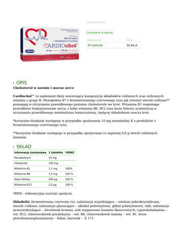 suplement diety Cholesterol w normie Opakowanie Cena 30 tabletek 35.00 zł OPIS Cholesterol w normie i mocne serce Cardiochol™ to suplement diety zawierający kompozycję składników roślinnych oraz wybranych witamin z grupy B. Monakolina K* z fermentowanego czerwonego ryżu jak również sterole roślinne** pomagają w utrzymaniu prawidłowego poziomu cholesterolu we krwi. Witamina B1 wspomaga prawidłowe funkcjonowanie serca, z kolei witaminy B6, B12 oraz kwas foliowy uczestniczą w utrzymaniu prawidłowego metabolizmu homocysteiny, będącej składnikiem osocza krwi. *korzystne działanie występuje w przypadku spożywania 10 mg monakoliny K z produktów z fermentowanego czerwonego ryżu; **korzystne działanie występuje w przypadku spożywania co najmniej 0,8 g steroli roślinnych dziennie. SKŁAD Informacja żywieniowa 1 tabletka %RWS Monakolina K 10 mg Fitosterole 150 mg Witamina B1 1,1 mg 100% Witamina B6 1,4 mg 100 % Kwas foliowy 200 µg 100 % Witamina B12 2,5 µg 100 % *RWS - referencyjna wartość spożycia. Składniki: fermentowany czerwony ryż, substancja wypełniająca – celuloza mikrokrystaliczna, sterole roślinne, substancje glazurujące – alkohol poliwinylowy, glikol polietylenowy, talk; substancje przeciwzbrylające – dwutlenek krzemu, sole magnezowe kwasów tłuszczowych; cyjanokobalamina – wit. B12, chlorowodorek pirydoksyny – wit. B6, chlorowodorek tiaminy – wit. B1, kwas pteroilomonoglutaminowy – folian, barwnik – E 171. PRZEZNACZENIE Preparat przeznaczony: jako suplement diety dla osób dorosłych dbających o serce i układ krążenia, dążących do utrzymania prawidłowego poziomu cholesterolu we krwi. DAWKOWANIE Zalecana dzienna porcja: 1 tabletka podczas posiłku. Nie należy przekraczać zalecanej dziennej porcji do spożycia w ciągu dnia. Suplement diety nie może być stosowany jako substytut zróżnicowanej diety. Zalecany jest zrównoważony sposób żywienia i zdrowy tryb życia.