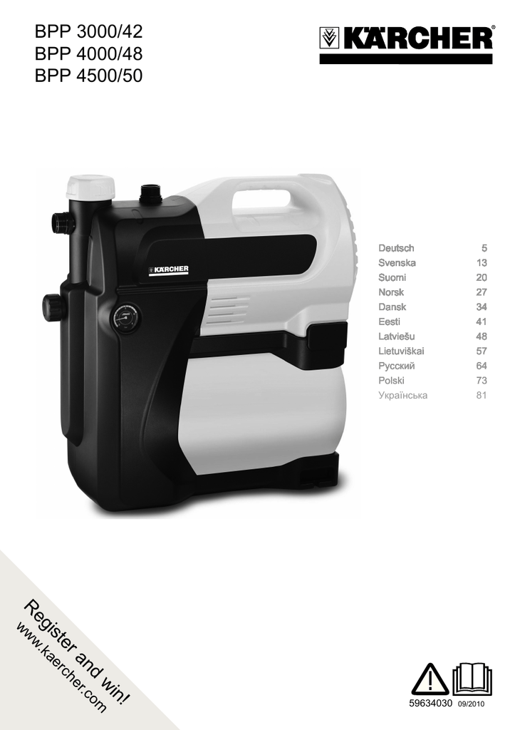 BPP 3000/42 BPP 4000/48 BPP 4500/50 Deutsch Svenska Suomi Norsk Dansk Eesti Latviešu Lietuviškai Русский Polski Українська R e w gis w w. te ka r a er n ch d er .c w in ! om 59634030 5 13 20 27 34 41 48 57 64 73 81 09/2010 2 2 3 3 6.997-350.0 / 6.997-349.0 6.997-348.0 6.997-360.0 6.997-345.0 / 6.997-342.0 4 6.997-347.0 / 6.997-346.0 6.997-341.0 6.997-343.0 / 6.997-344.0 6.997-359.0 6.997-355.0 6.997-356.0 6.997-358.0 6.997-340.0 6.997-417.0 4 Sehr geehrter Kunde, Lesen Sie vor der ersten Benutzung Ihres Gerätes diese Originalbetriebsanleitung, handeln Sie danach und bewahren Sie diese für späteren Gebrauch oder für Nachbesitzer auf. Bestimmungsgemäße Verwendung Dieses Gerät wurde für den privaten Gebrauch entwickelt und ist nicht für die Beanspruchungen des gewerblichen Einsatzes vorgesehen. Der Hersteller haftet nicht für eventuelle Schäden, die durch nicht bestimmungsgemäßen Gebrauch oder falsche Bedienung verursacht werden. Das Gerät ist zum Einsatz als Hauswasserwerk bestimmt. Beim Einsatz der Pumpe zur Druckverstärkung darf der max. Zuleitungsdruck von 1,0 bar (Pumpeneintritt) nicht überschritten werden. Zugelassene Förderflüssigkeiten: Brauchwasser Brunnenwasser Quellwasser Regenwasser Schwimmbadwasser (bestimmungsgemäße Dosierung der Additive vorausgesetzt) 몇 Achtung Das Gerät ist nicht für den Transport von Wasser für den menschlichen Gebrauch bestimmt. Nicht gefördert werden dürfen ätzende, leicht brennbare oder explosive Stoffe (z.B. Benzin, Petroleum, Nitroverdünnung), Fette, Öle, Salzwasser und Abwasser aus Toilettenanlagen und verschlammtes Wasser, das eine geringere Fließfähigkeit als Wasser hat. Die Temperatur der geförderten Flüssigkeit darf 35°C nicht überschreiten. Umweltschutz Die Verpackungsmaterialien sind recyclebar. Bitte werfen Sie die Verpackungen nicht in den Hausmüll, sondern führen Sie diese einer Wiederverwertung zu. Altgeräte enthalten wertvolle recyclingfähige Materialien, die einer Verwertung zugeführt werden sollten. Bitte entsorgen Sie Altgeräte deshalb über geeignete Sammelsysteme. Hinweise zu Inhaltsstoffen (REACH) Aktuelle Informationen zu Inhaltsstoffen finden Sie unter: http://www.karcher.de/de/unternehmen/ umweltschutz/REACH.htm Garantie In jedem Land gelten die von unserer zuständigen Vertriebsgesellschaft herausgegebenen Garantiebedingungen. Etwaige Störungen an Ihrem Gerät beseitigen wir innerhalb der Garantiefrist kostenlos, sofern ein Material- oder Herstellungsfehler die Ursache sein sollte. Im Garantiefall wenden Sie sich bitte mit Kaufbeleg an Ihren Händler oder die nächste autorisierte Kundendienststelle. Sicherheitshinweise Lebensgefahr Bei Nichtbeachtung der Sicherheitshinweise besteht Lebensgefahr durch elektrischen Strom! Anschlussleitung mit Netzstecker vor jedem Betrieb auf Schäden prüfen. Beschädigte Anschlussleitung unverzüglich durch autorisierten Kundendienst/ Elektro-Fachkraft austauschen lassen. Alle elektrischen Steckerverbindungen sind im überflutungssicheren Bereich anzubringen. Nicht am Netzanschlusskabel, sondern am Stecker ziehen, um das Gerät vom Netz zu trennen. Deutsch Deutsch 5 5 Das Netzanschlusskabel nicht über scharfe Kanten ziehen und nicht einquetschen. Das Gerät stand- und überflutungssicher aufstellen. Die angegebene Spannung auf dem Typenschild muss mit der Spannung der Stromquelle übereinstimmen. Um Gefährdungen zu vermeiden, dürfen Reparaturen und der Einbau von Ersatzteilen nur vom autorisierten Kundendienst durchgeführt werden. Bei fehlender Wasserzufuhr schaltet die Pumpe nicht ab. Das Wasser in der Pumpe erhitzt sich und kann bei Austritt zu Verletzungen führen! Pumpe max. 3 Minuten in diesem Betriebszustand betreiben. Tipp: Trockenlaufsicherung (6.997355.0), Schwimmerschalter (6.997356.0) optional erhältlich! Die Pumpe darf nicht als Tauchpumpe verwendet werden. Bei Verwendung der Pumpe an Schwimmbecken, Gartenteichen oder Springbrunnen einen Mindestabstand von 2m einhalten und Gerät gegen Abrutschen ins Wasser sichern. Elektrische Schutzeinrichtungen beachten: Pumpen dürfen an Schwimmbecken, Gartenteichen und Springbrunnen nur über einen Fehlerstromschutzschalter mit einem Nennfehlerstrom von max. 30mA betrieben werden. Wenn sich Personen im Schwimmbecken oder Gartenteich befinden, darf die Pumpe nicht betrieben werden. Aus Sicherheitsgründen empfehlen wir grundsätzlich, das Gerät über einen Fehlerstromschutzschalter (max. 30mA) zu betreiben. Der elektrische Anschluss darf nur von einer Elektrofachkraft vorgenommen werden. Die nationalen Bestimmungen hierzu sind unbedingt zu beachten! 6 Deutsch 6 Deutsch In Österreich müssen Pumpen zum Gebrauch an Schwimmbecken und Gartenteichen, die mit einer festen Anschlussleitung ausgestattet sind, nach ÖVE B/EN 60555 Teil 1 bis 3, über einen ÖVE-geprüften Trenn-Transformator gespeist werden, wobei die Nennspannung sekundär 230V nicht überschreiten darf. Dieses Gerät ist nicht dafür bestimmt, durch Personen (einschließlich Kinder) mit eingeschränkten physischen, sensorischen oder geistigen Fähigkeiten oder mangels Erfahrung und/oder mangels Wissen benutzt zu werden, es sei denn, sie werden durch eine für ihre Sicherheit zuständige Person beaufsichtigt oder erhielten von ihr Anweisungen, wie das Gerät zu benutzen ist. Kinder sollten beaufsichtigt werden, um sicherzustellen, dass sie nicht mit dem Gerät spielen. Inbetriebnahme Vor Inbetriebnahme der Pumpe sind unbedingt die Sicherheitshinweise zu beachten! Gerätebeschreibung 1 2 3 4 5 6 7 Netzanschlusskabel mit Stecker Anschluss G1 (33,3 mm) Saugleitung Anschluss G1 (33,3 mm) Druckleitung Einfüllstutzen mit Vorfilter Druckanzeige Ablassöffnung Rückschlagventil Vorbereiten Abbildung Î Vor Inbetriebnahme Druck der Luftfüllung im Speicherkessel prüfen. Ggf. im ausgeschalteten / drucklosen Zustand auf 2,0 bar nachfüllen. Abbildung Î Gerät gegen Verrutschen sichern (evtl. verschrauben). Abbildung Î Rücksch