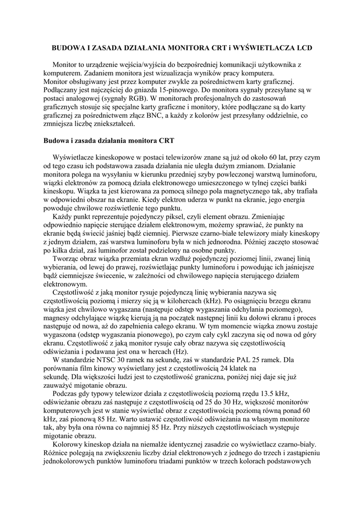 BUDOWA I ZASADA DZIAŁANIA MONITORA CRT i WYŚWIETLACZA LCD Monitor to urządzenie wejścia/wyjścia do bezpośredniej komunikacji użytkownika z komputerem. Zadaniem monitora jest wizualizacja wyników pracy komputera. Monitor obsługiwany jest przez komputer zwykle za pośrednictwem karty graficznej. Podłączany jest najczęściej do gniazda 15-pinowego. Do monitora sygnały przesyłane są w postaci analogowej (sygnały RGB). W monitorach profesjonalnych do zastosowań graficznych stosuje się specjalne karty graficzne i monitory, które podłączane są do karty graficznej za pośrednictwem złącz BNC, a każdy z kolorów jest przesyłany oddzielnie, co zmniejsza liczbę zniekształceń. Budowa i zasada działania monitora CRT Wyświetlacze kineskopowe w postaci telewizorów znane są już od około 60 lat, przy czym od tego czasu ich podstawowa zasada działania nie uległa dużym zmianom. Działanie monitora polega na wysyłaniu w kierunku przedniej szyby powleczonej warstwą luminoforu, wiązki elektronów za pomocą działa elektronowego umieszczonego w tylnej części bańki kineskopu. Wiązka ta jest kierowana za pomocą silnego pola magnetycznego tak, aby trafiała w odpowiedni obszar na ekranie. Kiedy elektron uderza w punkt na ekranie, jego energia powoduje chwilowe rozświetlenie tego punktu. Każdy punkt reprezentuje pojedynczy piksel, czyli element obrazu. Zmieniając odpowiednio napięcie sterujące działem elektronowym, możemy sprawiać, że punkty na ekranie będą świecić jaśniej bądź ciemniej. Pierwsze czarno-białe telewizory miały kineskopy z jednym działem, zaś warstwa luminoforu była w nich jednorodna. Później zaczęto stosować po kilka dział, zaś luminofor został podzielony na osobne punkty. Tworząc obraz wiązka przemiata ekran wzdłuż pojedynczej poziomej linii, zwanej linią wybierania, od lewej do prawej, rozświetlając punkty luminoforu i powodując ich jaśniejsze bądź ciemniejsze świecenie, w zależności od chwilowego napięcia sterującego działem elektronowym. Częstotliwość z jaką monitor rysuje pojedynczą linię wybierania nazywa się częstotliwością poziomą i mierzy się ją w kilohercach (kHz). Po osiągnięciu brzegu ekranu wiązka jest chwilowo wygaszana (następuje odstęp wygaszania odchylania poziomego), magnesy odchylające wiązkę kierują ją na początek następnej linii ku dołowi ekranu i proces następuje od nowa, aż do zapełnienia całego ekranu. W tym momencie wiązka znowu zostaje wygaszona (odstęp wygaszania pionowego), po czym cały cykl zaczyna się od nowa od góry ekranu. Częstotliwość z jaką monitor rysuje cały obraz nazywa się częstotliwością odświeżania i podawana jest ona w hercach (Hz). W standardzie NTSC 30 ramek na sekundę, zaś w standardzie PAL 25 ramek. Dla porównania film kinowy wyświetlany jest z częstotliwością 24 klatek na sekundę. Dla większości ludzi jest to częstotliwość graniczna, poniżej niej daje się już zauważyć migotanie obrazu. Podczas gdy typowy telewizor działa z częstotliwością poziomą rzędu 13.5 kHz, odświeżanie obrazu zaś następuje z częstotliwością od 25 do 30 Hz, większość monitorów komputerowych jest w stanie wyświetlać obraz z częstotliwością poziomą równą ponad 60 kHz, zaś pionową 85 Hz. Warto ustawić częstotliwość odświeżania na własnym monitorze tak, aby była ona równa co najmniej 85 Hz. Przy niższych częstotliwościach występuje migotanie obrazu. Kolorowy kineskop działa na niemalże identycznej zasadzie co wyświetlacz czarno-biały. Różnice polegają na zwiększeniu liczby dział elektronowych z jednego do trzech i zastąpieniu jednokolorowych punktów luminoforu triadami punktów w trzech kolorach podstawowych (czerwony, zielony, niebieski), tworzącymi pojedyncze piksele. Każde działo rozświetla punkty w jednym kolorze, za pomocą kombinacji zaś trzech barw podstawowych można uzyskać dowolny kolor. Wady i zalety technologii kineskopowej Wady: • • • • • • kineskop wymusza stosowanie dużych objętościowo obudów, monitory CRT są ciężkie, zużywają dużo energii, są szkodliwe dla zdrowia z powodu generowania silnego pola elektromagnetycznego, migotanie obrazu źle wpływa na wzrok, konstrukcje kineskopów nie gwarantują idealnej geometrii obrazu. Zalety: • fosfor, którym pokrywa się wewnętrzną stronę ekranu, gwarantuje doskonałe nasycenie barw, • monitory CRT pozwalają na uzyskanie optymalnej jakości obrazu w różnych rozdzielczościach, • fosfor emituje światło we wszystkich kierunkach, dlatego kąt widzenia sięga w monitorach CRT 180 stopni, Budowa kineskopu Budowa i zasada działania wyświetlacza LCD Wyświetlacz ciekłokrystaliczny, LCD to urządzenie wyświetlające obraz oparte na mechanizmie zmiany polaryzacji światła na skutek zmian orientacji uporządkowania cząsteczek chemicznych, pozostających w fazie ciekłokrystalicznej, pod wpływem przyłożonego pola elektrycznego. Wszystkie rodzaje wyświetlaczy ciekłokrystalicznych składają się z czterech podstawowych elementów: • komórek, w których zatopiona jest niewielka ilość ciekłego kryształu • elektrod, które są źródłem pola elektrycznego działającego bezpośrednio na ciekły kryształ • dwóch cienkich folii, z których jedna pełni rolę polaryzatora a druga analizatora • źródła światła Budowa i zasada działania Za ekranem znajduje się źródło światła, np. lampa fluorescencyjna. W zależności od wielkości panelu LCD liczba lamp fluorescencyjnych waha się od dwóch, w małych monitorach piętnastocalowych, do ośmiu w wyświetlaczach 20-21-calowych. W coraz popularniejszych panelach siedemnastocalowych montuje się zazwyczaj cztery lampy fluorescencyjne, które podświetlają matrycę LCD. Światło oświetlające panel od tyłu przechodzi najpierw przez tzw. dyfuzor, który zapewnia równomierną jasność na całej powierzchni wyświetlac