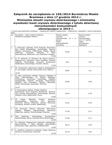 Załącznik do zarządzenia nr 165/2014 Burmistrza Miasta Braniewa z dnia 17 grudnia 2014 r. Minimalne stawki czynszu dzierżawnego i minimalne wysokości kwot czynszu dzierżawnego z tytułu dzierżawy nieruchomości komunalnych obowiązujące w 2015 r. I. Grunty pod pawilonami handlowo – usługowymi, placami magazynowo – składowymi i dojazdami- czynsz dzierżawny netto Lp. 1 Nr sektora – ulice w danym sektorze. Wskaźnik szczególny sektora. Roczna stawka czynszu dzierżawnego, za gruntu netto pod działalność handlową 1 m 2 Roczna stawka czynszu dzierżawnego, za 1 m 2 gruntu netto, pod placami i dojazdami I. Kościuszki, Gdańska, Armii Krajowej, Drewniana, Plac Józefa Piłsudskiego, Konarskiego, Szkolna, Skośna, Łącznikowa, Królewiecka, Wąska, Lipowa, Malinowa, Traugutta, Kolejowa, 9 Maja, Rzemieślnicza, Młynarska, Lisia, Kościelna, Wiejska. 17,80 44,66 7,33 II. Pl. Wolności, Pl. Strażacki, Bł. Reginy Protman, Magazynowa, Ogrodowa, Armii Krajowej, Portowa, Gdańska, Żeromskiego, Traugutta, Królewiecka, Nadbrzeżna, Konarskiego, Kromera, Wodna. 17,00 42,6 7,01 38,87 6,3 36,82 5,96 V. Przemysłowa, Błotna, 9 Maja, Wspólna, Królewiecka, Armii Krajowej, Botaniczna, Parkowa, PCK, Morska, Baczyńskiego, Żeromskiego, Staszica, Wiejska, Cicha, Nadbrzeżna, Piwna. 14,00 35,45 5,78 VI. Długa, Wileńska, Morska, Jachtowa, Nowopasłęcka, Żeglarska, PCK, Sportowa, Kwiatowa, Różana, Brzozowa, Łąkowa, Moniuszki, Grzybowa, Smutna, Krótka, Nadbrzeżna. 13,30 33,41 5,46 VII. Moniuszki, Zielona, Stefczyka, Warmińska, Jagiełły, Elbląska, Dąbrowskiego, Słoneczna, Kopernika, Łąkowa, Mielczarskiego, Wileńska. 12,60 31,52 5,11 8 VIII. Stefczyka, Sowińskiego, Sucharskiego, Dembińskiego, Bema, Generała Grota Roweckiego. 12,50 31,38 5,11 9 IX. Wileńska, Mrągowiusza, Piaskowa, Pieniężnego, Kętrzyńskiego, 1 Maja, Elbląska, Bażyńskiego, Gizewiusza, Kajki, Sportowa, Świętokrzyska. 12,00 28,12 4,59 X. Jaskółcza, Sportowa, Drozdowa, Długa, Słowicza, Mrówcza, Królewiecka, Kwiatowa. 10,30 24,19 3,92 2 3 III. Fromborska, Spacerowa, Sądowa, Świętojańska, Pl. Grunwaldu, Morska, Marynarska, PCK, Różana. 15,50 4 IV. Reja, Olsztyńska, Matejki, Staszica, Kołłątaja, 9 Maja, Mielczarskiego, Al. Wojska Polskiego, Królewiecka, Drewniana, Krasickiego, Elbląska, Świętojańska, Szkolna, Traugutta, Żeromskiego, Wiejska, Plac Grunwaldu, Skośna, Młynarska, Mokra, Sikorskiego, Kościuszki, 700 lecia. 14,70 5 6 7 10 II. Grunty pod garażami - 7,63 zł rocznie netto za 1 m 2 gruntu. III. Grunty pod budynkami gospodarczymi, wiatami - 6,10 zł rocznie netto za 1 m 2 gruntu. IV. Grunty pod pawilonami przenośnym na targowisku - 40,90 zł rocznie netto za 1 m 2 gruntu. V. Grunty użytkowane rolniczo: działki rolne - 2,36 zł rocznie, za 100 m 2 gruntu, jednak nie mniej jak 30 zł rocznie; grunty użytkowane jako ogrody przydomowe i inne ogrody - 15,72 zł rocznie, za 100 m 2 gruntu jednak nie mniej jak 15 zł rocznie. VI. Wesołe miasteczko ( za plac, pod ustawienie wesołego miasteczka ) - 217,31 zł netto, za jeden dzień użytkowania placu. VII. Cyrk ( za plac, pod ustawienie cyrku ) - 461,62 zł netto, za jeden dzień użytkowania placu. VIII. Półkabina telefoniczna ( za grunt, o powierzchni 0,50 m 2 pod półkabinę ) - 423,54 zł netto, rocznie. IX. Grunty pod budynkami wybudowanym z przekroczeniem granicy - 35 zł netto, miesięcznie, za 1 m 2 . X. Wejścia do budynków i lokali ( schody, przedproża ) do lokali użytkowych, handlowych - 35,35 zł netto, rocznie, za 1 m 2. do lokali mieszkalnych - 11,78 zł netto, rocznie, za 1 m 2. XI Grunty pod budynkami mieszkalnymi wraz z gruntami umożliwiającymi prawidłowe i racjonalne korzystanie z tych budynków mieszkalnych - 0,36 zł netto, rocznie, za 1 m 2 gruntu. XII. Grunty pod obudowami pojemników na śmieci, pod pojemnikami na śmieci -0,71 zł netto, rocznie, za 1 m 2, jednak nie mniej jak 10 zł netto rocznie. XIII. Grunty pod pojemnikami na odzież używaną -10,20 zł netto, rocznie. XIV. Grunty pod zaplecza budów i czasowe zajęcia terenu związanego z remontem budynków - 6,00 zł netto, rocznie, za 1 m 2. XV. Grunt pod krótkookresowe stoisko handlowe, promocyjne - 13,09 zł netto, dziennie, za 1 m. XVI. Grunt pod repery i innne podobne obiekty. – 40,00 zł netto, rocznie za 1 m 2, jednak nie mniej jak 30 zł, netto rocznie.