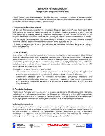 REGULAMIN KONKURSU DOTACJI Przygotowanie programów rewitalizacji Zarząd Województwa Mazowieckiego i Minister Rozwoju zapraszają do udziału w konkursie dotacji (zwanym dalej „Konkursem”) na działania wspierające gminy w zakresie przygotowania programów rewitalizacji na terenie Województwa Mazowieckiego. I. Finansowanie Konkursu Dotacji 1.1 Źródłem finansowania udzielonych dotacji jest Program Operacyjny Pomoc Techniczna 20142020, zatwierdzony decyzją wykonawczą Komisji Europejskiej z dnia 9 grudnia 2014 roku nr C(2014) 9550 przyjmującą niektóre elementy programu operacyjnego „Pomoc Techniczna 2014-2020” do wsparcia z Funduszu Spójności w ramach celu „Inwestycje na rzecz wzrostu i zatrudnienia” w Polsce. 1.2 Konkurs jest organizowany na podstawie Umowy o udzielenie dotacji celowej zawartej pomiędzy Ministrem Rozwoju a Województwem Mazowieckim z dnia 8 grudnia 2015 r. 1.3 Instytucją organizująca konkurs jest Mazowiecka Jednostka Wdrażania Programów Unijnych, zwana dalej MJWPU. II. Cele Konkursu Głównym celem Konkursu jest wsparcie gmin w uruchomieniu procesów zmierzających do rewitalizacji obszarów zdegradowanych m.in. w ramach Regionalnego Programu Operacyjnego Województwa Mazowieckiego 2014-2020 (RPO) poprzez pomoc w przygotowaniu programów rewitalizacji jako dokumentów podstawowych dla prowadzenia tych procesów i służących rozwiązywaniu problemów rewitalizacyjnych na obszarach wymagających szczególnej interwencji, z uwzględnieniem specyfiki i uwarunkowań poszczególnych gmin. Do dodatkowych celów Konkursu można zaliczyć: upowszechnienie rozumienia rewitalizacji jako procesu kompleksowych, interdyscyplinarnych przemian ukierunkowanych na wyprowadzenie obszarów zdegradowanych z kryzysu, wzmocnienie zdolności gmin do tworzenia mechanizmów partycypacji społecznej oraz angażowania mieszkańców, podmiotów publicznych, prywatnych oraz innych interesariuszy w przygotowanie programów rewitalizacji, a tym samym w wyprowadzanie z kryzysu obszarów zdegradowanych. III. Przedmiot Konkursu Przedmiotem Konkursu jest wsparcie gmin w procesie opracowania lub aktualizowania programów rewitalizacji, m.in. stanowiących podstawę do ubiegania się o dotację z funduszy UE przy realizacji projektów rewitalizacyjnych. Przygotowane/zaktualizowane w ramach Konkursu programy rewitalizacji muszą być zgodne z założeniami opisanymi w Załączniku nr 1 do niniejszego Regulaminu . IV. Działania w projekcie W ramach projektu dofinansowanego na podstawie wybranego wniosku o przyznanie dotacji możliwe będzie opracowanie lub aktualizacja programu rewitalizacji. W ramach działania należy przygotować lub zaktualizować (tj. uzupełnić lub skorygować) program rewitalizacji zgodnie z wymogami określonymi w załączniku nr 1 do Regulaminu. W dokumencie tym znajdują się szczegółowe informacje na temat wymaganych elementów i cech programów rewitalizacji. Opracowanie programu rewitalizacji może zostać poprzedzone przygotowaniem niezbędnych analiz, ekspertyz, itp. W celu opracowania rzetelnego programu rewitalizacji istnieje możliwość skorzystania ze wsparcia eksperckiego (poprzez zatrudnienie własnych ekspertów) lub zwrócenia się o pomoc do Zespołu ds. rewitalizacji w województwie mazowieckim, o którym mowa w pkt. V Regulaminu. Po opracowaniu programu rewitalizacji dokument zostanie przekazany do MJWPU celem jego weryfikacji przez Zespół ds. Rewitalizacji w województwie mazowieckim pod kątem zgodności z zasadami określonymi w załączniku nr 1 do Regulaminu. W przypadku wystąpienia zastrzeżeń, program zostanie odesłany dotacjobiorcy do korekty1. Podstawą do refundacji środków za przygotowanie programu rewitalizacji jest uzyskanie akceptacji Zespołu ds. rewitalizacji. Szczególnie ważnym elementem procesu opracowywania bądź aktualizacji programu rewitalizacji jest partycypacja społeczna. W trakcie realizacji projektu dotacjobiorca musi zagwarantować włączenie społeczności lokalnej i innych interesariuszy procesu rewitalizacji w opracowywanie lub aktualizowanie programu rewitalizacji poprzez zastosowanie różnorodnych technik i narzędzi partycypacyjnych. We wniosku o przyznanie dotacji dotacjobiorca powinien przedstawić informacje na temat sposobu angażowania powyższych grup w proces opracowywania programu rewitalizacji, a następnie jego wdrażania i okresowej oceny. Realizacja działań, o których mowa powyżej, będzie mogła być wspierana w ramach projektu przez wsparcie eksperckie na poziomie gminy. W trakcie realizacji projektu gmina będzie mogła sfinansować ze środków projektu pracę eksperta (ekspertów) z zakresu rewitalizacji, który będzie wspierał dotacjobiorcę w procesie opracowania lub aktualizowania programu rewitalizacji (taka możliwość musi być jednak przewidziana w budżecie na etapie składania wniosku o przyznanie dotacji). Będzie on mógł być zatrudniony w urzędzie gminy – dotacjobiorcy na podstawie umowy o pracę lub może to być ekspert zewnętrzny tylko na czas opracowywania programu rewitalizacji. V. Zewnętrzna pomoc ekspercka (poza projektem) Oprócz wsparcia ekspertów zatrudnionych przez gminę ze środków projektu, przed i w trakcie jego realizacji dotacjobiorcy będą mogli także skorzystać z pomocy udzielanej przez Zespół ds. Rewitalizacji w województwie mazowieckim. Jest to zespół ekspertów, który będzie prowadzić spotkania informacyjne dla Wnioskodawców w zakresie przygotowywania wniosku o przyznanie dotacji i szerzej - procesu rewitalizacji. Po uzyskaniu pozytywnej informacji w sprawie przyznania dotacji i podpisaniu umowy z Województwem, dotacjobiorcy będą mieli możliwość uzyskania nieodpłatnego wsparcia merytorycznego ze strony ww. ekspertów (m.in. w postaci spotkań) w zakresie opracowania lub zaktualizowania programu rewitalizacji. Zespół będzie także odpowiadał za weryfikację i ocenę programu rewitalizacji po jego opr