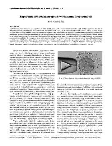 Perinatologia, Neonatologia i Ginekologia, tom 3, zeszyt 2, 129-131, 2010 Zapłodnienie pozaustrojowe w leczeniu niepłodności PIOTR MARIANOWSKI Streszczenie Zapłodnienie pozaustrojowe, po angielsku in vitro fertilisation – IVF i przeniesienie zarodka, czyli embryo transfer – ET jest to przeprowadzenie w warunkach laboratoryjnych procesów, które zachodzą w narządzie rodnym kobiety, a ściślej mówiąc w jajowodach: zapłodnienie komórki jajowej i hodowanie zarodka w jego wczesnej fazie rozwoju. Zapłodnienie pozaustrojowe umożliwia posiadanie własnego potomstwa niektórym parom małżeńskim uważanym do niedawna za definitywnie niepłodne. Minęło ponad 30 lat od spektakularnego wydarzenia w dziejach medycyny jakim było poczęcie w Bourn Hall w Wielkiej Brytanii w warunkach pozaustrojowych Luizy Brown, pierwszego „dziecka z probówki” na świecie. Od tego czasu szacuje się, że ponad 3 miliony dzieci urodziło się dzięki tej metodzie. Wiele z tych dzieci ma już własne, zdrowe potomstwo poczęte w sposób naturalny. Daje to kilka milionów szczęśliwych osób zawdzięczających swoje prawo do zaistnienia na tym świecie dzięki technikom wspomaganego rozrodu. Słowa kluczowe: zapłodnienie pozaustrojowe, przeniesienie zarodka, niepłodność, techniki wspomaganego rozrodu Minęło ponad 30 lat od narodzin Luizy Brown, pierwszego na świecie dziecka poczętego poza organizmem matki w Klinice Leczenia Niepłodności w Bourn Hall. Sukces ten był wynikiem uporu dwóch naukowców: prof. Patricka Steptoe i prof. Richarda Edwardsa. Od tej pory urodziło się na świecie kilkanaście tysięcy dzieci poczętych dzięki technikom wspomaganego rozrodu. W Polsce pierwsze dziecko po IVF-ET urodziło się 12 listopada 1987 roku w Białymstoku, w ośrodku kierowanym przez prof. Mariana Szamatowicza. Zapłodnienie pozaustrojowe, po angielsku in vitro fertilisation – IVF i przeniesienie zarodka, czyli embryo transfer – ET jest to przeprowadzenie w warunkach laboratoryjnych procesów, które zachodzą w narządzie rodnym kobiety, a ściślej mówiąc w jajowodach: zapłodnienie komórki jajowej i hodowanie zarodka w jego wczesnej fazie rozwoju [1, 2, 5]. Zapłodnienie pozaustrojowe umożliwia posiadanie własnego potomstwa niektórym parom małżeńskim uważanym do niedawna za definitywnie niepłodne. Przygotowanie do zapłodnienia pozaustrojowego polega na farmakologicznym stymulowaniu (rekombinowanymi preparatami hormonów podwzgórzowych i przysadkowych) rozwoju jednocześnie kilku lub kilkunastu pęcherzyków jajnikowych, z których pobierany jest płyn pęcherzykowy za pomocą igły wkłuwanej poprzez sklepienie pochwy pod kontrolą ultrasonografii w znieczuleniu ogólnym. W pobranym płynie odnajdywane są komórki jajowe. Umieszczane są one w inkubatorach, w specjalnych płynach do hodowli, tzw. podłożach. Następnie dokonuje się połączenia uprzednio przygotowanego nasienia (świeżego lub mrożonego) i uzyskanych komórek jajowych. W przypadku małej objętości ejakulatu, małej liczby prawidłowo ruchomych plemników oraz przewagi form o nieprawidłowej morfologii dokonuje się docytoplazmatycznego wstrzyknięcia pojedynczego plemnika do komórki jajowej (ICSI – intracytoplasmic sperm injection). W przypadkach całkowitego braku plemników w ejakulacie moż- Ryc. 1. Wstrzyknięcie plemnika do komórki jajowej (ICSI) liwe jest ich pobranie bezpośrednio z jądra/najądrza drogą biopsji lub aspiracji cienkoigłowej (MESA – microsurgical epidydymal sperm aspiration; TESE – testicular sperm extraction) [3, 5]. Po około 2 do 6 godzinach od pobrania komórek jajowych dodaje się do nich odpowiednią ilość plemników (ok. 100 000 na jedną komórkę jajową) i umieszcza się je w specjalnych naczyniach z płynem do hodowli zarodków (podłoża hodowlane), w inkubatorze o temperaturze 37EC, z odpowiednio dobranym składem gazów i wilgotnością. Połączenie komórki jajowej i plemnika oraz pierwsze podziały zarodka odbywają się poza organizmem matki. Obecnie możliwe jest hodowanie zarodków aż do stadium blastocysty (do 5 dni). Po tym okresie zarodki przenoszone są w cienkim plastikowym cewniku, przez kanał szyjki macicy do wnętrza jamy macicy, gdzie kontynuują swój rozwój, tak jak przy zapłodnieniu naturalnym. Po około 8-11 dniach od zapłodnienia następuje (w przypadku skutecznego leczenia) implantacja (czyli zagnieżdżenie) zarodka w macicy. Z reguły przenosi się do macicy 2 do 4 zarodków. Zarząd Główny Polskiego Towarzystwa Ginekologicznego Ośrodek Diagnostyki i Leczenia Niepłodności, I Katedra i Klinika Położnictwa i Ginekologii, Warszawski Uniwersytet Medyczny 130 P. Marianowski Ryc. 2. Zarodek ludzki na etapie podziału w trzecim dniu rozwoju zaleca u kobiet przed 35. rokiem życia przenoszenie 2 zarodków. U pacjentek po 35. roku życia można zwiększyć liczbę przenoszonych zarodków. Należy jednak pamiętać, że transfer większej liczby zarodków nie poprawia znamiennie wyników liczonych odsetkiem zdrowych, wypisanych ze szpitala dzieci (ang. take home baby rate). Ograniczanie liczby przenoszonych zarodków jest najprostszym sposobem zmniejszania ryzyka wystąpienia ciąży mnogiej i powikłań położniczo-neonatologicznych [4, 5]. Skuteczność leczenia niepłodności technikami wspomaganego rozorodu jest zależna od kilku czynników, jednak największy wpływ na rokowanie ma wiek kobiety oraz przyczyna niepłodności. Całkowity skumulowany odsetek urodzonych dzieci po procedurach wspomaganego rozrodu jest zbliżony do 20%. W grupie kobiet młodych i których jedynym powodem niemożności posiadania potomstwa jest czynnik mechaniczny (czyli niedrożność jajowodów) odsetek ten jest o wiele wyższy – nawet do 80% par ma szanse na urodzenie zdrowego dziecka. Jednak należy pamiętać, że przy podawaniu wyników uzyskiwanych w danym ośrodku należy zwracać uwagę na fakt, czy przedstawiono rezultaty w popu