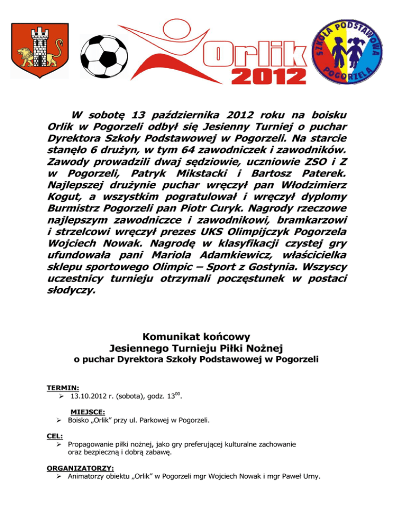 W sobotę 13 października 2012 roku na boisku Orlik w Pogorzeli odbył się Jesienny Turniej o puchar Dyrektora Szkoły Podstawowej w Pogorzeli. Na starcie stanęło 6 drużyn, w tym 64 zawodniczek i zawodników. Zawody prowadzili dwaj sędziowie, uczniowie ZSO i Z w Pogorzeli, Patryk Mikstacki i Bartosz Paterek. Najlepszej drużynie puchar wręczył pan Włodzimierz Kogut, a wszystkim pogratulował i wręczył dyplomy Burmistrz Pogorzeli pan Piotr Curyk. Nagrody rzeczowe najlepszym zawodniczce i zawodnikowi, bramkarzowi i strzelcowi wręczył prezes UKS Olimpijczyk Pogorzela Wojciech Nowak. Nagrodę w klasyfikacji czystej gry ufundowała pani Mariola Adamkiewicz, właścicielka sklepu sportowego Olimpic – Sport z Gostynia. Wszyscy uczestnicy turnieju otrzymali poczęstunek w postaci słodyczy. Komunikat końcowy Jesiennego Turnieju Piłki Nożnej o puchar Dyrektora Szkoły Podstawowej w Pogorzeli TERMIN: 13.10.2012 r. (sobota), godz. 1300. MIEJSCE: Boisko „Orlik” przy ul. Parkowej w Pogorzeli. CEL: Propagowanie piłki nożnej, jako gry preferującej kulturalne zachowanie oraz bezpieczną i dobrą zabawę. ORGANIZATORZY: Animatorzy obiektu „Orlik” w Pogorzeli mgr Wojciech Nowak i mgr Paweł Urny. PODMIOTY WSPIERAJĄCE: Burmistrz Pogorzeli – Piotr Curyk, Dyrektor Szkoły Podstawowej w Pogorzeli – Włodzimierz Kogut Sklep sportowy Olimpic-Sport – Mariola Adamkiewicz UKS „Olimpijczyk” Pogorzela działający przy ZSO i Z w Pogorzeli. UCZESTNICTWO: W turnieju mogły uczestniczyć drużyny złożone z uczennic i uczniów szkół podstawowych. NAGRODY: I miejsce – puchar + dyplom, pozostałe miejsca - dyplomy, nagroda rzeczowa najlepszy bramkarz, najlepszy strzelec, najlepszy piłkarka i piłkarz turnieju, I miejsce w kategorii czystej gry – nagroda rzeczowa, każdy uczestnik turnieju otrzymał poczęstunek w postaci słodyczy. WYNIKI: - I - faza grupowa Gr. A FC Barcelona – Lew Pogorzela 1:0 Gr. B Chelsea London – FC Naleśniki FC Barcelona – FC Holland 0:2 Chelsea London – Manchester United 2:0 Lew Pogorzela - FC Holland 1:3 FC Naleśniki – Manchester United (K. Dubisz 1) (H. Słomianny 1, M. Bzodek 1) (W. Gendera 1)(P. Jankowiak 1, M. Bzodek 1, H. Słomianny 1) ` Tabela gr. A 1 – FC Holland - 6 pkt. (5:1) 2 – FC Barcelona – 3 pkt. (1:2) 3 – Lew Pogorzela – 0 pkt. (1:4) (D. Robakowski 1) (D. Robakowski 1, E. Wawrów 1) (T. Nowak 3, K. Świerzewski 1, A. Zielony 1, D. Celebański 1) FC Holland - FC Naleśniki 0:2 (A. Zielony 1, T. Nowak 1) FC Barcelona – Chelsea London 1:1 k. 4:3 (M. Piecuch 1, karne – D. Robakowski, E. Wawrów, J. Manuszak) - III faza – finałowa mecz o V miejsce: Lew Pogorzela (karne – A. Maciejczyk, W. Gendera) mecz o III miejsce: FC Holland FC Naleśniki (K. Świerzewski 1) Manchester United 0:0 k. 2:3 (karne – H. Witczak, A. Cych, M. Stelmach) – Chelsea London 4:1 - FC Barcelona 1:0 (P. Jankowiak 1, M. Bzodek 1, D. Kaniewski 1, H. Słomianny 1) mecz o I miejsce: – 6:0 Tabela gr. B 1 – Chelsea London - 6 pkt. (3:0) 2 – FC Naleśniki – 3 pkt. (6:1) 3 – Manchester United – 0 pkt. (0:8) - II faza – półfinały (M. Piniewski 1, karne – M. Piniewski, K. Dubisz, A. Kędziora, F. Wiśniewski) 1:0 (D. Robakowski 1) KLASYFIKACJA KOŃCOWA TURNIEJU: I – FC Naleśniki /Weronika Kowalczyk, Ewelina Mrzewka, Kacper Stróżyk, Daniel Celebański, Tobiasz Nowak, Adrian Zielony, Krzysztof Świerzewski, Jacek Nabzdyk, Adam Przybyszewski/ II – FC Barcelona /Jagoda Rolnik, Marta Kowalczyk, Mateusz Piniewski, Hubert Stachowiak, Artur Kędziora, Paweł Andraszak, Krzysztof Dubisz, Filip Wiśniewski, Łukasz Cichy, Mikołaj Walczak) III – FC Holland /Anna Szczegóra, Hanna Nowak, Remigiusz Świerzewski, Sergiusz Słomianny, Adrian Poślednik, Hubert Słomianny, Dawid Kaniewski, Maciej Bzodek, Patryk Jankowiak, Dawid Waśkowiak, Adrian Płachta) IV - Chelsea London /Julia Durak, Aleksanra Skałuba, Eryk Wawrów, Damian Stróżyński, Wojciech Rauhut, Jakub Piecuch, Mikołaj Rauhut, Mariusz Myszkowski, Jakub Manuszak, Piotr Ciosek, Damian Robakowski) V – Menchester United /Olga Mikstacka, Mikołaj Stelmach, Hubert Witczak, Kacper Skowronek, Sergiusz Chojak, Filip Kaniewski, Dominik Matuszczak, Mateusz Fabisiak, Alan Gabryelczyk, Szymon Szymczak, Aleks Cych, Wiktor Manuszaki, Mikołaj Piskorz) VI – Lew Pogorzela /Maja Ławniczak, Amelia Wilczyńska, Antoni Maciejczyk, Mateusz Świerzewski, Piotr Ryba, Jakub Andrzejewski, Mikołaj Łyduch, Jonasz Walkowiak, Kacper Nawrocki, Wiktor Gendera) NAGRODA FAIR PLAY - Menchester United NAJLEPSZA ZAWODNICZKA – Marta Kowalczyk (FC Barcelona) NAJLEPSZY ZAWODNIK – Tobiasz Nowak (FC Naleśniki) NAJLEPSZY BRAMKARZ – Adam Przybyszewski (FC Naleśniki) NAJLEPSZY STRZELEC – Damian Robakowski (Chelsea London) sporządził ~ Wojciech Nowak ~