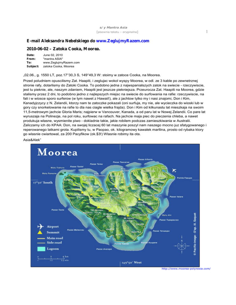 s/y Mantra Asia [pisownia tekstu – oryginalna] 1 E-mail Aleksandra Nebelskiego do www.ZeglujmyRazem.com 2010-06-02 – Zatoka Cooka, Moorea. Date: From: To: Subject: June 02, 2010 "mantra ASIA" www.ZeglujmyRazem.com zatoka Cooka, Moorea „02.06., g. 1550 LT, poz.17°30,3 S, 149°49,3 W: stoimy w zatoce Cooka, na Moorea. Przed poludniem opuscilismy Zat. Haapiti, i zeglujac wokol wyspy Moorea, w odl. ze 3 kable po zewnetrznej stronie rafy, dotarlismy do Zatoki Cooka. To podobno jedna z najwspanialszych zatok na swiecie - rzeczywiscie, jest tu pieknie, ale, naszym zdaniem, Haapiti jest jeszcze piekniejsza. Przeurocza Zat. Haapiti na Moorea, gdzie stalismy przez 2 dni, to podobno jedno z najlepszych miejsc na swiecie do surfowania na rafie: rzeczywiscie, na fali i w wiosce sporo surferow (w tym nawet z Hawaii!), ale z jachtow tylko my i nasi znajomi, Don i Kim, Kanadyjczycy z N. Zelandii, ktorzy nam te zatoczke pokazali (oni surfuja, my nie, ale wycieczka do wioski lub w gory czy snorkelowanie na rafie to dla nas ciagle wielka frajda). Don i Kim od kilkunastu lat mieszkaja na swoim 11,5-metrowym jachcie Gloria Maris; najpierw w Vancouver, Kanada, a od paru lat w Nowej Zelandii. Co pare lat wyruszaja na Polinezje, na pol roku, surfowac na rafach. Na jachcie maja piec do pieczenia chleba, a nawet produkuja wlasne, wysmienite piwo - dokladnie takie, jakie robilem podczas zamieszkiwania w Australii. Zaliczamy ich do KPAA: Don, na swojej liczacej 60 lat maszynie poszyl nam naszego mocno juz sfatygowanego i reperowanego latkami grota. Kupilismy tu, w Paopao, ok. kilogramowy kawalek marllina, prosto od rybaka ktory go wlasnie cwiartowal, za 200 Pacyfikow (ok.$3!) Wlasnie robimy ita ota. Asia&Alek” http://www.moorea-polynesia.com/