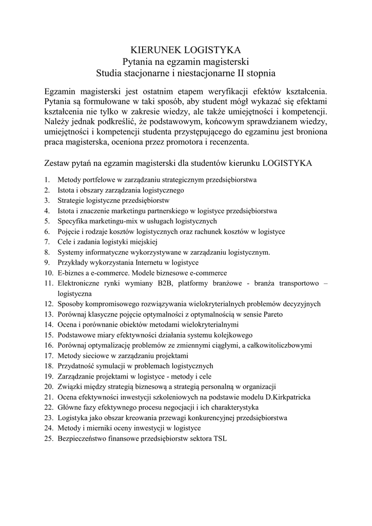KIERUNEK LOGISTYKA Pytania na egzamin magisterski Studia stacjonarne i niestacjonarne II stopnia Egzamin magisterski jest ostatnim etapem weryfikacji efektów kształcenia. Pytania są formułowane w taki sposób, aby student mógł wykazać się efektami kształcenia nie tylko w zakresie wiedzy, ale także umiejętności i kompetencji. Należy jednak podkreślić, że podstawowym, końcowym sprawdzianem wiedzy, umiejętności i kompetencji studenta przystępującego do egzaminu jest broniona praca magisterska, oceniona przez promotora i recenzenta. Zestaw pytań na egzamin magisterski dla studentów kierunku LOGISTYKA 1. 2. 3. 4. 5. 6. 7. 8. 9. 10. 11. 12. 13. 14. 15. 16. 17. 18. 19. 20. 21. 22. 23. 24. 25. Metody portfelowe w zarządzaniu strategicznym przedsiębiorstwa Istota i obszary zarządzania logistycznego Strategie logistyczne przedsiębiorstw Istota i znaczenie marketingu partnerskiego w logistyce przedsiębiorstwa Specyfika marketingu-mix w usługach logistycznych Pojęcie i rodzaje kosztów logistycznych oraz rachunek kosztów w logistyce Cele i zadania logistyki miejskiej Systemy informatyczne wykorzystywane w zarządzaniu logistycznym. Przykłady wykorzystania Internetu w logistyce E-biznes a e-commerce. Modele biznesowe e-commerce Elektroniczne rynki wymiany B2B, platformy branżowe - branża transportowo – logistyczna Sposoby kompromisowego rozwiązywania wielokryterialnych problemów decyzyjnych Porównaj klasyczne pojęcie optymalności z optymalnością w sensie Pareto Ocena i porównanie obiektów metodami wielokryterialnymi Podstawowe miary efektywności działania systemu kolejkowego Porównaj optymalizację problemów ze zmiennymi ciągłymi, a całkowitoliczbowymi Metody sieciowe w zarządzaniu projektami Przydatność symulacji w problemach logistycznych Zarządzanie projektami w logistyce - metody i cele Związki między strategią biznesową a strategią personalną w organizacji Ocena efektywności inwestycji szkoleniowych na podstawie modelu D.Kirkpatricka Główne fazy efektywnego procesu negocjacji i ich charakterystyka Logistyka jako obszar kreowania przewagi konkurencyjnej przedsiębiorstwa Metody i mierniki oceny inwestycji w logistyce Bezpieczeństwo finansowe przedsiębiorstw sektora TSL Literatura podstawowa: 1. Christopher M., Peck H., Logistyka marketingowa, PWE, Warszawa 2005, 2. Coyle J.J., Bardi E.J., C.J. Langley Jr., Zarządzanie logistyczne, PWE, Warszawa 2010, 3. Gajda J., Prognozowanie i symulacja a decyzje gospodarcze, wyd. C.H Beck, 2001, 4. Krawczyk S., Logistyka. Teoria i praktyka, wyd. Difin, 2011, Warszawa, 5. Murphy Jr. P. R., Wood D.F., Nowoczesna logistyka, Wydawnictwo Helion, Gliwice 2011, 6. Pierścionek Z., Zarządzanie strategiczne w przedsiębiorstwie, Wydawnictwo Naukowe PWN, Warszawa 2011, 7. Szymonik A., Technologie informatyczne w logistyce, Wydawnictwo Placet, Warszawa 2010, 8. Trocki Michał, Nowoczesne zarządzanie projektami, PWE, Warszawa 2012 9. Trzaskalik Tadeusz., Wprowadzenie do badań operacyjnych z komputerem, PWE, Warszawa 2008 10. Twaróg J., Koszty logistyki przedsiębiorstw, Biblioteka Logistyka, Poznań 2003. Literatura uzupełniająca: 1. Czubała, A. Jonas, T. Smoleń, J. Wiktor, Marketing usług, Wydawnictwo Wolters Kluwer, Kraków 2006, 2. Listwan T. (red.), Zarządzanie kadrami, Wyd. C.H.Beck, Warszawa 2010, 3. Steele P., J. Murphy, R.Rusiil, Jak odnieść sukces w negocjacjach, Oficyna Ekonomiczna, Kraków 2005, 4. Szapiro T. (red.), Decyzje menedżerskie z Excelem, PWE, 2000, Warszawa, 5. Szymczak M., Logistyka miejska, Wyd. UE w Poznaniu, Poznań 2008, 6. Wojciechowski T., Marketingowo-logistyczne zarządzanie przedsiębiorstwem, Difin, Warszawa 2011, 7. Żurak-Owczarek C., Technologie informacyjne determinantą współczesnego biznesu, Wydawnictwo Uniwersytetu Łódzkiego, Łódź 2011, 8. www.kbo.uni.lodz.pl
