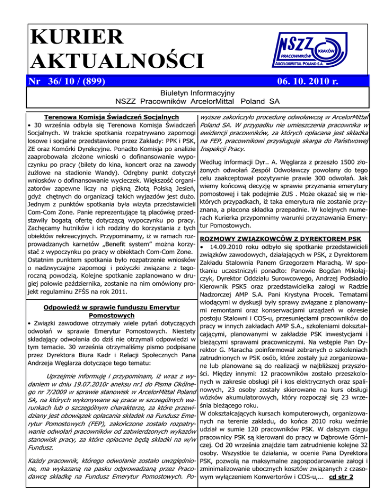 KURIER AKTUALNOŚCI Nr 36/ 10 / (899) 06. 10. 2010 r. Biuletyn Informacyjny NSZZ Pracowników ArcelorMittal Poland SA Terenowa Komisja Świadczeń Socjalnych • 30 września odbyła się Terenowa Komisja Świadczeń Socjalnych. W trakcie spotkania rozpatrywano zapomogi losowe i socjalne przedstawione przez Zakłady: PPK i PSK, ZE oraz Komórki Dyrekcyjne. Ponadto Komisja po analizie zaaprobowała złożone wnioski o dofinansowanie wypoczynku po pracy (bilety do kina, koncert oraz na zawody żużlowe na stadionie Wandy). Odrębny punkt dotyczył wniosków o dofinansowanie wycieczek. Większość organizatorów zapewne liczy na piękną Złotą Polską Jesień, gdyż chętnych do organizacji takich wyjazdów jest dużo. Jednym z punktów spotkania była wizyta przedstawicieli Com-Com Zone. Panie reprezentujące tą placówkę przedstawiły bogatą ofertę dotyczącą wypoczynku po pracy. Zachęcamy hutników i ich rodziny do korzystania z tych obiektów rekreacyjnych. Przypominamy, iż w ramach rozprowadzanych karnetów „Benefit system” można korzystać z wypoczynku po pracy w obiektach Com-Com Zone. Ostatnim punktem spotkania było rozpatrzenie wniosków o nadzwyczajne zapomogi i pożyczki związane z tegoroczną powodzią. Kolejne spotkanie zaplanowano w drugiej połowie października, zostanie na nim omówiony projekt regulaminu ZFŚS na rok 2011. Odpowiedź w sprawie funduszu Emerytur Pomostowych • Związki zawodowe otrzymały wiele pytań dotyczących odwołań w sprawie Emerytur Pomostowych. Niestety składający odwołania do dziś nie otrzymali odpowiedzi w tym temacie. 30 września otrzymaliśmy pismo podpisane przez Dyrektora Biura Kadr i Relacji Społecznych Pana Andrzeja Węglarza dotyczące tego tematu: Uprzejmie informuję i przypominam, iż wraz z wydaniem w dniu 19.07.2010r aneksu nr1 do Pisma Okólnego nr 7/2009 w sprawie stanowisk w ArcelorMittal Poland SA, na których wykonywane są prace w szczególnych warunkach lub o szczególnym charakterze, za które przewidziany jest obowiązek opłacania składek na Fundusz Emerytur Pomostowych (FEP), zakończone zostało rozpatrywanie odwołań pracowników od zatwierdzonych wykazów stanowisk pracy, za które opłacane będą składki na w/w Fundusz. Każdy pracownik, którego odwołanie zostało uwzględnione, ma wykazaną na pasku odprowadzaną przez Pracodawcę składkę na Fundusz Emerytur Pomostowych. Po- wyższe zakończyło procedurę odwoławczą w ArcelorMittal Poland SA. W przypadku nie umieszczenia pracownika w ewidencji pracowników, za których opłacana jest składka na FEP, pracownikowi przysługuje skarga do Państwowej Inspekcji Pracy. Według informacji Dyr.. A. Węglarza z przeszło 1500 złożonych odwołań Zespół Odwoławczy powołany do tego celu zaakceptował pozytywnie prawie 300 odwołań. Jak wiemy końcową decyzję w sprawie przyznania emerytury pomostowej i tak podejmie ZUS . Może okazać się w niektórych przypadkach, iż taka emerytura nie zostanie przyznana, a płacona składka przepadnie. W kolejnych numerach Kurierka przypomnimy warunki przyznawania Emerytur Pomostowych. ROZMOWY ZWIĄZKOWCÓW Z DYREKTOREM PSK • 14.09.2010 roku odbyło się spotkanie przedstawicieli związków zawodowych, działających w PSK, z Dyrektorem Zakładu Stalownia Panem Grzegorzem Marachą. W spotkaniu uczestniczyli ponadto: Panowie Bogdan Mikołajczyk, Dyrektor Oddziału Surowcowego, Andrzej Podsiadło Kierownik PSK5 oraz przedstawicielka załogi w Radzie Nadzorczej AMP S.A. Pani Krystyna Procek. Tematami wiodącymi w dyskusji były sprawy związane z planowanymi remontami oraz konserwacjami urządzeń w okresie postoju Stalowni i COS-u, przesunięciami pracowników do pracy w innych zakładach AMP S.A., szkoleniami dokształcającymi, planowanymi w zakładzie PSK inwestycjami i bieżącymi sprawami pracowniczymi. Na wstępie Pan Dyrektor G. Maracha poinformował zebranych o szkoleniach zatrudnionych w PSK osób, które zostały już zorganizowane lub planowane są do realizacji w najbliższej przyszłości. Między innymi: 12 pracowników zostało przeszkolonych w zakresie obsługi pił i kos elektrycznych oraz spalinowych, 23 osoby zostały skierowane na kurs obsługi wózków akumulatorowych, który rozpoczął się 23 września bieżącego roku. W dokształcających kursach komputerowych, organizowanych na terenie zakładu, do końca 2010 roku weźmie udział w sumie 120 pracowników PSK. W dalszym ciągu pracownicy PSK są kierowani do pracy w Dąbrowie Górniczej. Od 20 września znajdzie tam zatrudnienie kolejne 32 osoby. Wszystkie te działania, w ocenie Pana Dyrektora PSK, pozwolą na maksymalne zagospodarowanie załogi i zminimalizowanie ubocznych kosztów związanych z czasowym wyłączeniem Konwertorów i COS-u,... cd str 2 2 KURIER AKTUALNOŚCI NSZZ PRACOWNIKÓW cd ze str nr 1………., czego ewidentnym przykładem jest kierowanie pracowników na tzw. postojowe. Ponieważ docierały do nas sygnały, od kolegów pracujących czasowo w DG, o brakach w wyposażeniu w sorty BHP zwróciliśmy się z prośbą do Pana Dyrektora G.Marachy o wyjaśnienia w tym temacie. Z odpowiedzi jakiej udzielił Dyrektor PSK wynikało, że powyższe niedociągnięcia zostały już usunięte, a wszelkie uwagi naszych pracowników w tej sprawie są realizowane na bieżąco, w porozumieniu z Dyrektorem Stalowni z DG. Następnie głos zabrał Dyrektor Oddziału Surowcowego Pan Bogdan Mikołajczyk, który poinformował nas o zatwierdzeniu projektu na tzw. kadziotorpedy do transportu surówki. W ocenie Pana Dyrektora - trudno mu w tym miejscu nie przyznać racji, biorąc pod uwagę przybliżony koszt inwestycji 9 mln Euro - jest to kolejny pozytywny sygnał oraz dowód na istnienie części surowcowej w Krakowie i jej perspektywach rozwojowych. W biznesplanie na przyszły rok ujęto już pracę WP nr 5 w Krakowie oraz Zakładu Stalownia w m-cu kwietniu. My mamy jednak ciągle nadzieję, że termin ten zostanie znaczni