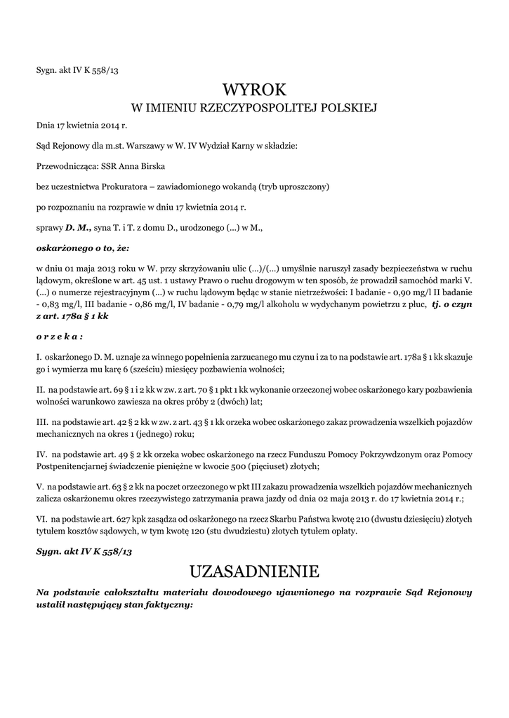 Sygn. akt IV K 558/13 WYROK W IMIENIU RZECZYPOSPOLITEJ POLSKIEJ Dnia 17 kwietnia 2014 r. Sąd Rejonowy dla m.st. Warszawy w W. IV Wydział Karny w składzie: Przewodnicząca: SSR Anna Birska bez uczestnictwa Prokuratora – zawiadomionego wokandą (tryb uproszczony) po rozpoznaniu na rozprawie w dniu 17 kwietnia 2014 r. sprawy D. M., syna T. i T. z domu D., urodzonego (...) w M., oskarżonego o to, że: w dniu 01 maja 2013 roku w W. przy skrzyżowaniu ulic (...)/(...) umyślnie naruszył zasady bezpieczeństwa w ruchu lądowym, określone w art. 45 ust. 1 ustawy Prawo o ruchu drogowym w ten sposób, że prowadził samochód marki V. (...) o numerze rejestracyjnym (...) w ruchu lądowym będąc w stanie nietrzeźwości: I badanie - 0,90 mg/l II badanie - 0,83 mg/l, III badanie - 0,86 mg/l, IV badanie - 0,79 mg/l alkoholu w wydychanym powietrzu z płuc, tj. o czyn z art. 178a § 1 kk orzeka: I. oskarżonego D. M. uznaje za winnego popełnienia zarzucanego mu czynu i za to na podstawie art. 178a § 1 kk skazuje go i wymierza mu karę 6 (sześciu) miesięcy pozbawienia wolności; II. na podstawie art. 69 § 1 i 2 kk w zw. z art. 70 § 1 pkt 1 kk wykonanie orzeczonej wobec oskarżonego kary pozbawienia wolności warunkowo zawiesza na okres próby 2 (dwóch) lat; III. na podstawie art. 42 § 2 kk w zw. z art. 43 § 1 kk orzeka wobec oskarżonego zakaz prowadzenia wszelkich pojazdów mechanicznych na okres 1 (jednego) roku; IV. na podstawie art. 49 § 2 kk orzeka wobec oskarżonego na rzecz Funduszu Pomocy Pokrzywdzonym oraz Pomocy Postpenitencjarnej świadczenie pieniężne w kwocie 500 (pięciuset) złotych; V. na podstawie art. 63 § 2 kk na poczet orzeczonego w pkt III zakazu prowadzenia wszelkich pojazdów mechanicznych zalicza oskarżonemu okres rzeczywistego zatrzymania prawa jazdy od dnia 02 maja 2013 r. do 17 kwietnia 2014 r.; VI. na podstawie art. 627 kpk zasądza od oskarżonego na rzecz Skarbu Państwa kwotę 210 (dwustu dziesięciu) złotych tytułem kosztów sądowych, w tym kwotę 120 (stu dwudziestu) złotych tytułem opłaty. Sygn. akt IV K 558/13 UZASADNIENIE Na podstawie całokształtu materiału dowodowego ujawnionego na rozprawie Sąd Rejonowy ustalił następujący stan faktyczny: D. M. kierujący w dniu 1 maja 2013 roku samochodem marki V. (...) o nr rej. (...) około godz. 23.45 został zatrzymany do kontroli drogowej na skrzyżowaniu ulic (...) i (...) w W., w związku z wcześniejszym zgłoszeniem, że kierowca pojazdu może być nietrzeźwy. Wraz z nim pojazdem jechał jako pasażer P. R.. W związku z powyższym D. M. został poddany badaniu na zawartość alkoholu w wydychanym powietrzu na urządzeniu Alkoensor IV nr (...). Wynik badania o godz. 23.46 – 0,90 mg/l alkoholu w wydychanym powietrzu z płuc. Następnie został przebadany Alkometrem (...) i stwierdzono zawartość alkoholu w wydychanym powietrzu z płuc – o godz. 00.53 – 0,83 mg/l, o godz. 01.09 – 0,86 mg/l i o godz. 01.27 – 0,79 mg/l. U P. R. stwierdzono zaś 0,95 mg/l i w kolejnym badaniu 0,81 mg/l alkoholu w wydychanym powietrzu z płuc. D. M. został zatrzymany. D. M. nie był wcześniej karany (k. 88). Powyższy stan faktyczny sąd ustalił na podstawie zeznań świadków D. J.(k. 19v) i P. R., protokołów z przebiegu badania stanu trzeźwości urządzeniem elektronicznym (k. 7, k. 8), wyjaśnień oskarżonego D. M. (k. 34, k. 44), informacji i osobie z Krajowego Rejestru Karnego (k. 88), protokołu zatrzymania (k. 5), protokołu zatrzymania rzeczy (k. 38-40). Oskarżony D. M. przyznał się do popełnienia zarzucanego mu czynu i złożył wyjaśnienia. Oskarżony wskazał, że w dniu 1 maja 2013 roku spożywał alkohol, pił piwo, wypił 6 piw o pojemności 0,5 l. Wcześniej tego dnia dostał mandat w wysokości 100 złotych, poszli z P. do samochodu oskarżonego, tam siedzieli, pili piwo i rozmawiali. Następnie odpalił swój samochód i odjechali w kierunku B., mieli jechać do koleżanek P.. Zostali zatrzymani przez policję jak skręcali z (...) w ul. (...). Oskarżony wyjaśnił również, że czuł, że jest pijany oraz że żałuje tego co zrobił. Sąd Rejonowy zważył, co następuje: W przedmiotowej sprawie sprawstwo D. M. nie budziło w ocenie sądu wątpliwości. Po pierwsze, sam oskarżony nie tylko przyznał się do popełnienia zarzucanego mu czynu, ale ponadto swoje oświadczenie o przyznaniu się do winy poparł wyjaśnieniami. Sprawstwo oskarżonego potwierdziły również pozostałe dowody zgromadzone w przedmiotowej sprawie. W szczególności świadek D. J.zeznał, że oskarżony został zatrzymany w czasie, kiedy skręcał z ulicy (...) w ulicę (...) w W., w związku z wcześniejszym zgłoszeniem, że kierowca pojazdu może być nietrzeźwy. Zeznania w/w świadka sąd ocenił jako całkowicie wiarygodne, albowiem świadek jest nie tylko osobą dla oskarżonego całkowicie obcą, ale także jego zeznania dotyczyły czynności związanych z pełnieniem służby i zawartość alkoholu w wydychanym powietrzy znajduje swój wyraz w protokołach z przebiegu badania stanu trzeźwości urządzeniem elektronicznym, posiadającym świadectwo wzorcowania. Świadek nie miał żadnego powodu, by składać w niniejszej sprawie zeznania niezgodnie z rzeczywistością na niekorzyść D. M.. Co więcej, zeznania świadka uzupełniają się z wyjaśnieniami oskarżonego jak również z zeznaniami P. R.. Sąd miał również na uwadze, że istnieje mała sprzeczność między wyjaśnieniami oskarżonego, a zeznaniami P. R. w zakresie tego do czyich koleżanek mieli jechać, jednak okoliczność powyższa nie ma istotnego znaczenia z punktu widzenia rozpoznania niniejszej sprawy. Sąd dał wiarę dokumentom zgromadzonym w toku postępowania, albowiem ich treść nie była kwestionowana przez żadną ze stron postępowania. Na podstawie zgromadzonego w sprawie materiału dowodowego sąd uznał, że D. M. w dniu 01 maja 2013 roku w W. przy skrzyżowaniu ulic (...)/(...) umyślnie naruszy