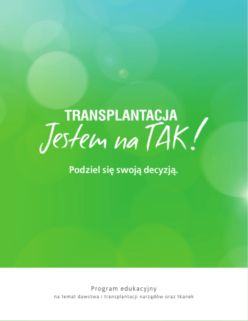Podziel się swoją decyzją. Program edukacyjny n a t e m a t d a w st w a i t r a n sp l a n t a c j i n a r z ądów oraz tkanek Podziel się swoją decyzją. Program edukacyjny na temat dawstwa i transplantacji narządów oraz tkanek Program realizowany przez Stowarzyszenie „Życie po przeszczepie” Wydanie III 2012 - Druk został sfinansowany ze środków Narodowego Programu Rozwoju Medycyny Transplantacyjnej © Krzysztof Pabisiak 2012 / Opracowanie graficzne: Ewa Kaziszko Wykorzystanie programu, przedruki całości lub fragmentów tekstu dozwolone za pisemną zgodą autora. Podziękowania Materiały edukacyjne stworzone pod hasłem „Transplantacja - jestem na TAK. Podziel się swoja decyzją” zostały zainspirowane działaniami edukacyjnymi na rzecz propagowania świadomego dawstwa organów w Stanach Zjednoczonych. Za oceanem od prawie 40 lat popularyzowana jest karta dawcy ( Donor Card). Materiały źródłowe do opracowania pierwszego w Polsce progromu edukacyjnego na temat dawstwa narządów i transplantacji pochodzą z Działu Edukacyjnego Departamentu Zdrowia i Polityki Społecznej Stanów Zjednoczonych (U.S. Department of Health and Human Services). Szczególne podziękowania kieruję do pani Joy Engle Demas, jednego z twórców programu, za przychylne przyjęcie pomysłu stworzenia wersji polskiej. Wszystkim, którzy współtworzyli wersje amerykańską programu słowa uznania za ciekawe przedstawienie tematu. W przygotowaniu swoimi radami i uwagami wsparli projekt prof. Wojciech Rowinski, konsultant krajowy ds. transplantologii oraz prof Janusz Wałaszewski, były dyrektor „Poltransplantu”, za co serdecznie dziękuję. Dziękuję panu Krzysztofowi Pijarowskiemu, założycielowi Stowarzyszenia „ Życie po przeszczepie”, pani mgr Ewie Ochockiej, psychologowi klinicznemu w Szpitalu Klinicznym nr 2 w Szczecinie oraz koordynatorom transplantacyjnym pracujący w ośrodkach przeszczepiania w całej Polsce za cenne sugestie i korekty do materiałów zawartych w książeczce. Pani Ewie Kaziszko, absolwentce Wyższej Szkoły Sztuki Użytkowej w Szczecinie, za stworzenie ciekawej oprawy graficznej wydania. W ciągu czterech lat funkcjonowania programu ponad 20 tysięcy młodych ludzi dowiedziało się czemu służy transplantacja. Ziarno wiedzy zostało zasiane. Wszelkie uwagi i komentarze proszę kierować na adres poczty elektronicznej ; [email protected] dr n. med. Krzysztof Pabisiak - autor wydania polskiego Spis treści 1. Wstęp ..........................................................00 2. Aby zrozumieć ....................................... 00 Najważniejsze wiadomości o dawstwie organów i tkanek ............................. 00 czym jest transplantacja ..................................... 00 co kryje się pod pojęciem śmierci mózgu ............ 00 częste pytania na temat transplantacji ............... 00 3. Trochę nauki ........................................... 00 organy do transplantacji ..................................... 00 jakie choroby leczy transplantacja ...................... 00 tkanki do transplantacji ....................................... 00 zastosowania tkanek do przeszczepu ................ 00 typy dawców ....................................................... 00 4. Dusza transplantacji .......................... 00 religie o dawstwie narządów .............................. 00 linia życia ............................................................. 00 Materiały dodatkowe ............................... 00 historia transplantacji w skrócie .......................... 00 słowniczek transplantacyjny ............................... 00 zawody związane z transplantacją ..................... 00 transplantacja na www ....................................... 00 6 TRANSPLANTACJA - Jestem na tak! TRANSPLANTACJA - Jestem na tak! 01 Dlaczego mówimy o oddaniu narządów po śmierci i transplantacji? Dlatego, że transplantacja ratuje życie... Dawca narządów może OCALIĆ życie czterem osobom z grona 1630 osób oczekujących obecnie na przeszczep narządu w Polsce, a kolejnym trzem przedłużyć życie. Wiele osób oczekujących na przeszczep umiera – nie z powodu braku leczenia, ale z powodu braku narządów do przeszczepu. Postęp medycyny spowodował, że wiele osób krytycznie chorych dostaje szansę na nowe życie będąc zgłoszonym do przeszczepu serca, wątroby… Pomimo wzrostu ilości pobieranych narządów w Polsce w ostatnim dziesięcioleciu, liczba osób oczekujących na przeszczep nadal znacznie ją przewyższa. Dlaczego ważna jest edukacja na temat dawstwa narządów i tkanek oraz służy przeszczepianie narządów? Ze społecznego punktu widzenia najistotniejsze jest przekazanie informacji, by każdy Polak miał możliwość wyrażenia świadomej deklaracji o oddaniu swoich narządów i tkanek po śmierci. Akceptacja pobierania narządów do transplantacji jest podstawą sukcesu transplantacji. Dlaczego ważne jest mówienie o świadomym dawstwie narządów? W Polsce obowiązuje prawo, które określa, że każda osoba może być dawcą narządów. Może nim być, jeśli za życia nie wyraziła sprzeciwu na pobranie narządów w Centralnym Rejestrze Sprzeciwów (CRS) lub we własnoręcznie podpisanym oświadczeniu. Jest to tak zwane „prawo zgody domniemanej”. Według badań opinii publicznej (2010, CBOS) Polacy prawie powszechnie (90%) uznają, że idea transplantacji narządów jest słuszna. Przeciwnicy przeszczepiania narządów stanowią zaledwie 4% ogółu społeczeństwa Polski. 78% Polaków deklaruje gotowość do oddania swoich narządów po śmierci. Nieco mniej badanych (69%) przyznaje, że byliby skłonni wypełnić tzw. oświadczenie woli, w którym wyraziliby zgodę na ofiarowanie swoich organów po śmierci. Zapoznanie się z celem, który przyświeca deklaracji bycia dawcą i co najważniejsze, podzielenie się z rodziną swoją decyzją pozwoli bez wątpienia zwiększyć dostępność dla tej met