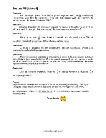 Zestaw VII [klasa4] Zadanie 1 Na parkingu, pilnie strzeżonym przez Myszkę Miki, stoją samochody i motocykle. Jest tam 50 kierownic i 160 kół. (Kół zapasowych nie liczymy). Ile samochodów i ile motocykli pilnuje Miki? Zadanie 2 Wstążkę długości 102 cm należy rozciąć na części o długości 15 cm i 12 cm tak, aby nie było resztek. Jak to wykonać? Ile rozwiązań ma to zadanie? Zadanie 3 4 całej trasy i pozostało mu do przebycia o 360 mil 11 morskich więcej niż przepłynął. Oblicz długość całego rejsu. Okręt przepłynął Zadanie 4 Z drutu o długości 66 cm zbudowano szkielet sześcianu. Oblicz pole powierzchni całkowitej tego sześcianu. Zadanie 5 Pierwszy autobus odjeżdża z przystanku o godz. 5.30, a następne autobusy odjeżdżają z tego przystanku co 45 min. Janek przyszedł na przystanek o godz. 14.22. O ile minut przyszedł za późno na autobus, który ostatnio odjechał? Ile minut będzie czekał na najbliższy autobus? Zadanie 6 Jak od kawałka materiału długości 2 1 m odciąć kawałek o długości m 3 2 nie używając miarki? Ocena: za prawidłowe rozwiązanie minimum 5 zadań uczeń otrzymuje ocenę - celujący. Mniejsza liczba zadań zostanie dopisana do zadań z następnych zestawów. Na rozwiązania czekam do 31 maja 2010r. Po tym terminie rozwiązania nie będą przyjmowane. Powodzenia matematyczny.blox.pl