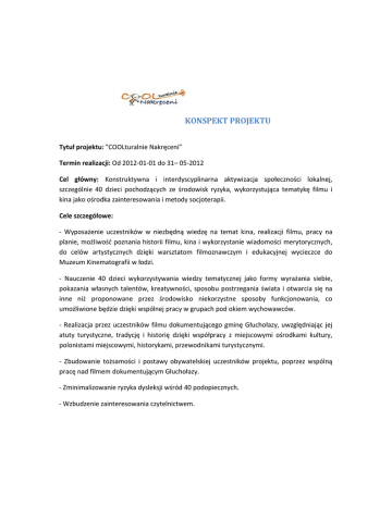 KONSPEKT PROJEKTU Tytuł projektu: ”COOLturalnie Nakręceni” Termin realizacji: Od 2012-01-01 do 31– 05-2012 Cel główny: Konstruktywna i interdyscyplinarna aktywizacja społeczności lokalnej, szczególnie 40 dzieci pochodzących ze środowisk ryzyka, wykorzystująca tematykę filmu i kina jako ośrodka zainteresowania i metody socjoterapii. Cele szczegółowe: - Wyposażenie uczestników w niezbędną wiedzę na temat kina, realizacji filmu, pracy na planie, możliwość poznania historii filmu, kina i wykorzystanie wiadomości merytorycznych, do celów artystycznych dzięki warsztatom filmoznawczym i edukacyjnej wycieczce do Muzeum Kinematografii w łodzi. - Nauczenie 40 dzieci wykorzystywania wiedzy tematycznej jako formy wyrażania siebie, pokazania własnych talentów, kreatywności, sposobu postrzegania świata i otwarcia się na inne niż proponowane przez środowisko niekorzystne sposoby funkcjonowania, co umożliwione będzie dzięki wspólnej pracy w grupach pod okiem wychowawców. - Realizacja przez uczestników filmu dokumentującego gminę Głuchołazy, uwzględniając jej atuty turystyczne, tradycję i historię dzięki współpracy z miejscowymi ośrodkami kultury, polonistami miejscowymi, historykami, przewodnikami turystycznymi. - Zbudowanie tożsamości i postawy obywatelskiej uczestników projektu, poprzez wspólną pracę nad filmem dokumentującym Głuchołazy. - Zminimalizowanie ryzyka dysleksji wśród 40 podopiecznych. - Wzbudzenie zainteresowania czytelnictwem. Przebieg projektu: STYCZEŃ 2012 1) Promocja projektu „COOLturalnie Nakręceni” 2) Wycieczka edukacyjna do Muzeum Kinematografii w Łodzi. 3) Zakupienie sprzętu multimedialnego ( kamera cyfrowa, kolekcja filmów i lektur na DVD). LUTY 2012 – MAJ 2012 Świetlicowe seanse filmowe, odbywać się będą raz w miesiącu (w pierwszy piątek rozpoczynającego się miesiąca) dla wszystkich chętnych kino maniaków z miasta Głuchołazy. Na ten cel zakupiona zostanie wspaniała kolekcja filmów na DVD. Seanse w „Kinie Zdrojowym” odbywać się będą raz w miesiącu. Wyjścia do Głuchołaskiego Kina Zdrojowego organizowane będą dla podopiecznych Gminnej Świetlicy Socjoterapeutycznej przy PKPS w Głuchołazach. Warsztaty filmoznawcze odbywać się będą 2 x w miesiącu dla podopiecznych świetlicy. Prowadzone będą przez znawcę i miłośnika kina Pana Krzysztofa Miśniakiewicza. Podczas tych zajęć wychowankowie świetlicy nakręcą film dokumentujący rodzinne miasto Głuchołazy. Lekcje biblioteczne odbywać się będą 2 x w miesiącu. Prowadzone będą przez Panią Alicję Płowaś. Służyć one będą zgłębieniu wiedzy historycznej na temat miasta Głuchołazy. Partnerem projektu jest Miejska i Gminna Biblioteka Publiczna Centrum Kultury. W ramach pracy na planie prowadzone będą zajęcia muzyczne przez Pana Janusza Gąsior podczas, których dzieci nauczą się śpiewać piosenki, które zostaną wykorzystane w filmie o Głuchołazach. Podczas tych zajęć powstanie także muzyka, która również zostanie wykorzystana w filmie. Nad całością projektu czuwać będzie koordynator oraz zaproszeni fachowcy w danej dziedzinie. Projekt realizowany w ramach programu Akademia Orange. Materiał jest dostępny na licencji Creative Commons Uznanie Autorstwa 3.0 Polska