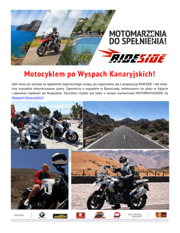Motocyklem po Wyspach Kanaryjskich! Jeśli masz już pomysł na spędzenie tegorocznego urlopu, po zapoznaniu się z propozycją RIDESIDE i tak zmienisz wszystkie dotychczasowe plany. Zapomnisz o wypadzie w Bieszczady, leżakowaniu na plaży w Egipcie i pływaniu kajakiem po Rospudzie. Zaczniesz myśleć już tylko o swojej wymarzonej MOTOPRZYGODZIE na Wyspach Kanaryjskich! Po pierwsze – dlaczego Wyspy Kanaryjskie? Jest to absolutnie idealne miejsce do jazdy motocyklem. Przez cały rok temperatury utrzymują się tu na poziomie 18-30 st. C, a deszcz jest zjawiskiem rzadkim. Drogi są utrzymane w znakomitym stanie, a dzięki górzystemu, powulkanicznemu terenowi, zapewniają niezliczoną ilość niesamowitych zakrętów. Jakby tego było mało, sam asfalt jest wykonany z zupełnie innej mieszanki, niż jesteśmy do tego przyzwyczajeni, co w efekcie zapewnia fenomenalną przyczepność. W sumie czekają tu na Was ponad dwa tysiące kilometrów wspaniałych tras. Do tego wszystkiego dołóżmy jeszcze zapierające dech w piersiach widoki, piękną i unikatową przyrodę, imponujący wulkan El Teide w centralnej części wyspy oraz mnóstwo dodatkowych atrakcji na miejscu. Wszystko to pozwala połączyć MOTOPRZYGODĘ z wyjazdem rodzinnym, bo podczas gdy my jeździmy na motocyklach, nasi bliscy korzystają ze wszystkich uroków Wysp i także doskonale się bawią! Czy znasz lepszy sposób na połączenie spełnienia swoich motomarzeń ze szczęśliwymi wakacjami rodzinnymi? A może wolisz przyjechać tu tylko z kolegami? Decyzja należy do Ciebie! W sumie 700 kilometrów trasy W sumie 160 kilometrów trasy W sumie 270 kilometrów trasy W sumie 520 kilometrów trasy Po drugie - dlaczego RIDESIDE? Zapewniamy organizację wyjazdu od A do Z, abyś nie musiał zajmować się organizacją swojego pobytu na Wyspach oraz aby nie zaskoczyły Cię żadne koszty dodatkowe. Z góry wiadomo, ile wyjazd będzie kosztował, bowiem w ceny pakietów wliczone są noclegi w hotelach z opcją All Inclusive, przelot w obie strony, pełne ubezpieczenie i wynajem naszych motocykli. Sam decydujesz, który pakiet wybierasz oraz które z wysp chcesz odwiedzić. Wśród partnerów RIDESIDE znaleźli się: BMW Motorrad, Biuro Podróży ITAKA, Świat Motocykli i Ścigacz.pl. Jeździmy ze znanymi dziennikami i doświadczonymi motocyklistami, którzy zawsze chętnie służą cenną poradą. A może chcesz, abyśmy nagrali dla Ciebie pamiątkowe materiały video? Nic prostszego, będziesz mieć wspaniałą pamiątkę, po obejrzeniu której Twoi znajomi zzielenieją z zazdrości! W naszym parku maszyn znajdują się wyłącznie nowe maszyny BMW. Do wyboru są modele z rodziny GS oraz R, więc każdy znajdzie coś dla siebie. Jeśli masz już zaplanowany pobyt na Teneryfie to masz również możliwość wypożyczenia motocykla. Jesteśmy elastyczni, na pewno znajdziemy dla Ciebie idealne rozwiązanie! Po trzecie - dlaczego warto rezerwować teraz Z dnia na dzień przybywa nam nowych rezerwacji. W tej chwili mamy jeszcze wolne terminy, ale nie możemy obiecać, że nie zmieni się to nagle, wraz z nadejściem sezonu letniego. Słowem- jeśli wiesz czego chcesz, zrealizuj swoje marzenia już teraz - sprawdź dostępne terminy. Jeśli przez cały rok czekasz na urlop, to zadbaj o to, aby nie zepsuła go niepewna pogoda, czy dziurawe drogi! Przyjedź do nas, czekamy na Ciebie! INDYWIDUALNY KONTAKT Każdego Klienta traktujemy indywidualnie, dlatego czekamy na Twój kontakt. Służymy pomocą przy wyborze odpowiedniego motocykla, pakietu oraz w ustaleniu dogodnego terminu Twojej MOTOPRZYGODY. Jeśli chcesz poznać więcej szczegółów propozycji RIDESIDE - po prostu zadzwoń: Tomasz Uściński +34 603 363 801 Piotrek "Barry" Baryła + 48 608 522 361 Ewa Samborska - Uścińska + 48 505 027 159 lub napisz na: [email protected] WEJDŹ NA: WWW.RIDESIDE.PL
