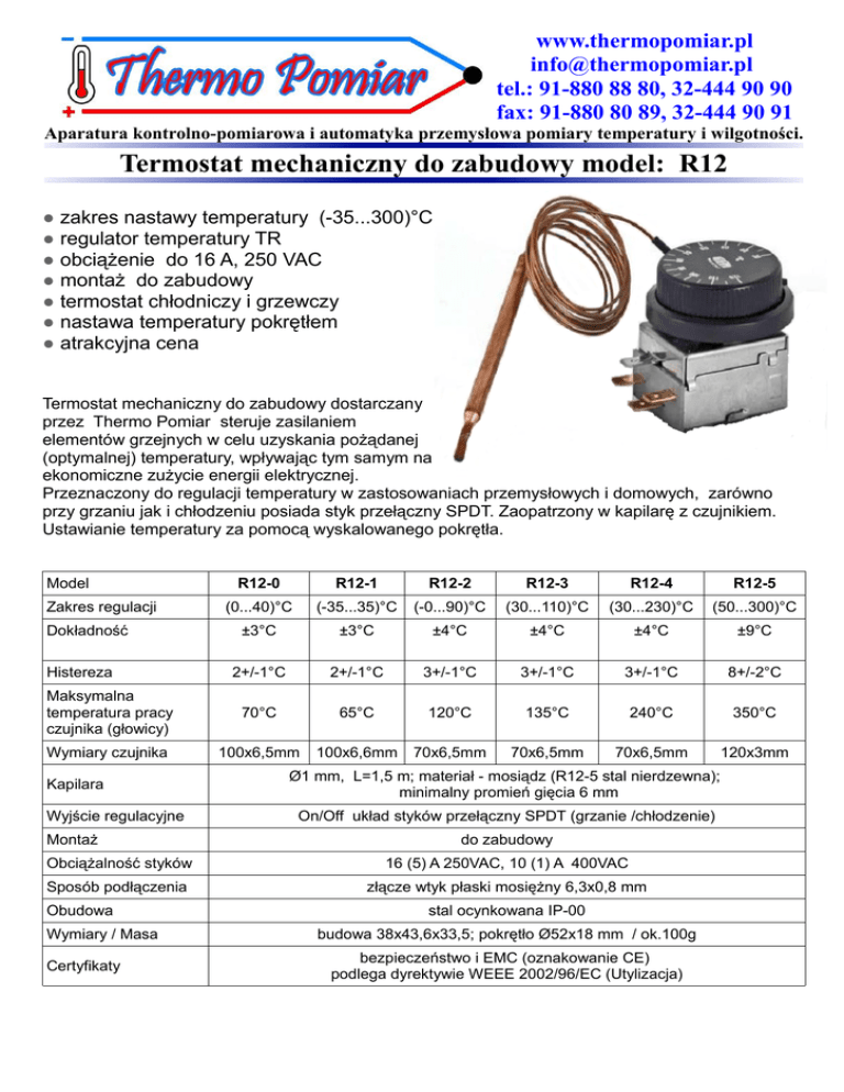 www.thermopomiar.pl [email protected] tel.: 91-880 88 80, 32-444 90 90 fax: 91-880 80 89, 32-444 90 91 Aparatura kontrolno-pomiarowa i automatyka przemysłowa pomiary temperatury i wilgotności. Termostat mechaniczny do zabudowy model: R12 ● zakres nastawy temperatury (-35...300)°C ● regulator temperatury TR ● obciążenie do 16 A, 250 VAC ● montaż do zabudowy ● termostat chłodniczy i grzewczy ● nastawa temperatury pokrętłem ● atrakcyjna cena Termostat mechaniczny do zabudowy dostarczany przez Thermo Pomiar steruje zasilaniem elementów grzejnych w celu uzyskania pożądanej (optymalnej) temperatury, wpływając tym samym na ekonomiczne zużycie energii elektrycznej. Przeznaczony do regulacji temperatury w zastosowaniach przemysłowych i domowych, zarówno przy grzaniu jak i chłodzeniu posiada styk przełączny SPDT. Zaopatrzony w kapilarę z czujnikiem. Ustawianie temperatury za pomocą wyskalowanego pokrętła. Model R12-0 R12-1 R12-2 R12-3 R12-4 R12-5 (0...40)°C (-35...35)°C (-0...90)°C (30...110)°C (30...230)°C (50...300)°C ±3°C ±3°C ±4°C ±4°C ±4°C ±9°C 2+/-1°C 2+/-1°C 3+/-1°C 3+/-1°C 3+/-1°C 8+/-2°C Maksymalna temperatura pracy czujnika (głowicy) 70°C 65°C 120°C 135°C 240°C 350°C Wymiary czujnika 100x6,5mm 100x6,6mm 70x6,5mm 70x6,5mm 70x6,5mm 120x3mm Zakres regulacji Dokładność Histereza Kapilara Wyjście regulacyjne Montaż Ø1 mm, L=1,5 m; materiał - mosiądz (R12-5 stal nierdzewna); minimalny promień gięcia 6 mm On/Off układ styków przełączny SPDT (grzanie /chłodzenie) do zabudowy Obciążalność styków 16 (5) A 250VAC, 10 (1) A 400VAC Sposób podłączenia złącze wtyk płaski mosiężny 6,3x0,8 mm Obudowa Wymiary / Masa Certyfikaty stal ocynkowana IP-00 budowa 38x43,6x33,5; pokrętło Ø52x18 mm / ok.100g bezpieczeństwo i EMC (oznakowanie CE) podlega dyrektywie WEEE 2002/96/EC (Utylizacja) Zastosowania R12-0 (0...40)°C - chłodziarki napojów, lodówki, witryny chłodnicze R12-1 (-35...35)°C - chłodnictwo R12-2 (0...90)°C - podgrzewacze wody, bojlery R12-3 (30...110)°C - podgrzewacze wody R12-4 (30...230)°C - frytkownice, grille elektryczne, podgrzewacze oleju R12-5 (50...300)°C - piekarniki i piece elektryczne Wymiary