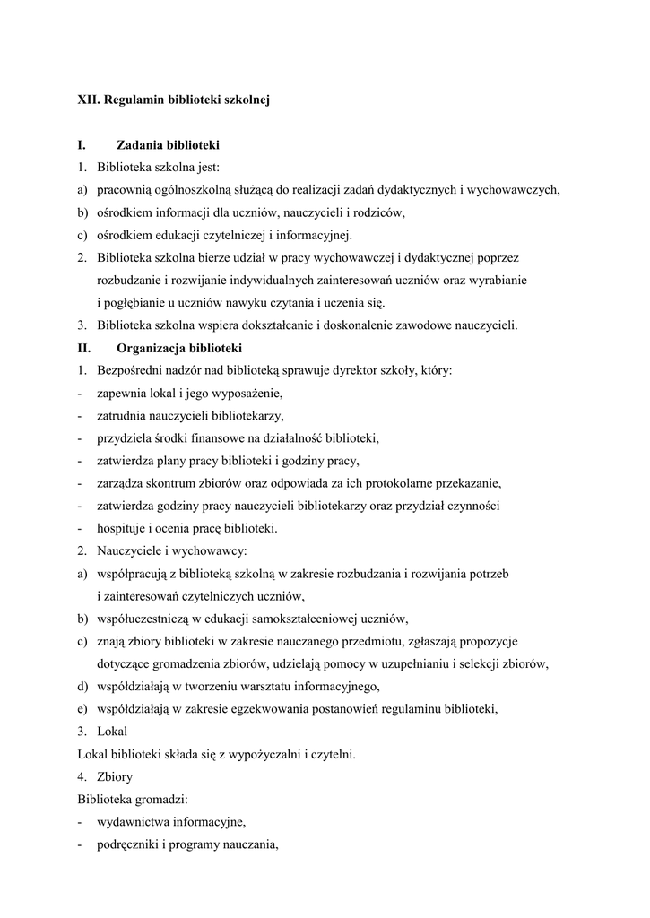 XII. Regulamin biblioteki szkolnej I. Zadania biblioteki 1. Biblioteka szkolna jest: a) pracownią ogólnoszkolną służącą do realizacji zadań dydaktycznych i wychowawczych, b) ośrodkiem informacji dla uczniów, nauczycieli i rodziców, c) ośrodkiem edukacji czytelniczej i informacyjnej. 2. Biblioteka szkolna bierze udział w pracy wychowawczej i dydaktycznej poprzez rozbudzanie i rozwijanie indywidualnych zainteresowań uczniów oraz wyrabianie i pogłębianie u uczniów nawyku czytania i uczenia się. 3. Biblioteka szkolna wspiera dokształcanie i doskonalenie zawodowe nauczycieli. II. Organizacja biblioteki 1. Bezpośredni nadzór nad biblioteką sprawuje dyrektor szkoły, który: - zapewnia lokal i jego wyposażenie, - zatrudnia nauczycieli bibliotekarzy, - przydziela środki finansowe na działalność biblioteki, - zatwierdza plany pracy biblioteki i godziny pracy, - zarządza skontrum zbiorów oraz odpowiada za ich protokolarne przekazanie, - zatwierdza godziny pracy nauczycieli bibliotekarzy oraz przydział czynności - hospituje i ocenia pracę biblioteki. 2. Nauczyciele i wychowawcy: a) współpracują z biblioteką szkolną w zakresie rozbudzania i rozwijania potrzeb i zainteresowań czytelniczych uczniów, b) współuczestniczą w edukacji samokształceniowej uczniów, c) znają zbiory biblioteki w zakresie nauczanego przedmiotu, zgłaszają propozycje dotyczące gromadzenia zbiorów, udzielają pomocy w uzupełnianiu i selekcji zbiorów, d) współdziałają w tworzeniu warsztatu informacyjnego, e) współdziałają w zakresie egzekwowania postanowień regulaminu biblioteki, 3. Lokal Lokal biblioteki składa się z wypożyczalni i czytelni. 4. Zbiory Biblioteka gromadzi: - wydawnictwa informacyjne, - podręczniki i programy nauczania, - wydawnictwa z zakresu psychologii, pedagogiki i dydaktyk szczegółowych, - edukacyjne dokumenty audiowizualne i multimedialne, - lektury obowiązkowe i uzupełniające w zakresie szkoły ponadgimnazjalnej, - beletrystykę pozalekturową, - literaturę naukową i popularnonaukową zgodnie z potrzebami i profilem szkoły, 5. Finansowanie wydatków a) biblioteka jest finansowana z budżetu szkoły, b) działalność biblioteki może być dotowana przez Radę Rodziców i innych ofiarodawców. 6. Pracownicy a) w bibliotece zatrudnieni są nauczyciele bibliotekarze, zgodnie z obowiązującymi przepisami (normami) b) zadania poszczególnych nauczycieli bibliotekarzy określone są w zakresach ich obowiązków (w rocznym planie pracy). 7. Czas pracy biblioteki: a) biblioteka jest czynna w czasie trwania zajęć dydaktycznych zgodnie z organizacją roku szkolnego, b) czas pracy biblioteki zostaje odpowiednio skrócony na czas trwania skontrum, c) udostępnianie zbiorów odbywa się przez 4 dni w tygodniu (poniedziałek, wtorek czwartek, piątek d) raz w tygodniu (środa) biblioteka jest nieczynna dla czytelników, dzień ten jest przeznaczony na prace związane z zakupem, opracowaniem i konserwacją księgozbioru III. Zadania i obowiązki nauczyciela bibliotekarza 1. Praca pedagogiczna Nauczyciel bibliotekarz jest obowiązany: a) udostępniać zbiory w wypożyczalni i czytelni, b) prowadzić działalność informacyjną i stosować różne formy upowszechniania czytelnictwa, c) poznawać czytelników i ich potrzeby czytelnicze, d) udzielać porad w doborze lektury, e) prowadzić edukację czytelniczą i kształcenie uczniów jako użytkowników informacji (szeroko pojętej - czytelniczej i medialnej) przy współudziale wychowawców i nauczycieli różnych przedmiotów (zgodnie z programami obowiązującymi w szkole), f) pomagać nauczycielom i wychowawcom w realizacji ich zadań dydaktycznowychowawczych, związanych z książką i innymi źródłami informacji, g) informować nauczycieli i wychowawców o stanie czytelnictwa uczniów. 2. Prace organizacyjno-techniczne Nauczyciel bibliotekarz jest zobowiązany: a) gromadzić zbiory zgodnie z profilem szkoły i potrzebami czytelników, b) zamawiać i prowadzić akcesję prasy, c) prowadzić ewidencję i opracowanie zbiorów, d) przeprowadzać systematyczną selekcję zbiorów, e) dbać o stan zbiorów i prowadzić ich konserwację, f) prowadzić warsztat informacyjny (księgozbiór podręczny, katalogi, kartoteki, teczki tematyczne i in.), g) sporządzać roczne plany pracy i sprawozdania, planować wydatki, prowadzić statystykę czytelnictwa: dzienną, miesięczną, semestralną i roczną, h) prowadzić dokumentację biblioteczną, IV. Prawa i obowiązki czytelników 1. Z biblioteki mogą korzystać uczniowie, nauczyciele i inni pracownicy szkoły, 2. Korzystanie z biblioteki jest bezpłatne 3. Korzystający z biblioteki są zobowiązani do dbałości o wypożyczone materiały, 4. Jednorazowo można wypożyczyć 2 lektury. Liczbę wypożyczonych książek można zwiększyć o inne pozycje (pozalekturowe) w uzgodnieniu z nauczycielem bibliotekarzem. 5. Czytelnik może zarezerwować potrzebną mu książkę. 6. Termin zwrotu wypożyczonych materiałów mija po 14 dniach. Jeśli nie ma zamówień (rezerwacji) na daną książkę można przedłużyć termin jej zwrotu. 7. W przypadku zniszczenia lub zagubienia książki (lub innych materiałów bibliotecznych) czytelnik jest zobowiązany zwrócić taka samą pozycję lub inna wskazaną przez nauczyciela bibliotekarza lub wpłacić dwukrotną antykwaryczną wartość książki. 8. Wszystkie wypożyczone materiały biblioteczne powinny być zwrócone na dwa tygodnie przed końcem roku szkolnego. 9. Czytelnicy opuszczający szkołę zobowiązani są do przedstawienia w sekretariacie szkoły pisemnego zaświadczenia potwierdzającego zwrot materiałów bibliotecznych. V. Regulamin korzystania z czytelni 1. Zabrania się wnoszenia płaszczy i kurtek. 2. W czytelni obowiązuje cisza. 3. Zabrania się spożywania posiłków i picia napojów w czytelni. 4. Korzystający z czytelni powinien dokonać wpisu w księdze odwiedzin w czytelni VI. Regulamin Inter