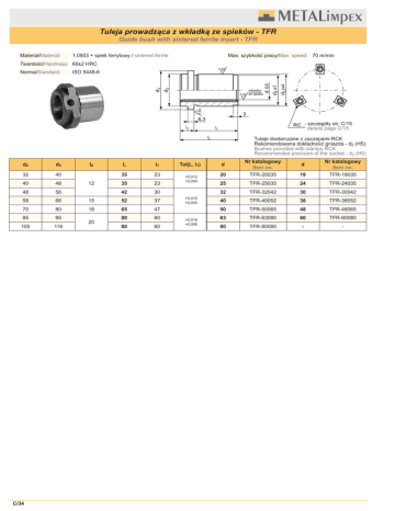 Tuleja prowadząca z wkładką ze spieków - TFR Guide bush with sintered ferrite insert - TFR Materiał/Material: 1.0503 + spiek ferrytowy / sintered ferrite Max. szybkość pracy/Max. speed: 70 m/min Twardość/Hardness: 60±2 HRC Norma/Standard: ISO 9448-6 - szczegóły str. C/15 details page C/15 Tuleje dostarczane z zaczepami RCK Rekomendowana dokładność gniazda - d2 (H5) Bushes provided with clamps RCK Recommended precision of the socket - d2 (H5) d2 d3 32 40 40 48 48 56 l2 12 L l1 35 23 35 23 42 30 58 66 15 52 37 70 80 18 65 47 80 60 80 60 85 95 105 118 C/34 20 Tol(L, l1) +0,012 +0,004 +0,015 +0,005 +0,018 +0,006 d Nr katalogowy Item no. d Nr katalogowy Item no. 20 TFR-20035 19 TFR-19035 25 TFR-25035 24 TFR-24035 32 TFR-32042 30 TFR-30042 40 TFR-40052 38 TFR-38052 50 TFR-50065 48 TFR-48065 63 TFR-63080 60 TFR-60080 80 TFR-80080 - -