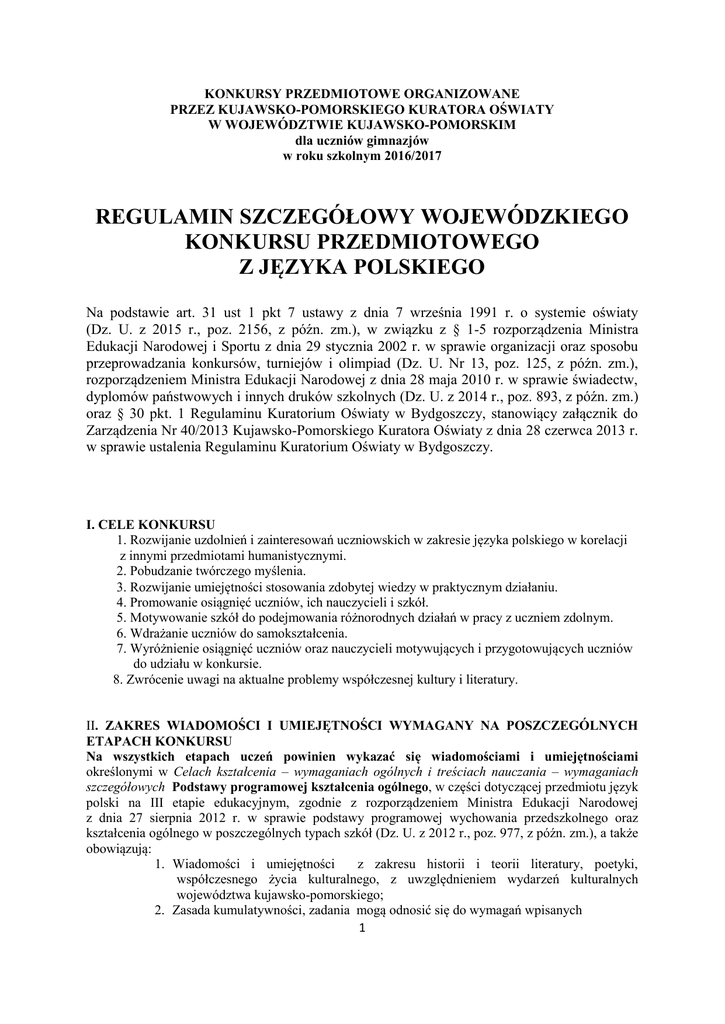 KONKURSY PRZEDMIOTOWE ORGANIZOWANE PRZEZ KUJAWSKO-POMORSKIEGO KURATORA OŚWIATY W WOJEWÓDZTWIE KUJAWSKO-POMORSKIM dla uczniów gimnazjów w roku szkolnym 2016/2017 REGULAMIN SZCZEGÓŁOWY WOJEWÓDZKIEGO KONKURSU PRZEDMIOTOWEGO Z JĘZYKA POLSKIEGO Na podstawie art. 31 ust 1 pkt 7 ustawy z dnia 7 września 1991 r. o systemie oświaty (Dz. U. z 2015 r., poz. 2156, z późn. zm.), w związku z § 1-5 rozporządzenia Ministra Edukacji Narodowej i Sportu z dnia 29 stycznia 2002 r. w sprawie organizacji oraz sposobu przeprowadzania konkursów, turniejów i olimpiad (Dz. U. Nr 13, poz. 125, z późn. zm.), rozporządzeniem Ministra Edukacji Narodowej z dnia 28 maja 2010 r. w sprawie świadectw, dyplomów państwowych i innych druków szkolnych (Dz. U. z 2014 r., poz. 893, z późn. zm.) oraz § 30 pkt. 1 Regulaminu Kuratorium Oświaty w Bydgoszczy, stanowiący załącznik do Zarządzenia Nr 40/2013 Kujawsko-Pomorskiego Kuratora Oświaty z dnia 28 czerwca 2013 r. w sprawie ustalenia Regulaminu Kuratorium Oświaty w Bydgoszczy. I. CELE KONKURSU 1. Rozwijanie uzdolnień i zainteresowań uczniowskich w zakresie języka polskiego w korelacji z innymi przedmiotami humanistycznymi. 2. Pobudzanie twórczego myślenia. 3. Rozwijanie umiejętności stosowania zdobytej wiedzy w praktycznym działaniu. 4. Promowanie osiągnięć uczniów, ich nauczycieli i szkół. 5. Motywowanie szkół do podejmowania różnorodnych działań w pracy z uczniem zdolnym. 6. Wdrażanie uczniów do samokształcenia. 7. Wyróżnienie osiągnięć uczniów oraz nauczycieli motywujących i przygotowujących uczniów do udziału w konkursie. 8. Zwrócenie uwagi na aktualne problemy współczesnej kultury i literatury. II. ZAKRES WIADOMOŚCI I UMIEJĘTNOŚCI WYMAGANY NA POSZCZEGÓLNYCH ETAPACH KONKURSU Na wszystkich etapach uczeń powinien wykazać się wiadomościami i umiejętnościami określonymi w Celach kształcenia – wymaganiach ogólnych i treściach nauczania – wymaganiach szczegółowych Podstawy programowej kształcenia ogólnego, w części dotyczącej przedmiotu język polski na III etapie edukacyjnym, zgodnie z rozporządzeniem Ministra Edukacji Narodowej z dnia 27 sierpnia 2012 r. w sprawie podstawy programowej wychowania przedszkolnego oraz kształcenia ogólnego w poszczególnych typach szkół (Dz. U. z 2012 r., poz. 977, z późn. zm.), a także obowiązują: 1. Wiadomości i umiejętności z zakresu historii i teorii literatury, poetyki, współczesnego życia kulturalnego, z uwzględnieniem wydarzeń kulturalnych województwa kujawsko-pomorskiego; 2. Zasada kumulatywności, zadania mogą odnosić się do wymagań wpisanych 1 w I, II i III etapie edukacyjnym; 3. Literatura z poprzednich etapów szczegółowym. konkursu, ujętych w tym Regulaminie Arkusz konkursowy na każdym etapie będzie się składał z części testowej i części sprawdzającej umiejętność redagowania krótkiej lub / i dłuższej wypowiedzi pisemnej. W arkuszu znajdą się zarówno zadania zamknięte (P/F, WW, na dobieranie), jak i otwarte (z luką, KO i RO). Uczestnicy konkursu powinni, na poszczególnych etapach, wykazać się wiadomościami i umiejętnościami obejmującymi wskazane treści Podstawy programowej kształcenia ogólnego w części dotyczącej przedmiotu język polski na III etapie edukacyjnym, zgodnie z rozporządzeniem Ministra Edukacji Narodowej z dnia 27 sierpnia 2012 r. w sprawie podstawy programowej wychowania przedszkolnego oraz kształcenia ogólnego w poszczególnych typach szkół (Dz.U. z 2012 r., poz. 977, z późn. zm.) oraz wskazanymi wiadomościami i umiejętnościami poszerzającymi treści nauczania podstawy programowej, jak również z uwzględnieniem korelacji w zakresie przedmiotów humanistycznych i z zachowaniem zasady kumulatywności. ETAP I (szkolny) Obowiązuje zakres merytoryczny z podstawy programowej, łącznie z zasadą kumulatywności, poszerzony o utwory literackie oraz wiedzę o gatunkach, które teksty te reprezentują: 1. Henryk Sienkiewicz Szkice węglem, Niewola tatarska [w:] Henryk Sienkiewicz, Pisma wybrane, t.1 i 3, Państwowy Instytut Wydawniczy, Warszawa 1987 2. Aleksander Fredro Zemsta, Zakład Narodowy im. Ossolińskich, Wrocław 1986 Teksty dostępne są w serwisie Wolne Lektury. Zakres merytoryczny poszerzony również o zagadnienia z zakresu kultury języka: norma wzorcowa a użytkowa, błąd językowy, język potoczny, estetyka słowa, anglicyzmy. ETAP II (rejonowy) Na etapie II konkursu obowiązuje zakres wiadomości i umiejętności z podstawy programowej, łącznie z zasadą kumulatywności oraz literatura z I etapu konkursu. Zakres merytoryczny zostaje poszerzony o utwory literackie oraz wiedzę o gatunkach, które teksty te reprezentują: 1. Henryk Sienkiewicz Quo vadis [w:] Henryk Sienkiewicz, Pisma wybrane, t.13, Państwowy Instytut Wydawniczy, Warszawa 1987 2. Adam Mickiewicz Dziady cz. II, Reduta Ordona [w:] Adam Mickiewicz, Dzieła poetyckie, Czytelnik, Warszawa 1983 3. Gabriela Zapolska Moralność pani Dulskiej, Zakład Narodowy im. Ossolińskich, Wrocław 1986 (też inscenizacja spektaklu w reżyserii Tomasza Zygadły) 4. Hans Christian Andersen Dyrektor teatru marionetek, [w:] H.Ch. Andersen, Baśnie, Państwowy Instytut Wydawniczy, Warszawa 1985 5. Henryk Ibsen Nora, Zakład Narodowy im. Ossolińskich, Wrocław 1984 6. Julian Ursyn Niemcewicz Powrót posła, Zakład Narodowy im. Ossolińskich, Wrocław 1983 Ponadto: - znajomość faktów z biografii Henryka Sienkiewicza, - środki stylistyczne (leksykalne i składniowe), inne niż wskazane w podstawie programowej, - umiejętność analizy fragmentu prozy/dramatu, - umiejętność analizy fragmentu prozy/dramatu (analiza języka bohaterów, stylizacje, analiza didaskaliów- w przypadku dramatu, charakterystyka świata przedstawionego) i jego interpretacja, 2 - rozwój teatru i dramatu polskiego od oświecenia do końca XIX wieku. ETAP III (wojewódzki) Na etapie III konkursu obowiązuje zakres wiadomości 