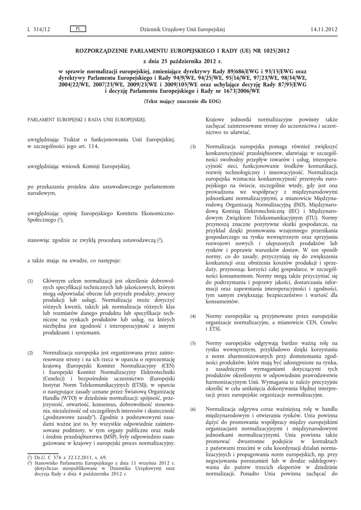 L 316/12 PL Dziennik Urzędowy Unii Europejskiej 14.11.2012 ROZPORZĄDZENIE PARLAMENTU EUROPEJSKIEGO I RADY (UE) NR 1025/2012 z dnia 25 października 2012 r. w sprawie normalizacji europejskiej, zmieniające dyrektywy Rady 89/686/EWG i 93/15/EWG oraz dyrektywy Parlamentu Europejskiego i Rady 94/9/WE, 94/25/WE, 95/16/WE, 97/23/WE, 98/34/WE, 2004/22/WE, 2007/23/WE, 2009/23/WE i 2009/105/WE oraz uchylające decyzję Rady 87/95/EWG i decyzję Parlamentu Europejskiego i Rady nr 1673/2006/WE (Tekst mający znaczenie dla EOG) Krajowe jednostki normalizacyjne powinny także zachęcać zainteresowane strony do uczestnictwa i uczest nictwo to ułatwiać. PARLAMENT EUROPEJSKI I RADA UNII EUROPEJSKIEJ, uwzględniając Traktat o funkcjonowaniu Unii Europejskiej, w szczególności jego art. 114, (3) Normalizacja europejska pomaga również zwiększyć konkurencyjność przedsiębiorstw, ułatwiając w szczegól ności swobodny przepływ towarów i usług, interopera cyjność sieci, funkcjonowanie środków komunikacji, rozwój technologiczny i innowacyjność. Normalizacja europejska wzmacnia konkurencyjność przemysłu euro pejskiego na świecie, szczególnie wtedy, gdy jest ona prowadzona we współpracy z międzynarodowymi jednostkami normalizacyjnymi, a mianowicie Międzyna rodową Organizacją Normalizacyjną (ISO), Międzynaro dową Komisją Elektrotechniczną (IEC) i Międzynaro dowym Związkiem Telekomunikacyjnym (ITU). Normy przynoszą znaczne pozytywne skutki gospodarcze, na przykład dzięki promowaniu wzajemnego przenikania gospodarczego na rynku wewnętrznym oraz sprzyjaniu rozwojowi nowych i ulepszonych produktów lub rynków i poprawie warunków dostaw. W ten sposób normy, co do zasady, przyczyniają się do zwiększenia konkurencji oraz obniżenia kosztów produkcji i sprze daży, przynosząc korzyści całej gospodarce, w szczegól ności konsumentom. Normy mogą także przyczyniać się do podtrzymania i poprawy jakości, dostarczania infor macji oraz zapewniania interoperacyjności i zgodności, tym samym zwiększając bezpieczeństwo i wartość dla konsumentów. (4) Normy europejskie są przyjmowane przez europejskie organizacje normalizacyjne, a mianowicie CEN, Cenelec i ETSI. (5) Normy europejskie odgrywają bardzo ważną rolę na rynku wewnętrznym, przykładowo dzięki korzystaniu z norm zharmonizowanych przy domniemaniu zgod ności produktów, które mają być udostępnione na rynku, z zasadniczymi wymaganiami dotyczącymi tych produktów określonymi w odpowiednim prawodawstwie harmonizacyjnym Unii. Wymagania te należy precyzyjnie określić w celu uniknięcia dokonywania błędnej interpre tacji przez europejskie organizacje normalizacyjne. (6) Normalizacja odgrywa coraz ważniejszą rolę w handlu międzynarodowym i otwieraniu rynków. Unia powinna dążyć do promowania współpracy między europejskimi organizacjami normalizacyjnymi i międzynarodowymi jednostkami normalizacyjnymi. Unia powinna także promować dwustronne podejście w kontaktach z państwami trzecimi w celu koordynacji działań norma lizacyjnych i propagowania norm europejskich, np. przy negocjowaniu porozumień lub w drodze oddelegowy wania do państw trzecich ekspertów w dziedzinie normalizacji. Ponadto Unia powinna zachęcać do uwzględniając wniosek Komisji Europejskiej, po przekazaniu projektu aktu ustawodawczego parlamentom narodowym, uwzględniając opinię Europejskiego Komitetu EkonomicznoSpołecznego (1), stanowiąc zgodnie ze zwykłą procedurą ustawodawczą (2), a także mając na uwadze, co następuje: (1) (2) Głównym celem normalizacji jest określenie dobrowol nych specyfikacji technicznych lub jakościowych, którym mogą odpowiadać obecne lub przyszłe produkty, procesy produkcji lub usługi. Normalizacja może dotyczyć różnych kwestii, takich jak normalizacja różnych klas lub rozmiarów danego produktu lub specyfikacje tech niczne na rynkach produktów lub usług, na których niezbędna jest zgodność i interoperacyjność z innymi produktami i systemami. Normalizacja europejska jest organizowana przez zainte resowane strony i na ich rzecz w oparciu o reprezentację krajową (Europejski Komitet Normalizacyjny (CEN) i Europejski Komitet Normalizacyjny Elektrotechniki (Cenelec)) i bezpośrednie uczestnictwo (Europejski Instytut Norm Telekomunikacyjnych (ETSI)), w oparciu o następujące zasady uznane przez Światową Organizację Handlu (WTO) w dziedzinie normalizacji: spójność, prze jrzystość, otwartość, konsensus, dobrowolność stosowa nia, niezależność od szczególnych interesów i skuteczność („podstawowe zasady”). Zgodnie z podstawowymi zasa dami ważne jest to, by wszystkie odpowiednie zaintere sowane podmioty, w tym organy publiczne oraz małe i średnie przedsiębiorstwa (MŚP), były odpowiednio zaan gażowane w krajowy i europejski proces normalizacyjny. (1) Dz.U. C 376 z 22.12.2011, s. 69. (2) Stanowisko Parlamentu Europejskiego z dnia 11 września 2012 r. (dotychczas nieopublikowane w Dzienniku Urzędowym) oraz decyzja Rady z dnia 4 października 2012 r. 14.11.2012 PL Dziennik Urzędowy Unii Europejskiej kontaktów między europejskimi organizacjami normali zacyjnymi i prywatnymi forami i konsorcjami, przy zachowaniu pierwszeństwa normalizacji europejskiej. Regulacji normalizacji europejskiej służą specjalne ramy prawne składające się z trzech różnych aktów prawnych, a mianowicie dyrektywy 98/34/WE Parlamentu Europej skiego i Rady z dnia 22 czerwca 1998 r. ustanawiającej procedurę udzielania informacji w dziedzinie norm i prze pisów technicznych oraz zasad dotyczących usług społe czeństwa informacyjnego (1), decyzji nr 1673/2006/WE Parlamentu Europejskiego i Rady z dnia 24 października 2006 r. w sprawie finansowania normalizacji europej skiej (2) oraz decyzji Rady 87/95/EWG z dnia 22 grudnia 1986 r. w sprawie normalizacji w dziedzinie technologii informatycznych i telekomunikacji (3). Jednakże obecne ramy prawne nie nadą