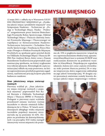 aktualności XXXV DNI PRZEMYSŁU MIĘSNEGO 12 maja 2011 r. odbyły się w Warszawie XXXV DNI PRZEMYSŁU MIĘSNEGO pt. „Problemy jakości mięsa i produktów mięsnych” oraz Sympozjum Naukowo - Techniczne pt. „Postęp w Technologii Mięsa. Nauka - Praktyce” zorganizowane przez Instytut Biotechnologii Przemysłu Rolno-Spożywczego, Oddział Technologii Mięsa i Tłuszczu (dawniej Instytut Przemysłu Mięsnego i Tłuszczowego) we współpracy ze Stowarzyszeniem NaukowoTechnicznym Inżynierów i Techników Przemysłu Spożywczego i Fundacją na Rzecz Rozwoju i Postępu w Polskim Przemyśle Mięsnym. Przybyłych na spotkanie gości powitał dyrektor Oddziału Technologii Mięsa i Tłuszczu IBPRS Pan Andrzej Borys, który wraz z Panem Stanisławem Tyszkiewiczem poprowadzli część seminaryjną spotkania, na której wygłoszono trzy referaty plenarne. Równolegle do części seminaryjnej odbyła się sesja posterowa, na której zaprezentowano przybyłym gościom zagadnienia, nad którymi pracują krajowe placówki badawczo-naukowe. Stan jakościowy mięsa zwierząt rzeźnych Pierwszy wykład pt. „Stan jakościowy mięsa zwierząt rzeźnych z populacji masowej” poprowadził Pan Karol Borzuta z Oddziału Technologii Mięsa i Tłuszczu IBPRS w Poznaniu. Prelegent w pierwszej części wykładu przedstawił zmiany wartości rzeźnej tuczników w okresie ostatnich kilkudziesięciu lat w Polsce. W latach sześćdziesiątych ubiegłego wieku mięsność tuczników populacji masowej utrzymywała się na poziomie 41-44%. Dopiero na przełomie lat dziewięćdziesiątych i na początku XXI wieku nastąpił intensywny wzrost mięsności do pozio6 mu ok. 55% w pogłowiu masowym i wiązał się on z upowszechnieniem obiektywnej, aparaturowej klasyfikacji tusz w systemie EUROP oraz rozliczaniem dostawców na podstawie wyników tej klasyfikacji. Niepokojącym sygnałem zdaniem Autora jest coraz częściej stwierdzany niski poziom tłuszczu poniżej 2% w mięsie wieprzowym, który negatywnie oddziałuje na jego jakość konsumpcyjną. W drugiej części prezentacji omówione zostały kwestie dotyczące jakości mięsa wieprzowego i wołowe- aktualności go, w tym występowania w przetwórstwie wad mięsa: PSE, DFD i tzw. mięsa kwaśnego. Jak wynika z przeprowadzonych badań tusze o pH 4,5≤5,8 w mięśniu najdłuższym grzbietu mają ok. 35% mięsa wodnistego, natomiast o pH 4,5≤6,0 ok. 21%. Wiadomo, że odchylenia PSE występują najczęściej w największych mięśniach szynki i schabu. Od roku 2002 obserwuje się stopniowe obniżenie udziału tuczników z mięsem PSE do ok. 10% (PSE ekstremalne ok. 5%), co jest głównie efektem prac hodowlanych. Straty spowodowane występowaniem wad jakości mięsa, głównie PSE, szacowane są na ok. 2,4% wartości zakupionego żywca. W ostatnich kilkudziesięciu latach jakość mięsa wołowego uległa znacznej poprawie. Udział mięsa DFD zmniejszył się z kilkudziesięciu procent u buhajów i kilkunastu procent u jałówek do kilku procent. Poziom tłuszczu śródmięśniowego zmniejszył się o ok. 0,5%. Normy Kodeksu Żywnościowego Drugi wykład poprowadził Pan Krzysztof Kwiatek z Państwowego Instytutu Weterynaryjnego - Państwowego Instytut Badawczego w Puławach, który przedstawił referat pt. „Rola i wykorzystanie norm Kodeksu Żywnościowego w systemie zapewnienia bezpieczeństwa żywności pochodzenia zwierzęcego". Prelegent podczas wystąpienia przybliżył zagadnienia związane z Kodeksem żywnościowym (Codex Alimentarius) oraz Komisją Kodeksu Żywnościowego FAO/WHO, która powstała w 1963 roku w ramach Wspólnotowego Programu dla Norm dotyczących Żywności powołanego przez Organizację ds. Wyżywienia i Rolnictwa (FAO) oraz Światową Organizację Zdrowia (WHO). Podczas wykładu omówione zostały m.in.: systemowe zarządzanie jakością i bezpieczeństwem żywności w świetle standardów Kodeksu Żywnościowego, podejście „hazard -based” i „risk- based” w systemie zapewnienia bezpieczeństwa żywności z uwzględnieniem doskonalenia ochrony zdrowia publicznego oraz nowe kierunki w kontroli i zapewnieniu bezpieczeństwa żywności i ochrony zdrowia publicznego w świetle norm Kodeksu Żywnościowego. Normy Kodeksu Żywnościowego nie są obowiązkowe, mają charakter zaleceń i dobrych praktyk w zakresie produkcji bezpiecznej żywności o wysokiej jakości oraz uczciwych praktyk międzynarodowego obrotu żywnością. W związku 7 aktualności z nasilającymi się problemami w zakresie bezpieczeństwa żywności, ważne jest podejmowania skutecznych działań zapobiegawczych i poszukiwania rozwiązań systemowych. Zdaniem Autora w budowie systemu bezpieczeństwa żywności powinno się korzystać z dorobku Kodeksu Żywnościowego. Stan jakościowy produktów mięsnych Ostatni referat pt. ,,Jakość handlowa wybranych asortymentów przetworów mięsnych” wygłosił Pan Stanisław Tyszkiewicz z Oddziału Technologii Mięsa i Tłuszczu IBPRS w Warszawie. Prelegent omówił badania porównawcze wybranych rynkowych produktów mięsnych 8 prowadzone w Instytucie, których celem jest określenie stanu jakościowego aktualnie oferowanych wędlin i poznanie mechanizmów kształtowania relacji między jakością i ceną. Na podstawie przeprowadzonych badań starano się określić praktyczne znaczenie obowiązujących przepisów i nieobligatoryjnych norm dla ochrony konsumenta przed ewentualną nieuczciwością producentów i dostawców żywności. Dla przykładu przebadano 182 próbki wybranych wędlin na zawartość benzo(a)pirenu, jako parametru charakteryzującego skażenie produktów wędzonych rakotwórczymi węglowodorami policyklicznymi. Przekroczenie granicznej zawartości 5,0 µg/kg stwierdzo- aktualności no w trzech próbkach asortymentów, mocno wędzonych: „boczku wiejskiego” 6,3 µg/kg, „kiełbasy ze starej wędzarni” 5,1 µg/kg i „kiełbasy z ognia” 12,7 µg/kg. W większości badanych próbek wędlin