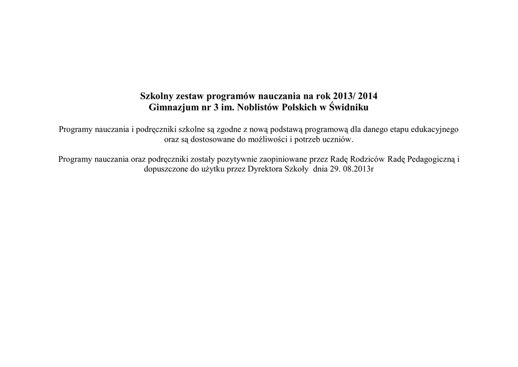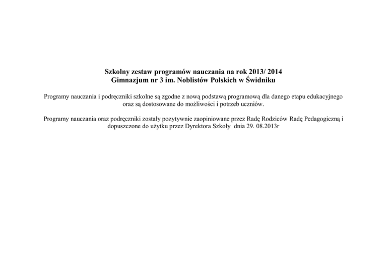 Szkolny zestaw programów nauczania na rok 2013/ 2014 Gimnazjum nr 3 im. Noblistów Polskich w Świdniku Programy nauczania i podręczniki szkolne są zgodne z nową podstawą programową dla danego etapu edukacyjnego oraz są dostosowane do możliwości i potrzeb uczniów. Programy nauczania oraz podręczniki zostały pozytywnie zaopiniowane przez Radę Rodziców Radę Pedagogiczną i dopuszczone do użytku przez Dyrektora Szkoły dnia 29. 08.2013r Szkolny zestaw programów nauczania dla klas I w roku szkolnym 2013/2014 Autor i tytuł programu Przedmiot „Słowa na czasie” Program nauczania języka polskiego w klasach I–III gimnazjum Język polski Język niemiecki Język hiszpański Język angielski Historia Wychowanie do życia w rodzinie Biologia Geografia Chemia Fizyka Matematyka M. Stelmach –Kopeć, E. Rudnicka, M. Lechnio-Lewicka, E. Kulczyńska, D. Jabłońska, I. Rubaj Modyfikacja programu nauczania języka polskiego w gimnazjum. „Po polsku” Jolanta Malczewska (modyfikacja M. Stelmach –Kopeć, E. Rudnicka, M. Lechnio-Lewicka, E. Kulczyńska, D. Jabłońska, M. Latoch-Zielińska) Program nauczania języka niemieckiego w klasach I – III gimnazjum. Kurs podstawowy , Irena Nowicka, Dorota Wieruszewskaa Program nauczania języka hiszpańskiego w gimnazjum na poziom podstawowy, wyd. EDELSA Program nauczania języka angielskiego. Kurs kontynuacyjny (III.1) w klasach 1-3 gimnazjum zgodny z nową podstawą programową obowiązującą od 2009 r. Autor: Magdalena Kębłowska klasy angielskie Modyfikowany program nauczania języka angielskiego. Kurs kontynuacyjny (III.1) w klasach 1-3 gimnazjum zgodny z nową podstawą programową obowiązującą od 2009 r. Autor: Magdalena Kębłowska (modyfikacja – Marcin Paśnikowski, Urszula Burda) Numer w szkolnym zestawie programów GIM – 3/1/2011/2012 GIM – 3/1/ 2009/2010 GIM – 3/2/2009/2010 GIM – 3/2/2011/2012 GIM – 3/5/ 2009/2010 GIM – 3/ 6/2009/2010 S. Roszak, "Śladami przeszłości" GIM – 3/7/2009/2010 Krystyna Maśnik, Grażyna Węglarczyk, Teresa Król „Wędrując ku dorosłości. GIM – 3/18/2009/2010 Modyfikacja programu „Ciekawa biologia”- E. Kłos, M. Kukier, W. Kofta (modyfikacja J. Paterek, M. Walaszek) Modyfikacja programu „Ciekawa biologia”- E. Kłos, M. Kukier, W. Kofta dla klasy dwujęzycznej z j. hiszpańskim (B. Adasik) Program nauczania geografii dla gimnazjum , autor Ewa Maria Tuz Chemia Nowej Ery –program nauczania chemii w gimnazjum – J. Jarosz, E.Kurek, M.Walaszek Program nauczania chemii dla klasy dwujęzycznej z językiem angielskim E. Kurek Program nauczania fizyki w gimnazjum "Spotkania z fizyką" Autorzy: Grażyna Francuz -Ornat, Teresa Kulawik. Modyfikacja programu Matematyka wokół nas- gimnazjum A. Drężek dla klasy dwujęzycznej z j. angielskim - A. Seremak Program nauczania. Matematyka wokół nas- gimnazjum A. Drężek. GIM – 3/8/2009/2010 GIM – 3/3/2011/2012 GIM – 3/9/2009/2010 GIM – 3/10/2009/2010 GIM – 3/4/2011/2012 GIM – 3/11/2009/2010 GIM – 3/5/2011/2012 GIM – 3/12/2009/2010 Muzyka Wychowanie fizyczne Religia Etyka Informatyka Klasy matematyczne Programu nauczania. Matematyka wokół nas- gimnazjum A. Drężek (modyfikacja programu P. Błądek) Program nauczania dla klasy I „Muzyka” Krystyna Serwańska Program do nauczania wychowania fizycznego w gimnazjum Program klasy sportowej – profil piłka siatkowa, Małgorzata Skalińska-Królik Program ogólnopolski Wierzyć Chrystusowi , nr AZ-3-01/1 Ludzkie ścieżki - kompleksowy program nauczania etyki na II, III i IV poziomie edukacyjnym Jolanta Pańczyk, Jarosław Skłodowski Informatyka Europejczyka GIM – 3/13/2009/2010 GIM – 3/16/2009/2010 GIM – 3/17/2009/2010 GIM – 3/8/2011/2012 GIM – 3/19/2009/2010 GIM – 3/1/2012/2013 GIM – 3/14/2009/2010 Szkolny zestaw programów nauczania dla klas II w roku szkolnym 2013/2014 Autor i tytuł programu Przedmiot „Słowa na czasie” Program nauczania języka polskiego w klasach I–III gimnazjum Język polski Język niemiecki Język hiszpański Język angielski Historia Wychowanie do życia w rodzinie Wiedza o społeczeństwie Biologia Geografia Chemia Fizyka Matematyka M. Stelmach –Kopeć, E. Rudnicka, M. Lechnio-Lewicka, E. Kulczyńska, D. Jabłońska, I. Rubaj Modyfikacja programu nauczania języka polskiego w gimnazjum. „Po polsku” Jolanta Malczewska (modyfikacja M. Stelmach –Kopeć, E. Rudnicka, M. Lechnio-Lewicka, E. Kulczyńska, D. Jabłońska, M. Latoch-Zielińska) Program nauczania języka niemieckiego w klasach I – III gimnazjum. Kurs podstawowy , Irena Nowicka, Dorota Wieruszewskaa Program nauczania języka hiszpańskiego w gimnazjum na poziom podstawowy, wyd. EDELSA Program nauczania języka angielskiego. Kurs kontynuacyjny (III.1) w klasach 1-3 gimnazjum zgodny z nową podstawą programową obowiązującą od 2009 r. Autor: Magdalena Kębłowska klasy angielskie Modyfikowany program nauczania języka angielskiego. Kurs kontynuacyjny (III.1) w klasach 1-3 gimnazjum zgodny z nową podstawą programową obowiązującą od 2009 r. Autor: Magdalena Kębłowska (modyfikacja – Marcin Paśnikowski, Urszula Burda) Numer w szkolnym zestawie programów GIM – 3/1/2011/2012 GIM – 3/1/ 2009/2010 GIM – 3/2/2009/2010 GIM – 3/2/2011/2012 GIM – 3/5/ 2009/2010 GIM – 3/ 6/2009/2010 S. Roszak, "Śladami przeszłości" GIM – 3/7/2009/2010 Krystyna Maśnik, Grażyna Węglarczyk, Teresa Król „Wędrując ku dorosłości. GIM – 3/18/2009/2010 I. Janicka, A. Kucia, T. Maćkowski "Dziś i jutro" GIM – 3/20/2009/2010 Modyfikacja programu „Ciekawa biologia”- E. Kłos, M. Kukier, W. Kofta (modyfikacja J. Paterek, M. Walaszek) Modyfikacja programu „Ciekawa biologia”- E. Kłos, M. Kukier, W. Kofta dla klasy dwujęzycznej z j. hiszpańskim (B. Adasik) Program nauczania geografii dla gimnazjum , autor Ewa Maria Tuz Chemia Nowej Ery –program nauczania chemii w gimnazjum – J. Jarosz, E.Kurek, M.Walaszek Program nauczania ch