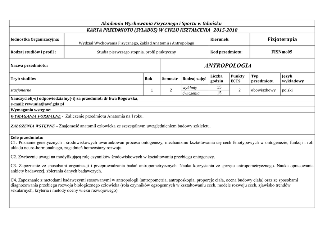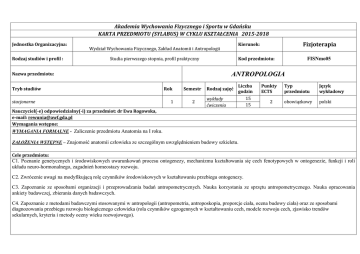 Akademia Wychowania Fizycznego i Sportu w Gdańsku KARTA PRZEDMIOTU (SYLABUS) W CYKLU KSZTAŁCENIA 2015-2018 Jednostka Organizacyjna: Rodzaj studiów i profil : ANTROPOLOGIA Nazwa przedmiotu: stacjonarne FISNmo05 Kod przedmiotu: Studia pierwszego stopnia, profil praktyczny Tryb studiów Fizjoterapia Kierunek: Wydział Wychowania Fizycznego, Zakład Anatomii i Antropologii Rok 1 Semestr 2 Rodzaj zajęć wykłady ćwiczenia Liczba godzin 15 15 Punkty ECTS 2 Typ przedmiotu Język wykładowy obowiązkowy polski Nauczyciel(-e) odpowiedzialny(-i) za przedmiot: dr Ewa Rogowska, e-mail: [email protected] Wymagania wstępne: WYMAGANIA FORMALNE - Zaliczenie przedmiotu Anatomia na I roku. ZAŁOŻENIA WSTĘPNE – Znajomość anatomii człowieka ze szczególnym uwzględnieniem budowy szkieletu. Cele przedmiotu: C1. Poznanie genetycznych i środowiskowych uwarunkowań procesu ontogenezy, mechanizmu kształtowania się cech fenotypowych w ontogenezie, funkcji i roli układu neuro-hormonalnego, zagadnień homeostazy rozwoju. C2. Zwrócenie uwagi na modyfikującą rolę czynników środowiskowych w kształtowaniu przebiegu ontogenezy. C3. Zapoznanie ze sposobami organizacji i przeprowadzania badań antropometrycznych. Nauka korzystania ze sprzętu antropometrycznego. Nauka opracowania ankiety badawczej, zbierania danych badawczych. C4. Zapoznanie z metodami badawczymi stosowanymi w antropologii (antropometria, antroposkopia, proporcje ciała, ocena budowy ciała) oraz ze sposobami diagnozowania przebiegu rozwoju biologicznego człowieka (rola czynników egzogennych w kształtowaniu cech, modele rozwoju cech, zjawisko trendów sekularnych, kryteria i metody oceny wieku rozwojowego). Opis efektów kształcenia dla przedmiotu oraz ich powiązanie z efektami kształcenia dla kierunku: WIEDZA W1 Zna i rozumie podstawy budowy, funkcjonowania i czynności organizmu ludzkiego oraz podstawowe procesy zachodzące w organizmie człowieka w ontogenezie. W2 Zna i rozumie kolejne etapy rozwoju ontogenetycznego człowieka, zmiany jakie zachodzą w ich trakcie w organizmie człowieka i ich związek z z warunkami panującymi w otaczającym środowisku. W3 Zna i rozumie miejsca człowieka w przyrodzie jako istoty biologicznej i społecznej oraz znaczenie i wpływ czynników środowiskowych i społeczno-ekonomicznych jako modyfikatorów poziomu rozwoju w różnych okresach życia człowieka. W4 Zna podstawowe metody i techniki pomiarowe do oceny rozwoju fizycznego. (K_W01) (K_W05) (K_W03) (K_W05) (K_W02) (K_W02) UMIEJĘTNOŚCI U1 Potrafi lokalizować oraz opisywać położenie punktów antropometrycznych niezbędnych do wykonania pomiarów poszczególnych cech somatycznych. Potrafi prawidłowo korzystać ze sprzętu antropometrycznego. U2 Potrafi zaplanować badania antropometryczne w terenie, dobrać odpowiedni do badań sprzęt antropometryczny, wybrać grupę badawczą, zaprojektować ankietę badawczą. U3 Potrafi prawidłowo wykorzystać podstawowe metody i techniki pomiarowe do oceny rozwoju fizycznego. U4 Potrafi przeprowadzić podstawową analizę materiału badawczego wykorzystując metody oceny poziomu rozwoju biologicznego. (K_U12) (K_U13) (K_U11) (K_U12) Posiada kompetencje do samodzielnego i zespołowego angażowania się w realizację stawianych przed nim celów i zadań, projektuje i wykonuje działania edukacyjne w różnych środowiskach społecznych. (K_K02) (K_K08) Posiada kompetencje do prawidłowego nawiązywania relacji społecznych. (K_K06) Umiejętnie komunikuje się przy użyciu różnych technik, zarówno z osobami będącymi podmiotami działalności pedagogicznej, jak i z innymi osobami współdziałającymi w procesie dydaktycznym. (K_K06) (K_K10) (K_U02) (K_U02) (K_U09) (K_U12) KOMPETENCJE K1 K2 K3 Kryteria i metody oceny osiągniętych efektów kształcenia: Aby uzyskać zaliczenie przedmiotu na ocenę dostateczną student musi osiągnąć wszystkie wymienione w programie efekty kształcenia. Zaliczenie ćwiczeń obejmuje: a) kolokwium praktyczne z umiejętności wykonywania pomiarów antropometrycznych (20% oceny całkowitej), b) kolokwium pisemne ze znajomości metod analizy danych i metod oceny poziomu rozwoju fizycznego (30% oceny całkowitej). Zaliczenie kolokwium wymaga udzielenia minimum 60% poprawnych odpowiedzi. Kolokwium pisemne z tematyki wykładowej (ocena pozytywna wymaga udzielenia min. 60% poprawnych odpowiedzi) - 50% oceny całkowitej. Aby uzyskać zaliczenie przedmiotu na ocenę dostateczną student musi osiągnąć wszystkie wymienione przedmiotowe efekty kształcenia. Metody i formy realizacji przedmiotu: Przedmiot jest realizowany w formie ćwiczeń i wykładów. Ćwiczenia mają charakter praktyczny: po zapoznaniu z konstrukcją i użyciem przyrządów antropometrycznych oraz zapoznaniu z lokalizacją punktów antropometrycznych studenci pracując w zespołach przeprowadzają cykl pomiarów antropometrycznych. Uzyskane dane są następnie przetwarzane w poznawanych metodach analizy danych. Wykład - prezentacja multimedialna (40% wykładów – 6 godzin – realizowanych jest w formie kształcenia on-line). Treści kształcenia: Wykłady: Genetyczne i środowiskowe uwarunkowania rozwoju biologicznego człowieka. • genetyczne i środowiskowe uwarunkowania procesu ontogenezy, mechanizm kształtowania się cech fenotypowych w ontogenezie (rozwój i jego składowe, czynniki rozwoju, kinetyka i dynamika zjawisk rozwojowych, charakterystyka okresów ontogenetycznych człowieka, mechanizm i przejawy trendów sekularnych); • dymorfizm płciowy (podstawy genetyczne dymorfizmu, cechy dymorficzne i różnice dymorficzne); • podstawy nauki o dziedziczności (cecha ilościowa i jakościowa); • relacje osobnik - populacja – środowisko (norma reakcji osobnika i norma adaptacyjna populacji, norma i normalność); • zagadnienia samoregulacji procesu ontogenezy (homeostaza rozwojowa, koncepcja plastyczności i kanalizacji rozwoju, regulacja neuro-hormonalna rozwoju); • szcz
