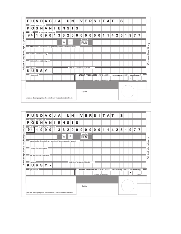 F U N D A C J A U N I V E R S I T A T I S P O S N A N I E N S I S l.k. nr rachunku odbiorcy 94 1 0 9 0 1 3 6 2 0 0 0 0 0 0 0 1 1 4 2 5 1 9 7 7 W P waluta PLN Odcinek dla odbiorcy Polecenie przelewu / wpłata gotówkowa nazwa odbiorcy cd. nr rachunku zleceniodawcy (przelew) / kwota słownie (wpłata) nazwa zleceniodawcy nazwa zleceniodawcy cd. IMIĘ I NAZWISKO KURSANTA tytułem K U R S Y - NAZWA PRZEDMIOTU – TRYB („ROZ”= tytułem cd. rozszerzony, „POD”= podstawowy) - NAZWA PRZEDMIOTU TRYB Opłata: pieczęć, data i podpis(y) zleceniodawcy na ostatnim blankiecie F U N D A C J A U N I V E R S I T A T I S P O S N A N I E N S I S l.k. nr rachunku odbiorcy 94 1 0 9 0 1 3 6 2 0 0 0 0 0 0 0 1 1 4 2 5 1 9 7 7 W P waluta PLN Odcinek dla odbiorcy Polecenie przelewu / wpłata gotówkowa nazwa odbiorcy cd. nr rachunku zleceniodawcy (przelew) / kwota słownie (wpłata) nazwa zleceniodawcy nazwa zleceniodawcy cd. tytułem K U R S Y - IMIĘ I NAZWISKO KURSANTA tytułem cd. NAZWA PRZEDMIOTU – TRYB („ROZ”= NAZWA PRZEDMIOTU Opłata: pieczęć, data i podpis(y) zleceniodawcy na ostatnim blankiecie rozszerzony, „POD”= podstawowy) - TRYB