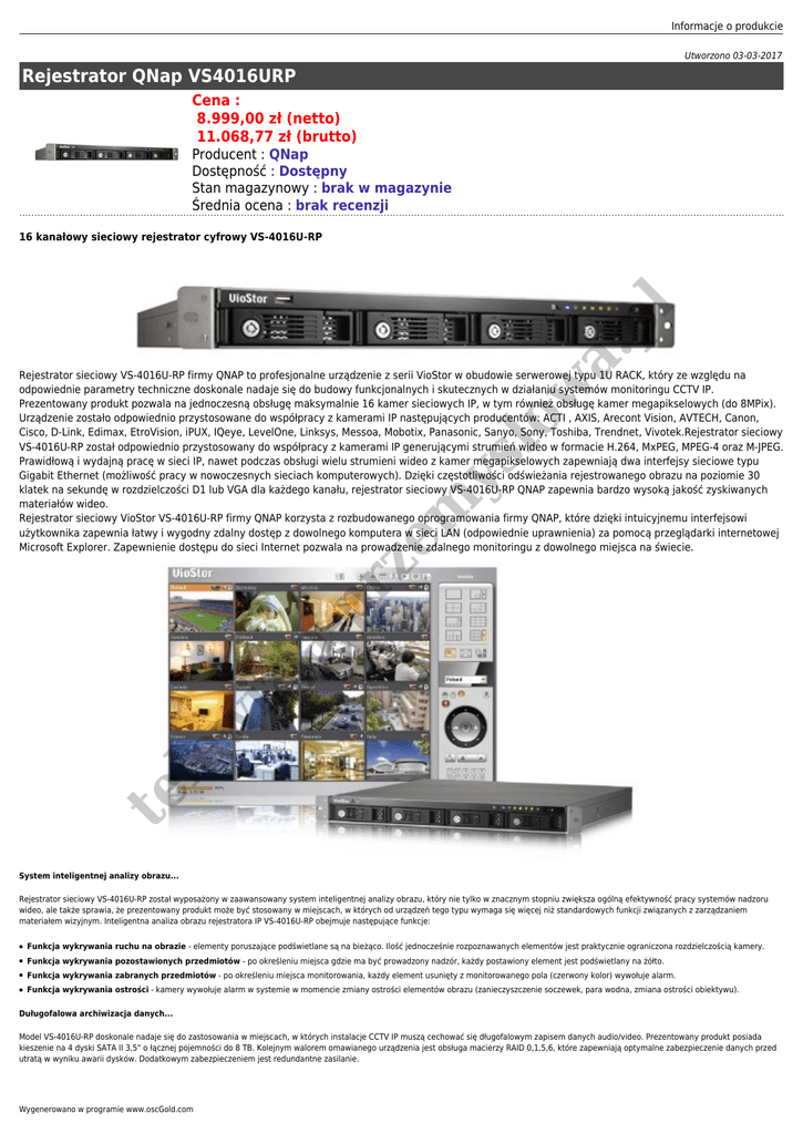 Informacje o produkcie Utworzono 03-03-2017 Rejestrator QNap VS4016URP Cena : 8.999,00 zł (netto) 11.068,77 zł (brutto) Producent : QNap Dostępność : Dostępny Stan magazynowy : brak w magazynie Średnia ocena : brak recenzji a. pl 16 kanałowy sieciowy rejestrator cyfrowy VS-4016U-RP te le w iz ja -p r ze m ys lo w Rejestrator sieciowy VS-4016U-RP firmy QNAP to profesjonalne urządzenie z serii VioStor w obudowie serwerowej typu 1U RACK, który ze względu na odpowiednie parametry techniczne doskonale nadaje się do budowy funkcjonalnych i skutecznych w działaniu systemów monitoringu CCTV IP. Prezentowany produkt pozwala na jednoczesną obsługę maksymalnie 16 kamer sieciowych IP, w tym również obsługę kamer megapikselowych (do 8MPix). Urządzenie zostało odpowiednio przystosowane do współpracy z kamerami IP następujących producentów: ACTI , AXIS, Arecont Vision, AVTECH, Canon, Cisco, D-Link, Edimax, EtroVision, iPUX, IQeye, LevelOne, Linksys, Messoa, Mobotix, Panasonic, Sanyo, Sony, Toshiba, Trendnet, Vivotek.Rejestrator sieciowy VS-4016U-RP został odpowiednio przystosowany do współpracy z kamerami IP generującymi strumień wideo w formacie H.264, MxPEG, MPEG-4 oraz M-JPEG. Prawidłową i wydajną pracę w sieci IP, nawet podczas obsługi wielu strumieni wideo z kamer megapikselowych zapewniają dwa interfejsy sieciowe typu Gigabit Ethernet (możliwość pracy w nowoczesnych sieciach komputerowych). Dzięki częstotliwości odświeżania rejestrowanego obrazu na poziomie 30 klatek na sekundę w rozdzielczości D1 lub VGA dla każdego kanału, rejestrator sieciowy VS-4016U-RP QNAP zapewnia bardzo wysoką jakość zyskiwanych materiałów wideo. Rejestrator sieciowy VioStor VS-4016U-RP firmy QNAP korzysta z rozbudowanego oprogramowania firmy QNAP, które dzięki intuicyjnemu interfejsowi użytkownika zapewnia łatwy i wygodny zdalny dostęp z dowolnego komputera w sieci LAN (odpowiednie uprawnienia) za pomocą przeglądarki internetowej Microsoft Explorer. Zapewnienie dostępu do sieci Internet pozwala na prowadzenie zdalnego monitoringu z dowolnego miejsca na świecie. System inteligentnej analizy obrazu... Rejestrator sieciowy VS-4016U-RP został wyposażony w zaawansowany system inteligentnej analizy obrazu, który nie tylko w znacznym stopniu zwiększa ogólną efektywność pracy systemów nadzoru wideo, ale także sprawia, że prezentowany produkt może być stosowany w miejscach, w których od urządzeń tego typu wymaga się więcej niż standardowych funkcji związanych z zarządzaniem materiałem wizyjnym. Inteligentna analiza obrazu rejestratora IP VS-4016U-RP obejmuje następujące funkcje: ● Funkcja wykrywania ruchu na obrazie - elementy poruszające podświetlane są na bieżąco. Ilość jednocześnie rozpoznawanych elementów jest praktycznie ograniczona rozdzielczością kamery. ● Funkcja wykrywania pozostawionych przedmiotów - po określeniu miejsca gdzie ma być prowadzony nadzór, każdy postawiony element jest podświetlany na żółto. ● Funkcja wykrywania zabranych przedmiotów - po określeniu miejsca monitorowania, każdy element usunięty z monitorowanego pola (czerwony kolor) wywołuje alarm. ● Funkcja wykrywania ostrości - kamery wywołuje alarm w systemie w momencie zmiany ostrości elementów obrazu (zanieczyszczenie soczewek, para wodna, zmiana ostrości obiektywu). Duługofalowa archiwizacja danych... Model VS-4016U-RP doskonale nadaje się do zastosowania w miejscach, w których instalacje CCTV IP muszą cechować się długofalowym zapisem danych audio/video. Prezentowany produkt posiada kieszenie na 4 dyski SATA II 3,5" o łącznej pojemności do 8 TB. Kolejnym walorem omawianego urządzenia jest obsługa macierzy RAID 0,1,5,6, które zapewniają optymalne zabezpieczenie danych przed utratą w wyniku awarii dysków. Dodatkowym zabezpieczeniem jest redundantne zasilanie. Wygenerowano w programie www.oscGold.com Specyfikacja techniczna ● ● ● ● ● kanały wideo: 16 kanały audio: 16 kompresja: H.264, MxPEG, MPEG-4, M-JPEG pojemność dysku: do 8TB prędkość: 30 kl/s rejestracja w czasie rzeczywistym sygnału video i audio z maksymalnie 16 kamer IP ● obsługa sygnału strumieniowego z kamer sieciowych i serwerów video ● wysokiej jakości zapis sygnałów H.264, MxPEG, MPEG-4, M-JPEG (zależne od kamery) ● obsługa kamery sieciowych o rozdzielczości do 8Mpix ● kompletne funkcje zapisu: wg kalendarza, alarmu, wykrycia ruchu, zapis przed i po alarmie ● pojemność systemu do 8TB zapewnia długofalowy zapis ● łatwe wyszukiwanie nagrań wg daty, linii czasowej, zdarzeń, inteligentnej analizy obrazu ● zdalne zarządzanie systemem poprzez przeglądarkę internetową ● dostęp do odtwarzania plików przez przeglądarkę, FTP lub otoczenie sieciowe ● instalacja systemu i uruchomienie w 6 łatwych krokach ● szybkie wyszukiwanie kamer w sieci i ich instalacja ● centralny monitoring z funkcją "kliknij i skieruj" oraz obsługą PTZ ● cyfrowy zoom w trybie monitoringu i odtwarzania ● kolejność wyświetlania obrazu (kamer) może być łatwo zmieniana (przenieś i upuść) ● informacja o zdarzeniach wyświetlana na bieżąco na ekranie ● szczegółowa lista zdarzeń i logi (w tym lista użytkowników i daty podglądu plików) ● możliwość zdalnej replikacji (kopia) danych na dyski sieciowe ● lista pracujących użytkowników on-line i pełna kontrola dostępu do systemu ● odtwarzanie plików wielokanałowe z różnymi prędkościami ● zaawansowany tryb oznaczania plików cyfrowymi znacznikami ● automatyczny start rejestracji po przywróceniu zasilania ● współpraca z zasilaczami awaryjnymi ● infrastruktura systemu oparta na DOM (dysk na modułach) dla zabezpieczenia pracy -p r ze m ys lo w a. pl ● w iz ja Monitoring IP te le Coraz powszechniejsze stają się systemy monitoringu wizyjnego oparte o kamery IP oraz sieci komputerowe z protokołem TCP/IP (przewodowe i bezprzewodow