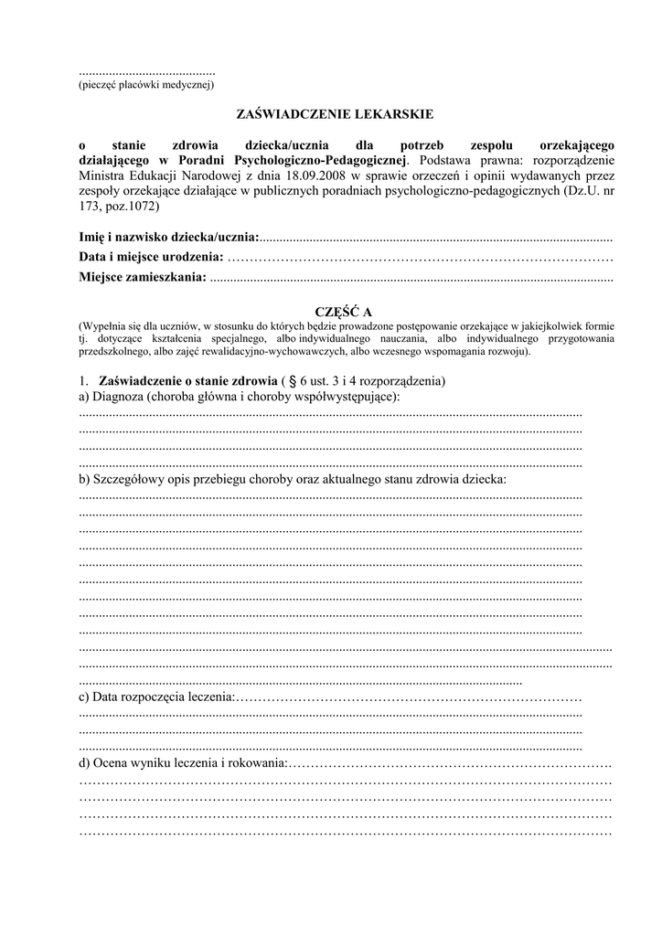 ......................................... (pieczęć placówki medycznej) ZAŚWIADCZENIE LEKARSKIE o stanie zdrowia dziecka/ucznia dla potrzeb zespołu orzekającego działającego w Poradni Psychologiczno-Pedagogicznej. Podstawa prawna: rozporządzenie Ministra Edukacji Narodowej z dnia 18.09.2008 w sprawie orzeczeń i opinii wydawanych przez zespoły orzekające działające w publicznych poradniach psychologiczno-pedagogicznych (Dz.U. nr 173, poz.1072) Imię i nazwisko dziecka/ucznia:.......................................................................................................... Data i miejsce urodzenia: …………………………………………………………………………… Miejsce zamieszkania: ......................................................................................................................... CZĘŚĆ A (Wypełnia się dla uczniów, w stosunku do których będzie prowadzone postępowanie orzekające w jakiejkolwiek formie tj. dotyczące kształcenia specjalnego, albo indywidualnego nauczania, albo indywidualnego przygotowania przedszkolnego, albo zajęć rewalidacyjno-wychowawczych, albo wczesnego wspomagania rozwoju). 1. Zaświadczenie o stanie zdrowia ( § 6 ust. 3 i 4 rozporządzenia) a) Diagnoza (choroba główna i choroby współwystępujące): ....................................................................................................................................................... ....................................................................................................................................................... ....................................................................................................................................................... ....................................................................................................................................................... b) Szczegółowy opis przebiegu choroby oraz aktualnego stanu zdrowia dziecka: ....................................................................................................................................................... ....................................................................................................................................................... ....................................................................................................................................................... ....................................................................................................................................................... ....................................................................................................................................................... ....................................................................................................................................................... ....................................................................................................................................................... ....................................................................................................................................................... ....................................................................................................................................................... ................................................................................................................................................................ ................................................................................................................................................................ ..................................................................................................................................... c) Data rozpoczęcia leczenia:…………………………………………………………………… ....................................................................................................................................................... ....................................................................................................................................................... ....................................................................................................................................................... d) Ocena wyniku leczenia i rokowania:………………………………………………………………. ………………………………………………………………………………………………………… ………………………………………………………………………………………………………… ………………………………………………………………………………………………………… ………………………………………………………………………………………………………… CZĘŚĆ B (Wypełnia się tylko w przypadku ubiegania się o indywidualne nauczanie lub indywidualne przygotowanie przedszkola) 2. Określenie, czy stan zdrowia dziecka/ucznia: (właściwe podkreślić) UNIEMOśLIWIA uczęszczanie do przedszkola/szkoły ZNACZNIE UTRUDNIA uczęszczanie do przedszkola/szkoły 3. Określenie czasu, w którym stan zdrowia dziecka uniemoŜliwia lub znacznie utrudnia uczęszczanie do przedszkola lub szkoły (§ 6, ust. 4 pkt 1 rozporządzenia): ………………………………………………………………………………………………………… ………………………………………………………………………………………………………… ………………………………………………………………………………………………………… ………………………………………………………………………… 4. Określenie rozpoznania choroby lub innej przyczyny powodującej, Ŝe stan zd