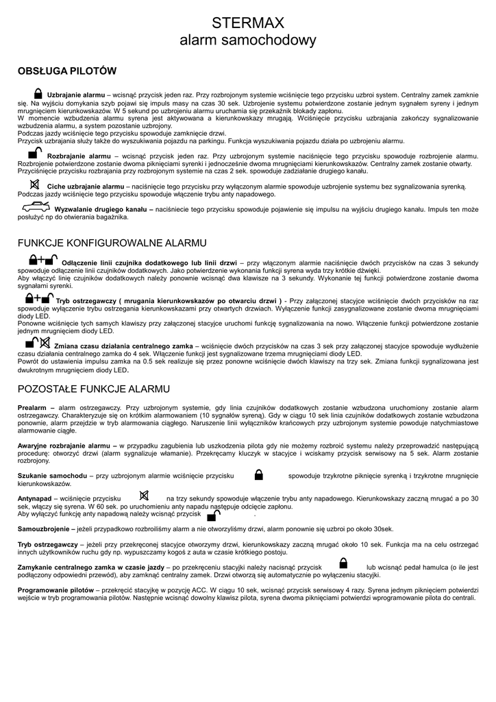 STERMAX alarm samochodowy OBSŁUGA PILOTÓW Uzbrajanie alarmu – wcisnąć przycisk jeden raz. Przy rozbrojonym systemie wciśnięcie tego przycisku uzbroi system. Centralny zamek zamknie się. Na wyjściu domykania szyb pojawi się impuls masy na czas 30 sek. Uzbrojenie systemu potwierdzone zostanie jednym sygnałem syreny i jednym mrugnięciem kierunkowskazów. W 5 sekund po uzbrojeniu alarmu uruchamia się przekaźnik blokady zapłonu. W momencie wzbudzenia alarmu syrena jest aktywowana a kierunkowskazy mrugają. Wciśnięcie przycisku uzbrajania zakończy sygnalizowanie wzbudzenia alarmu, a system pozostanie uzbrojony. Podczas jazdy wciśnięcie tego przycisku spowoduje zamknięcie drzwi. Przycisk uzbrajania służy także do wyszukiwania pojazdu na parkingu. Funkcja wyszukiwania pojazdu działa po uzbrojeniu alarmu. Rozbrajanie alarmu – wcisnąć przycisk jeden raz. Przy uzbrojonym systemie naciśnięcie tego przycisku spowoduje rozbrojenie alarmu. Rozbrojenie potwierdzone zostanie dwoma piknięciami syrenki i jednocześnie dwoma mrugnięciami kierunkowskazów. Centralny zamek zostanie otwarty. Przyciśnięcie przycisku rozbrajania przy rozbrojonym systemie na czas 2 sek. spowoduje zadziałanie drugiego kanału. Ciche uzbrajanie alarmu – naciśnięcie tego przycisku przy wyłączonym alarmie spowoduje uzbrojenie systemu bez sygnalizowania syrenką. Podczas jazdy wciśnięcie tego przycisku spowoduje włączenie trybu anty napadowego. Wyzwalanie drugiego kanału – naciśniecie tego przycisku spowoduje pojawienie się impulsu na wyjściu drugiego kanału. Impuls ten może posłużyć np do otwierania bagażnika. FUNKCJE KONFIGUROWALNE ALARMU Odłączenie linii czujnika dodatkowego lub linii drzwi – przy włączonym alarmie naciśnięcie dwóch przycisków na czas 3 sekundy spowoduje odłączenie linii czujników dodatkowych. Jako potwierdzenie wykonania funkcji syrena wyda trzy krótkie dźwięki. Aby włączyć linię czujników dodatkowych należy ponownie wcisnąć dwa klawisze na 3 sekundy. Wykonanie tej funkcji potwierdzone zostanie dwoma sygnałami syrenki. Tryb ostrzegawczy ( mrugania kierunkowskazów po otwarciu drzwi ) - Przy załączonej stacyjce wciśnięcie dwóch przycisków na raz spowoduje wyłączenie trybu ostrzegania kierunkowskazami przy otwartych drzwiach. Wyłączenie funkcji zasygnalizowane zostanie dwoma mrugnięciami diody LED. Ponowne wciśnięcie tych samych klawiszy przy załączonej stacyjce uruchomi funkcję sygnalizowania na nowo. Włączenie funkcji potwierdzone zostanie jednym mrugnięciem diody LED. Zmiana czasu działania centralnego zamka – wciśnięcie dwóch przycisków na czas 3 sek przy załączonej stacyjce spowoduje wydłużenie czasu działania centralnego zamka do 4 sek. Włączenie funkcji jest sygnalizowane trzema mrugnięciami diody LED. Powrót do ustawienia impulsu zamka na 0.5 sek realizuje się przez ponowne wciśnięcie dwóch klawiszy na trzy sek. Zmiana funkcji sygnalizowana jest dwukrotnym mrugnięciem diody LED. POZOSTAŁE FUNKCJE ALARMU Prealarm – alarm ostrzegawczy. Przy uzbrojonym systemie, gdy linia czujników dodatkowych zostanie wzbudzona uruchomiony zostanie alarm ostrzegawczy. Charakteryzuje się on krótkim alarmowaniem (10 sygnałów syreną). Gdy w ciągu 10 sek linia czujników dodatkowych zostanie wzbudzona ponownie, alarm przejdzie w tryb alarmowania ciągłego. Naruszenie linii wyłączników krańcowych przy uzbrojonym systemie powoduje natychmiastowe alarmowanie ciągłe. Awaryjne rozbrajanie alarmu – w przypadku zagubienia lub uszkodzenia pilota gdy nie możemy rozbroić systemu należy przeprowadzić następującą procedurę: otworzyć drzwi (alarm sygnalizuje włamanie). Przekręcamy kluczyk w stacyjce i wciskamy przycisk serwisowy na 5 sek. Alarm zostanie rozbrojony. Szukanie samochodu – przy uzbrojonym alarmie wciśnięcie przycisku kierunkowskazów. spowoduje trzykrotne piknięcie syrenką i trzykrotne mrugnięcie Antynapad – wciśnięcie przycisku na trzy sekundy spowoduje włączenie trybu anty napadowego. Kierunkowskazy zaczną mrugać a po 30 sek, włączy się syrena. W 60 sek. po uruchomieniu anty napadu następuje odcięcie zapłonu. Aby wyłączyć funkcję anty napadową należy wcisnąć przycisk . Samouzbrojenie – jeżeli przypadkowo rozbroiliśmy alarm a nie otworzyliśmy drzwi, alarm ponownie się uzbroi po około 30sek. Tryb ostrzegawczy – jeżeli przy przekręconej stacyjce otworzymy drzwi, kierunkowskazy zaczną mrugać około 10 sek. Funkcja ma na celu ostrzegać innych użytkowników ruchu gdy np. wypuszczamy kogoś z auta w czasie krótkiego postoju. Zamykanie centralnego zamka w czasie jazdy – po przekręceniu stacyjki należy nacisnąć przycisk lub wcisnąć pedał hamulca (o ile jest podłączony odpowiedni przewód), aby zamknąć centralny zamek. Drzwi otworzą się automatycznie po wyłączeniu stacyjki. Programowanie pilotów – przekręcić stacyjkę w pozycję ACC. W ciągu 10 sek, wcisnąć przycisk serwisowy 4 razy. Syrena jednym piknięciem potwierdzi wejście w tryb programowania pilotów. Następnie wcisnąć dowolny klawisz pilota, syrena dwoma piknięciami potwierdzi wprogramowanie pilota do centrali.