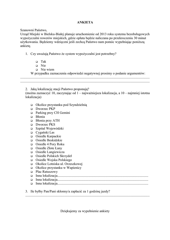 ANKIETA Szanowni Państwo, Urząd Miejski w Bielsku-Białej planuje uruchomienie od 2013 roku systemu bezobsługowych wypożyczalni rowerów miejskich, gdzie opłata będzie naliczana po przekroczeniu 30 minut użytkowania. Będziemy wdzięczni jeśli zechcą Państwo nam pomóc wypełniając poniższą ankietę. 1. Czy uważają Państwo że system wypożyczalni jest potrzebny? Tak Nie Nie wiem W przypadku zaznaczenia odpowiedzi negatywnej prosimy o podanie argumentów: ....................................................................................................................................................... ....................................................................................................................................................... 2. Jaką lokalizację stacji Państwo proponują? (można zaznaczyć 10, zaczynając od 1 – najważniejsza lokalizacja, a 10 – najmniej istotna lokalizacja) Okolice przystanku pod Szyndzielnią Dworzec PKP Parking przy CH Gemini Błonia Błonia przy ATH Dworzec PKS Szpital Wojewódzki Cygański Las Osiedle Karpackie Osiedle Beskidzkie Osiedle 4 Pory Roku Osiedle Złote Łany Osiedle Langiewicza Osiedle Polskich Skrzydeł Osiedle Wojska Polskiego Okolice Lotniska ul. Orzeszkowej Okolice przystanku w Wapienicy Plac Ratuszowy Inna lokalizacja.......................................................................................................... Inna lokalizacja.......................................................................................................... Inna lokalizacja.......................................................................................................... 3. Ile byłby Pan/Pani skłonny/a zapłacić za 1 godzinę jazdy? ................................................................................................................................................. Dziękujemy za wypełnienie ankiety