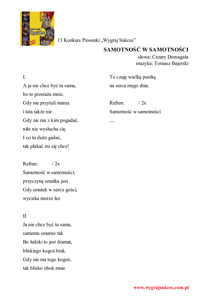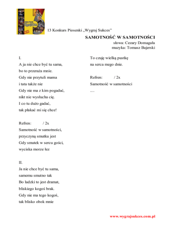 13 Konkurs Piosenki „Wygraj Sukces” SAMOTNOŚĆ W SAMOTNOŚCI słowa: Cezary Domagała muzyka: Tomasz Bajerski I. To czuję wielką pustkę A ja nie chce być tu sama, na serca mego dnie. bo to przeraża mnie. Gdy nie przytuli mama Refren: / 2x i tata także nie Samotność w samotności Gdy nie ma z kim pogadać, .... nikt nie wysłucha cię. I co tu dużo gadać, tak płakać mi się chce! Refren: / 2x Samotność w samotności, przyczyną smutku jest Gdy smutek w sercu gości, wyciska morze łez II. Ja nie chce być tu sama, samemu smutno tak Bo ludzki to jest dramat, bliskiego kogoś brak. Gdy nie ma tego kogoś, tak blisko obok mnie www.wygrajsukces.com.pl